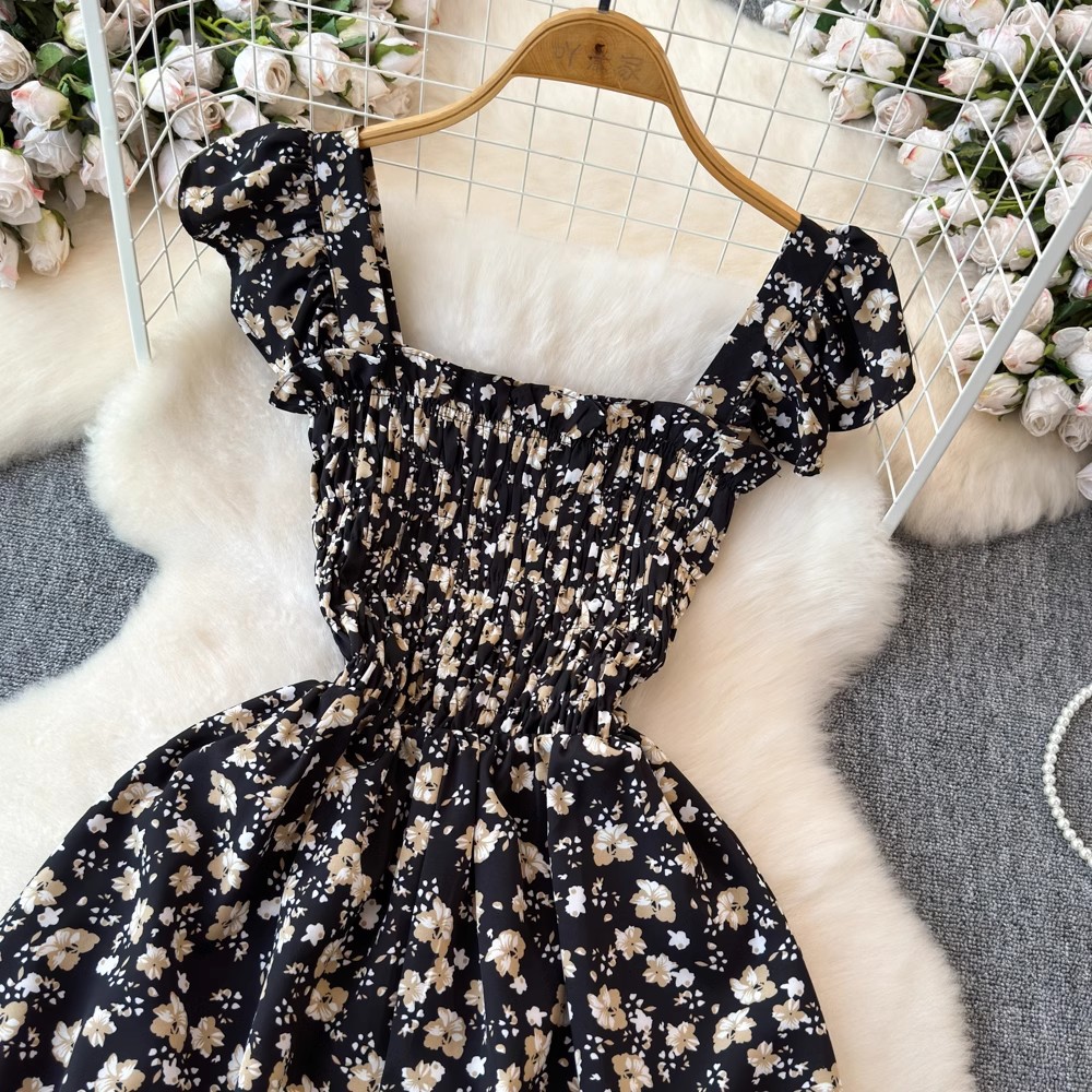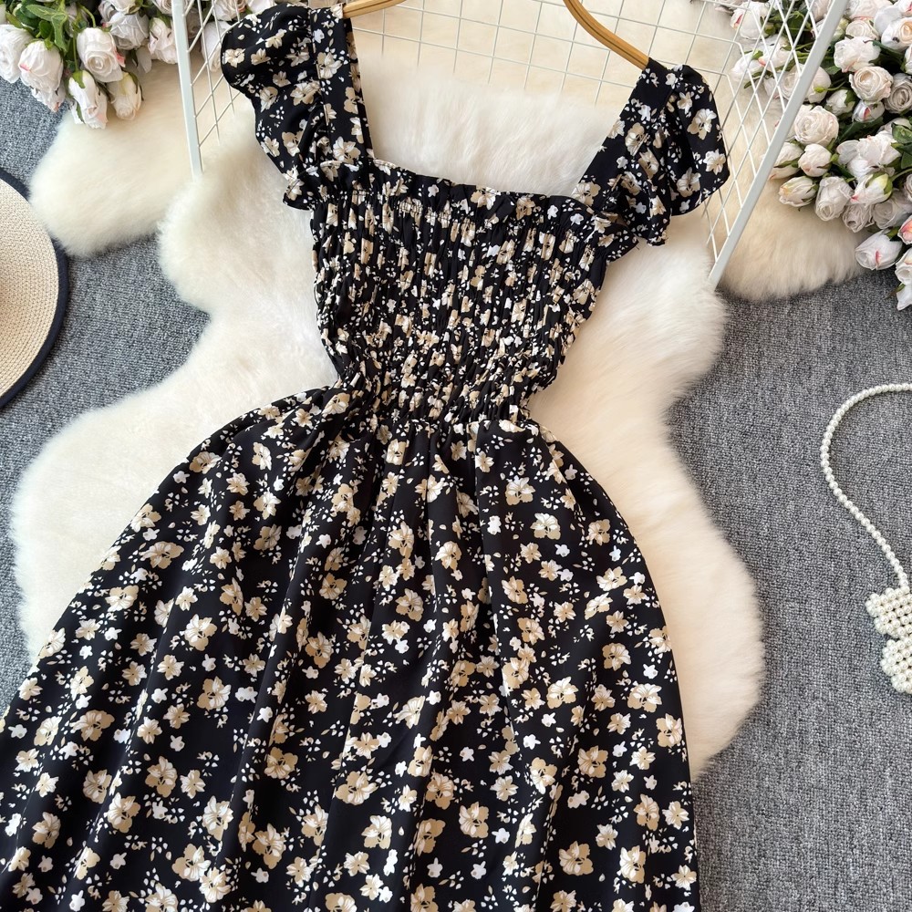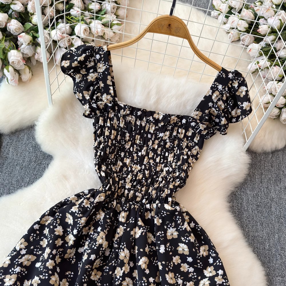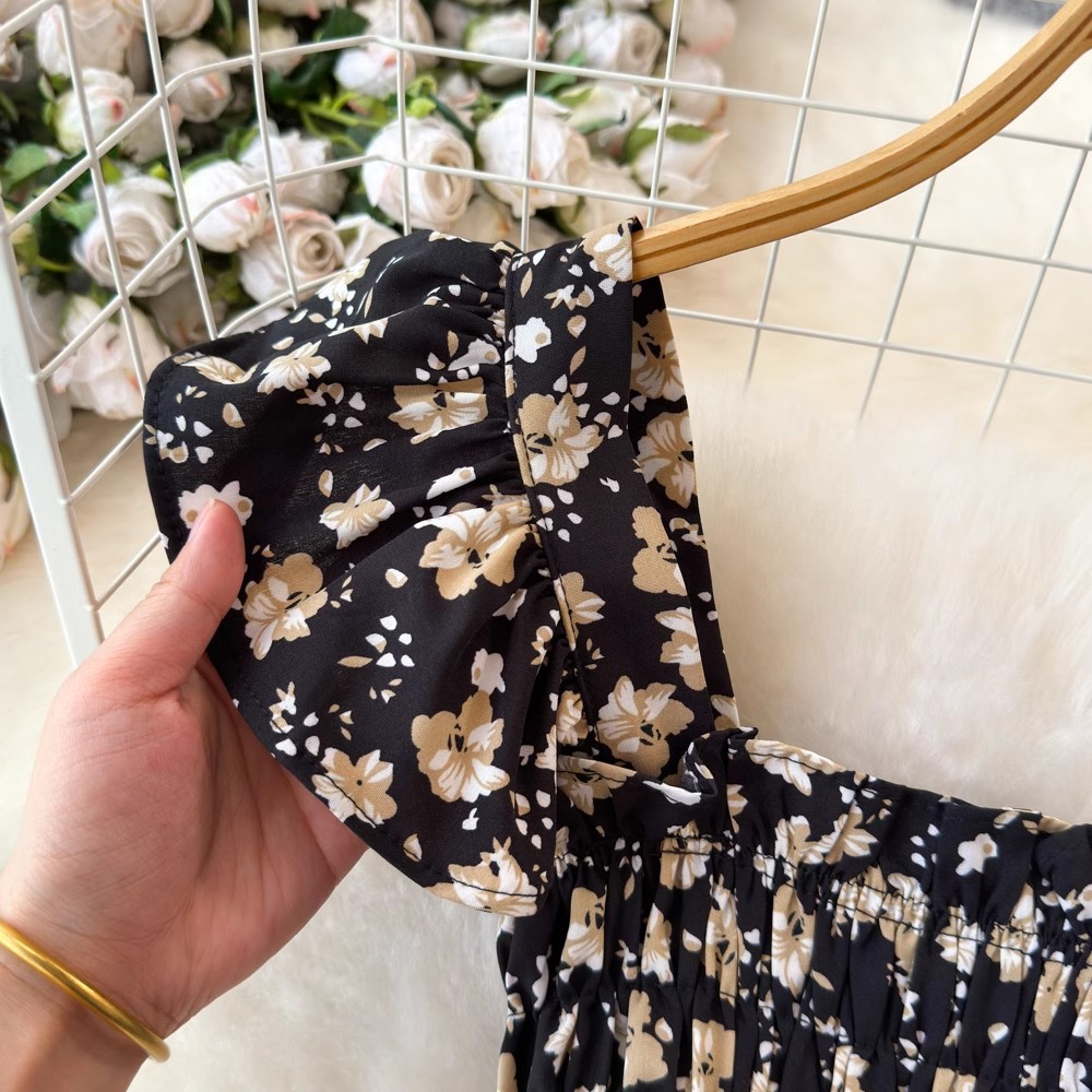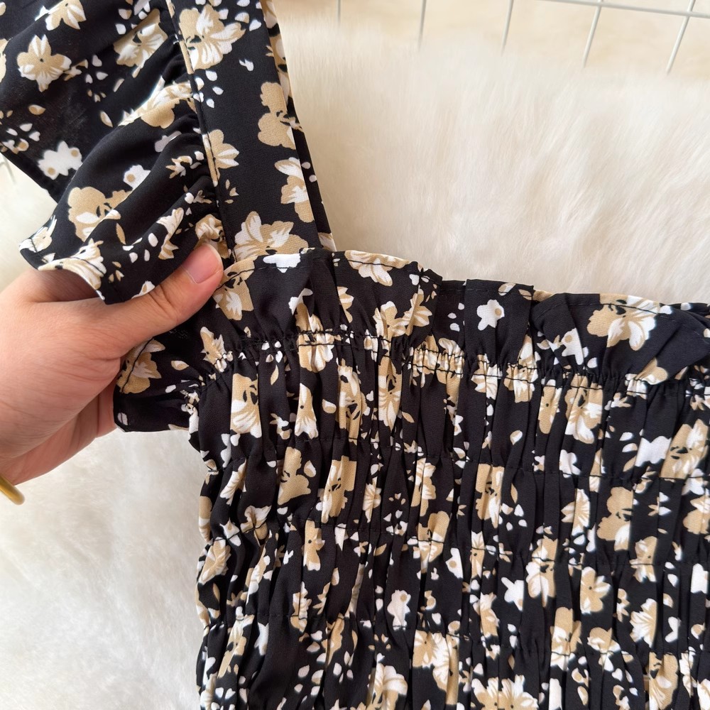 Flying Flying рукава черное цветковое платье женское лето 2024 новый продвинутый смысл талии средней и длинной чайной юбки