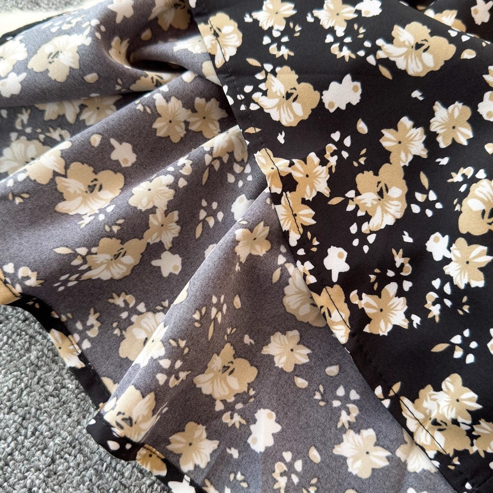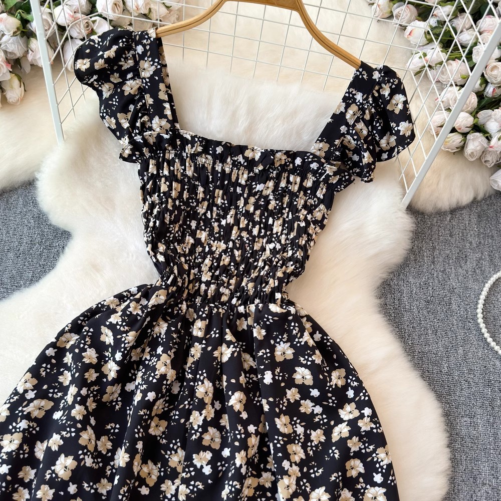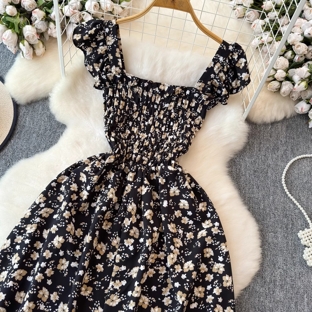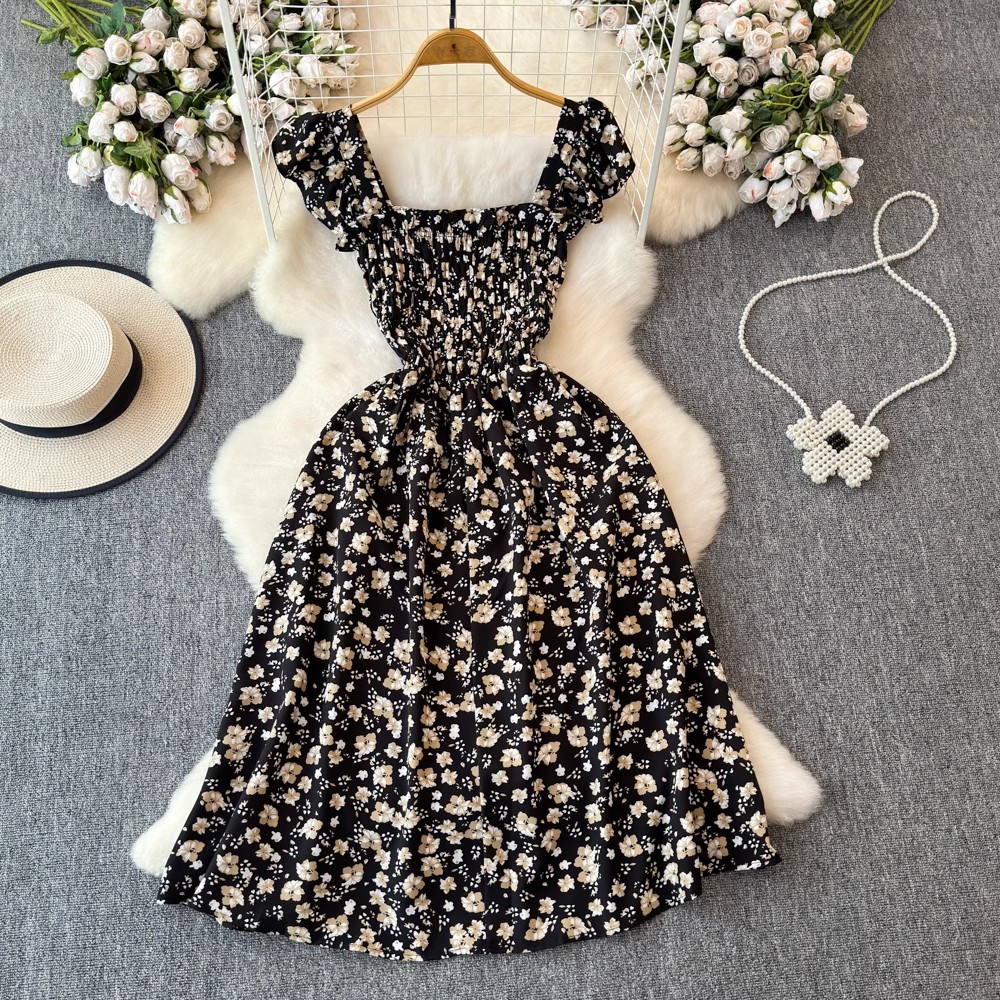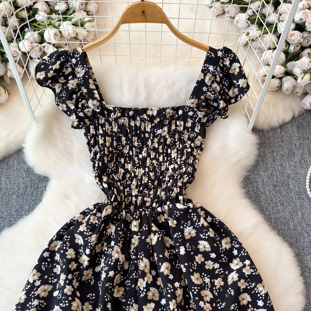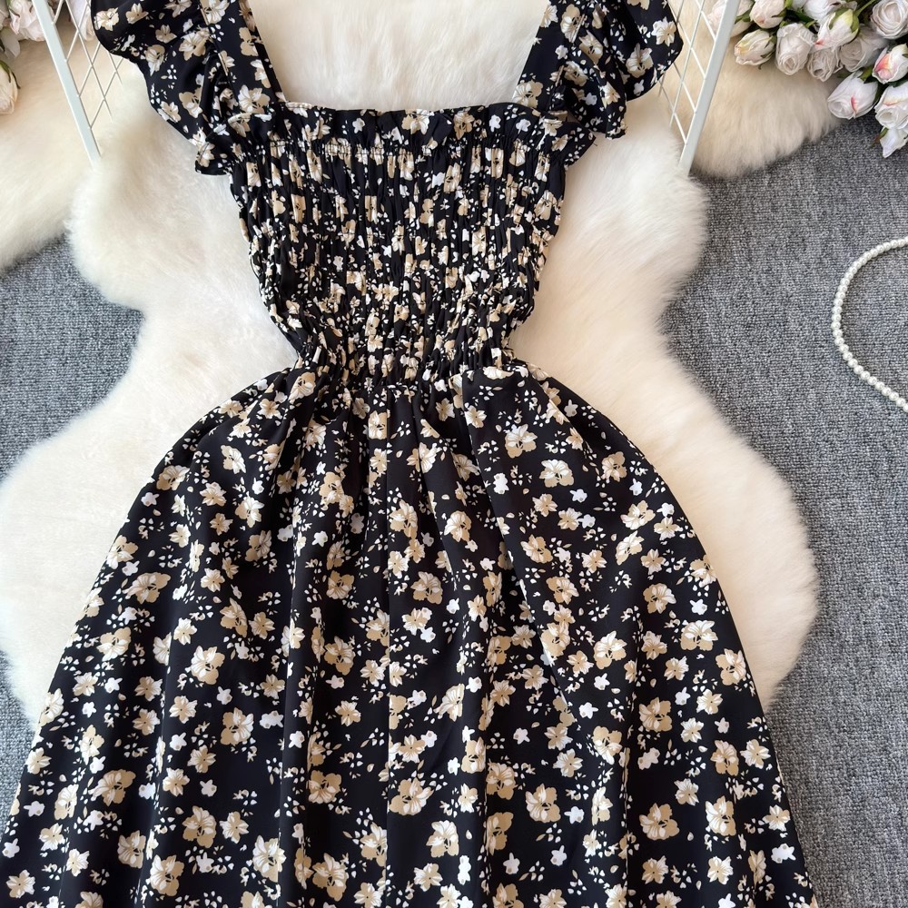 Flying Flying рукава черное цветковое платье женское лето 2024 новый продвинутый смысл талии средней и длинной чайной юбки
