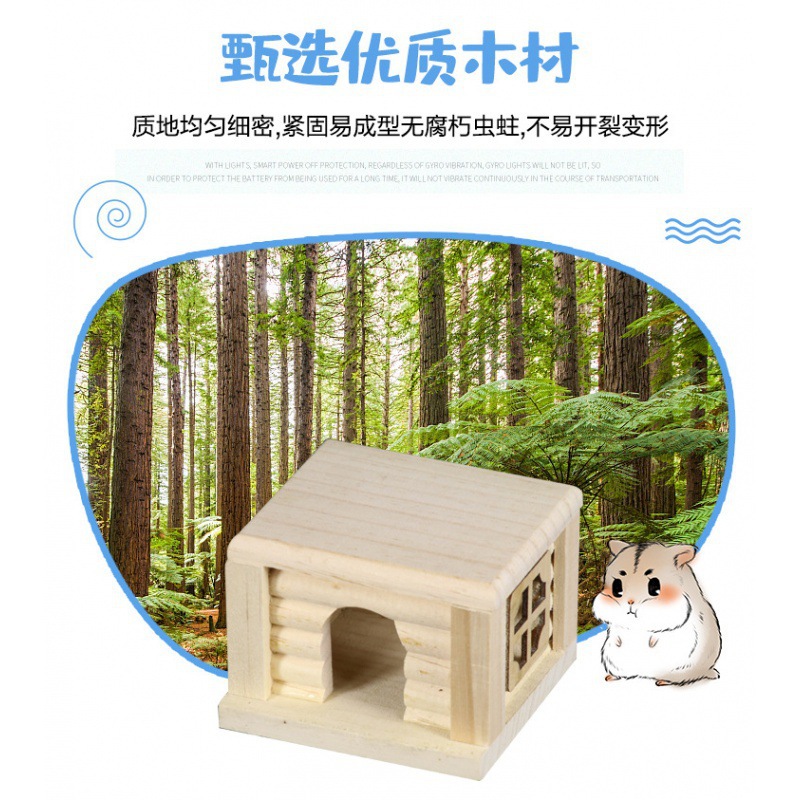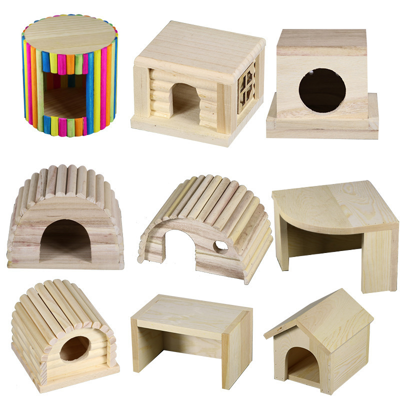 Спиральный деревянный домик (большой); Большой дом из половины бревна (большой); Деревянный домик НС44 (большой); Деревянный домик Радуга (большой); Деревянный домик Радуга (маленький); Прямоугольный открытый деревянный дом (средний); Деревянный домик-двухсекционный для хомяка (маленький); Арочный деревянный домик для спальни (маленький); Кабина с плоской крышей (маленькая); Дом-разделение с круглой аркой (малый); Двухэтажный деревянный дом с синей крышей (в центре)