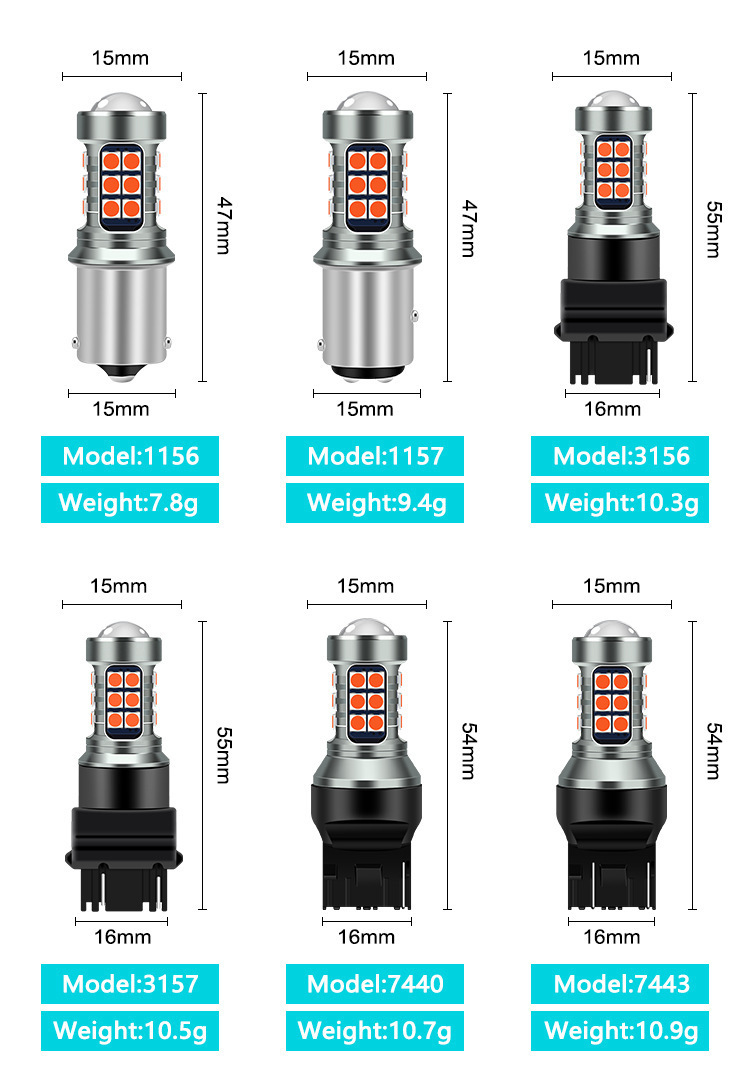 1157 всегда включен; 1156 всегда включен; 7443; T15; 3156; 3157; 7440