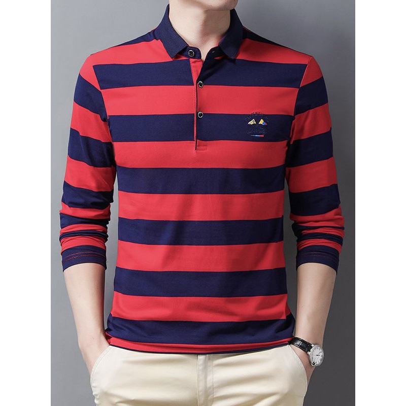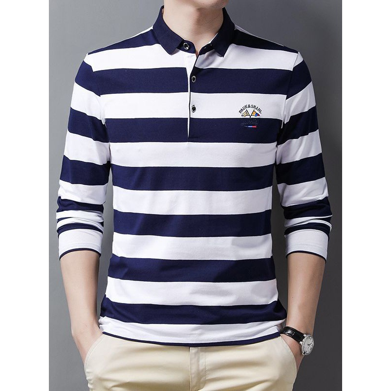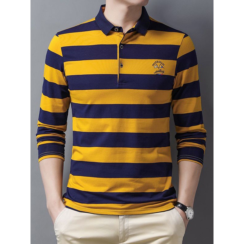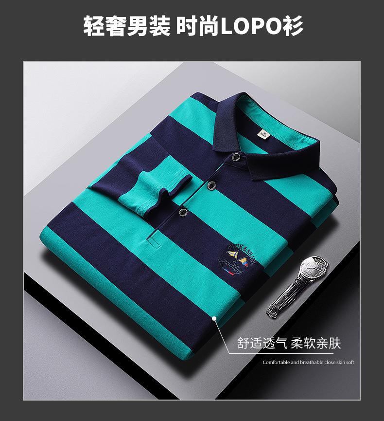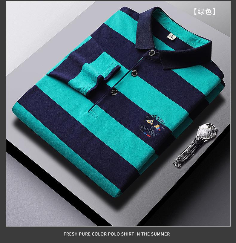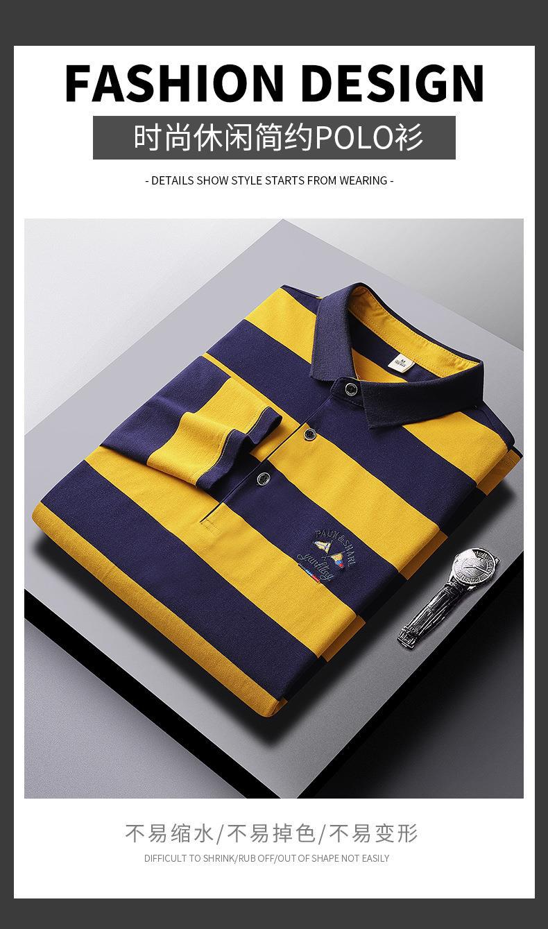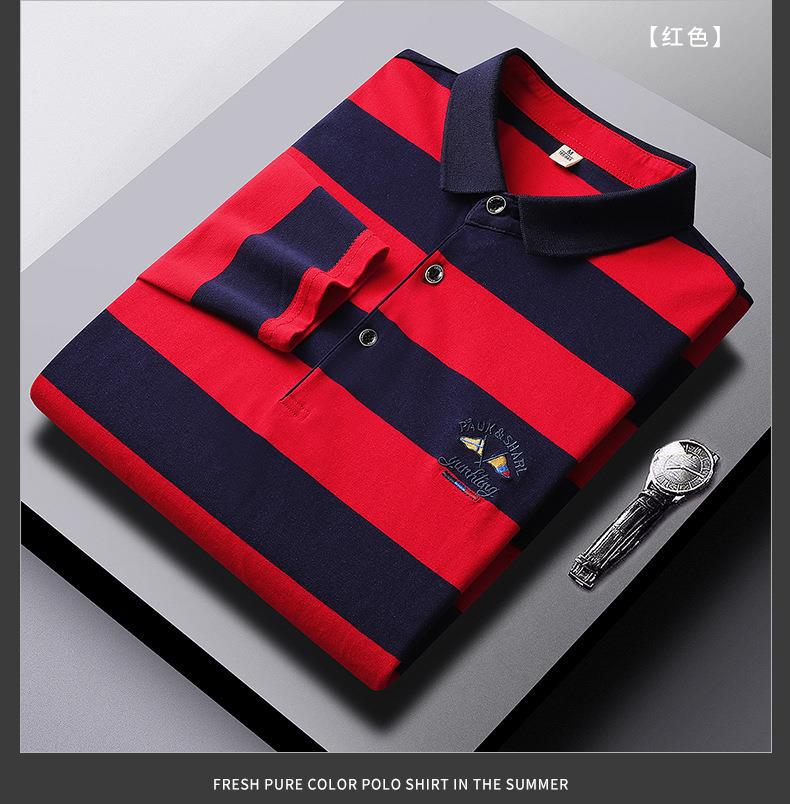 Вышитая хлопчатобумажная полоска рубашка POLOO с длинными рукавами мужской легкий бизнес эластичный отворот футболка мужской папа