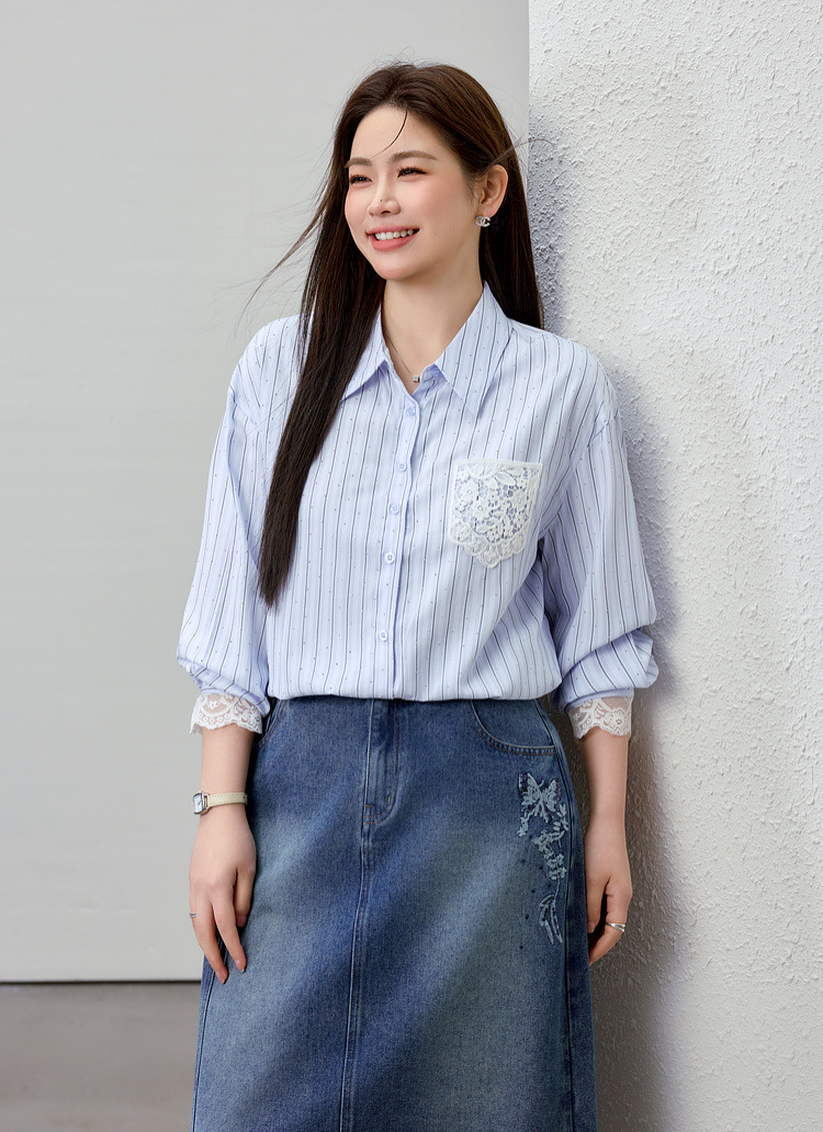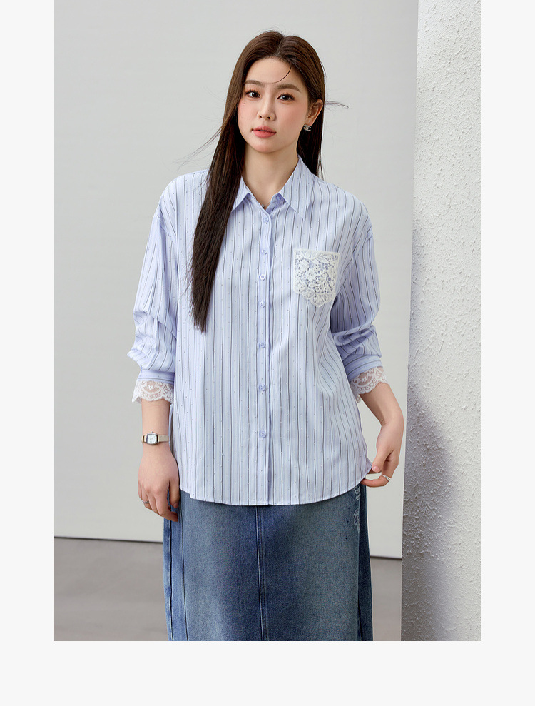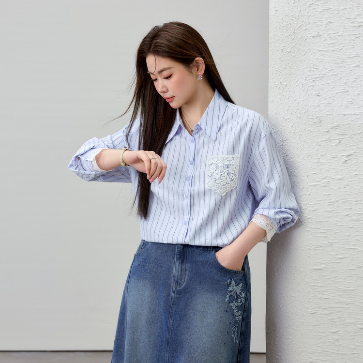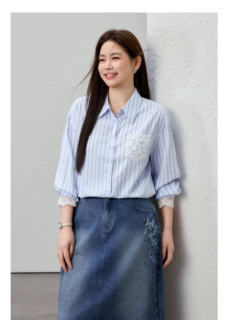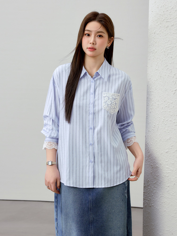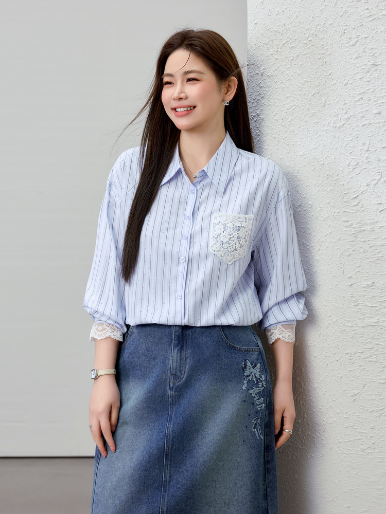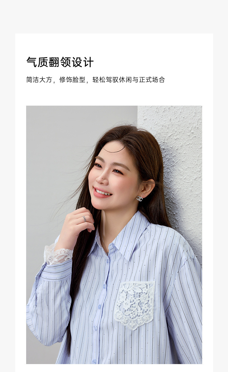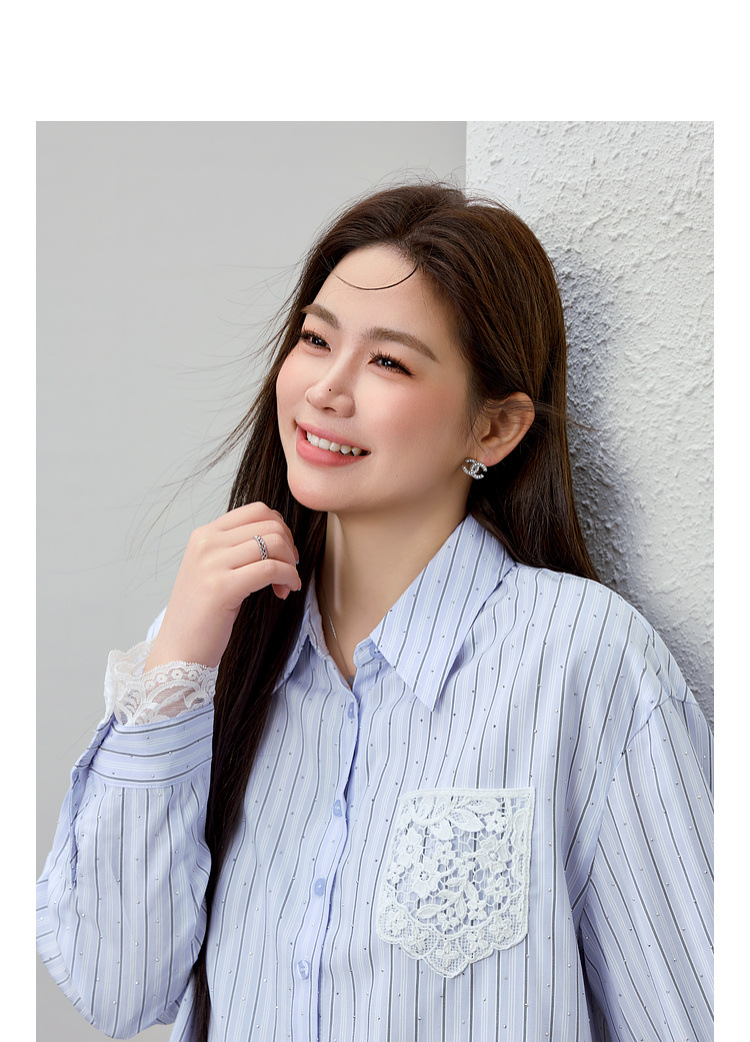 [Слабая дикая пробка в полоску с горячим бриллиантом рубашка] Полосатый большой размер женский толстый mm2025 весенний новый