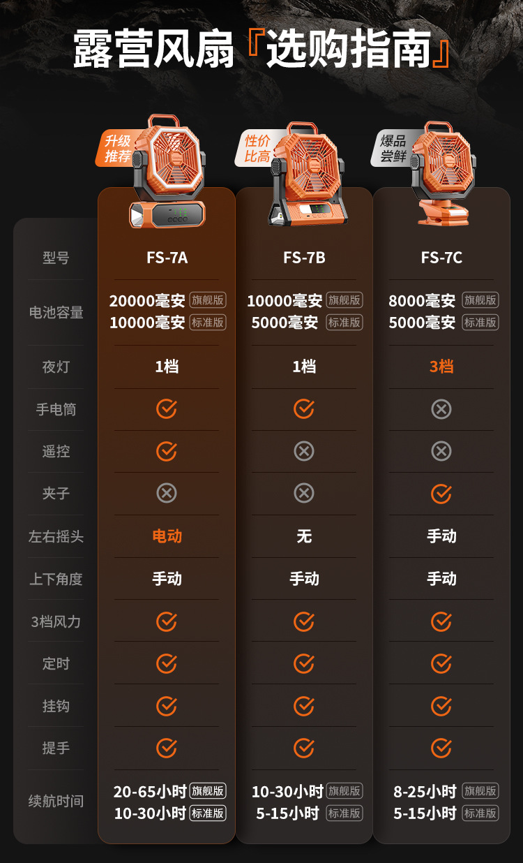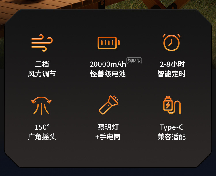 USB-зарядка + 3 уровня мощности ветра + 3 уровня освещения; USB-зарядка + 3 уровня мощности ветра + 3 уровня освещения.; 3 уровня мощности ветра + фонарик/свет + крючок для ручки + зарядка через USB; 3 уровня мощности ветра + фонарик/свет + крючок для ручки + зарядка через USB.; Сверхдлительное время автономной работы + зарядка мобильного телефона + освещение/фонарик + интеллектуальный пульт дистанционного управления + левая и правая качающаяся головка + крючок для ручки + быстрая зарядка через USB; Длительное время автономной работы + зарядка мобильного телефона + освещение/фонарик + интеллектуальный пульт дистанционного управления + левая и правая качающаяся головка + крючок для ручки + быстрая зарядка через USB.