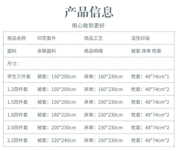Комплект из трех предметов простыни длиной 1,2 м [пододеяльник 150*200 см, простыня 160*230 см, наволочка 1]; Комплект из четырех предметов простыни длиной 1,5 м [пододеяльник 150*200 см, простыня 200*230 см, наволочка 2]; Комплект из четырех предметов простыни длиной 1,8 м [пододеяльник 180*220 см, простыня 230*230 см, наволочка 2]; Комплект из четырех предметов простыни длиной 2,0 м [пододеяльник 200*230 см, простыня 230*230 см, наволочка 2]; Односпальное пододеяльник 150х200см.; Односпальное пододеяльник 180х220см.; Одно пододеяльник размером 200X230 см.