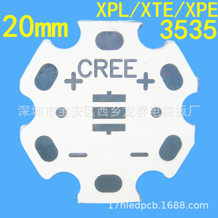 导热2.0W/MK高导铝基板CREE3535科锐, 可用10W功率灯珠光源 ,高导无铅铝基板最大直径φ20±0.5mm(50拼版),T厚度2.0±0.1mm。