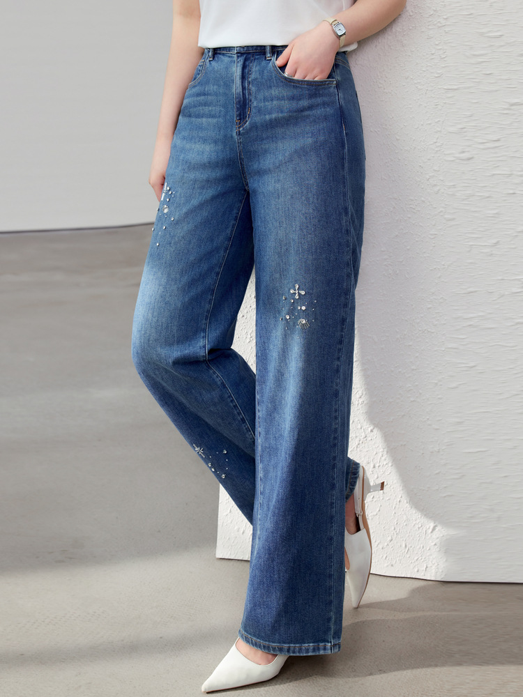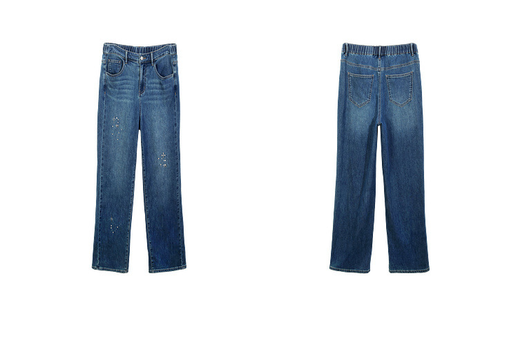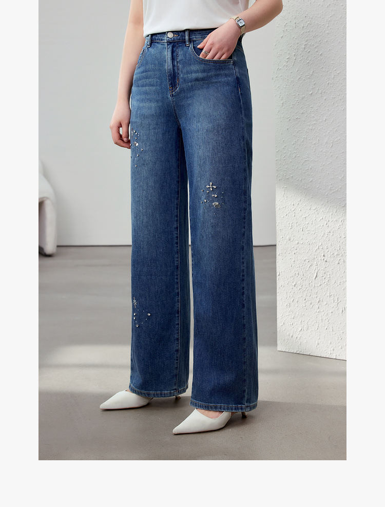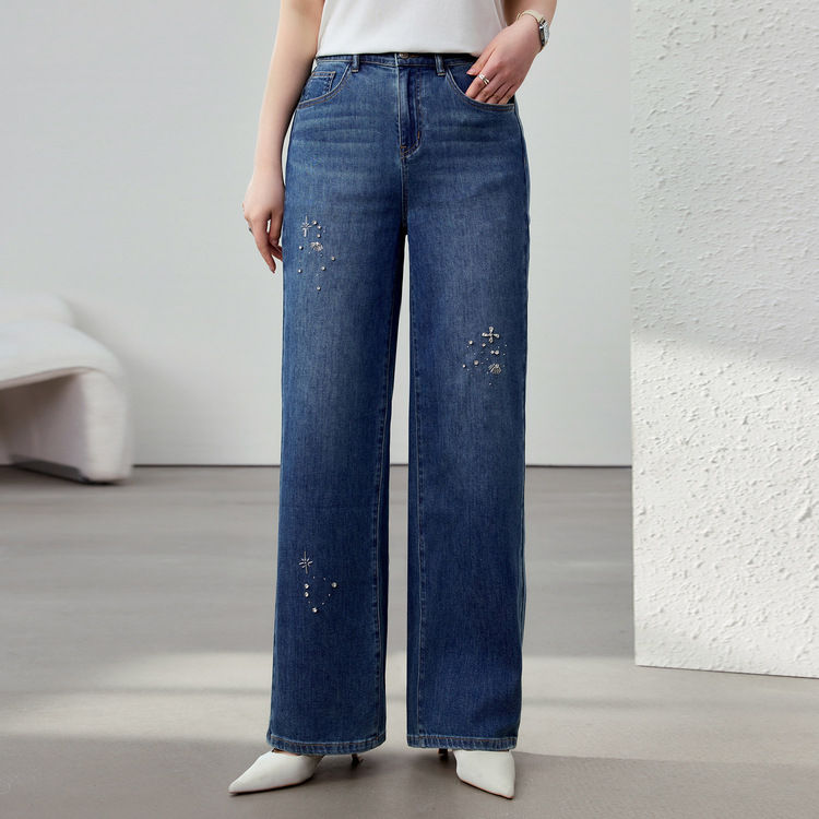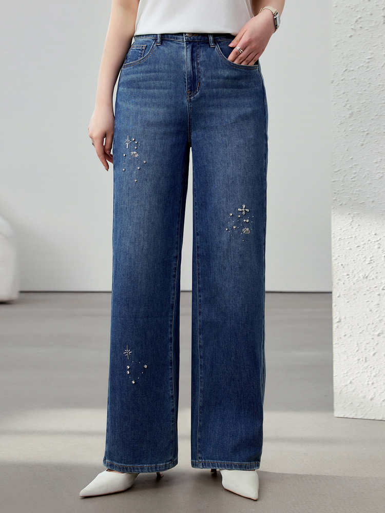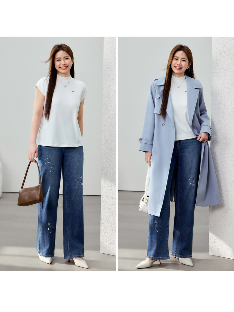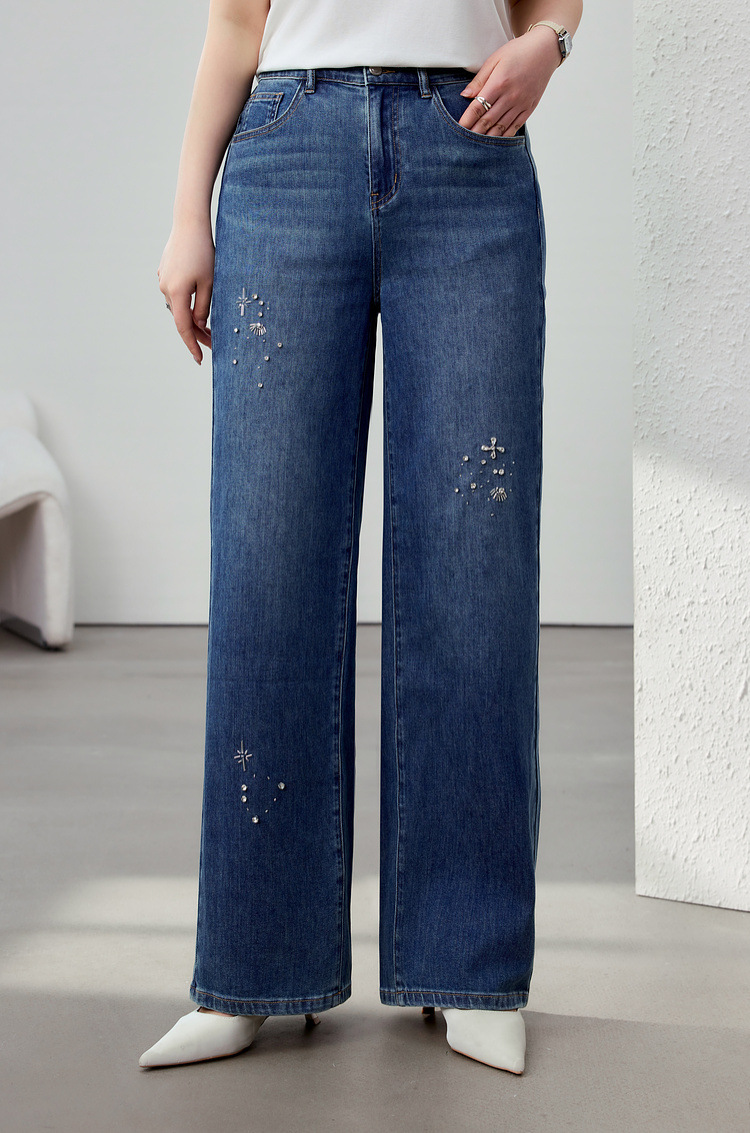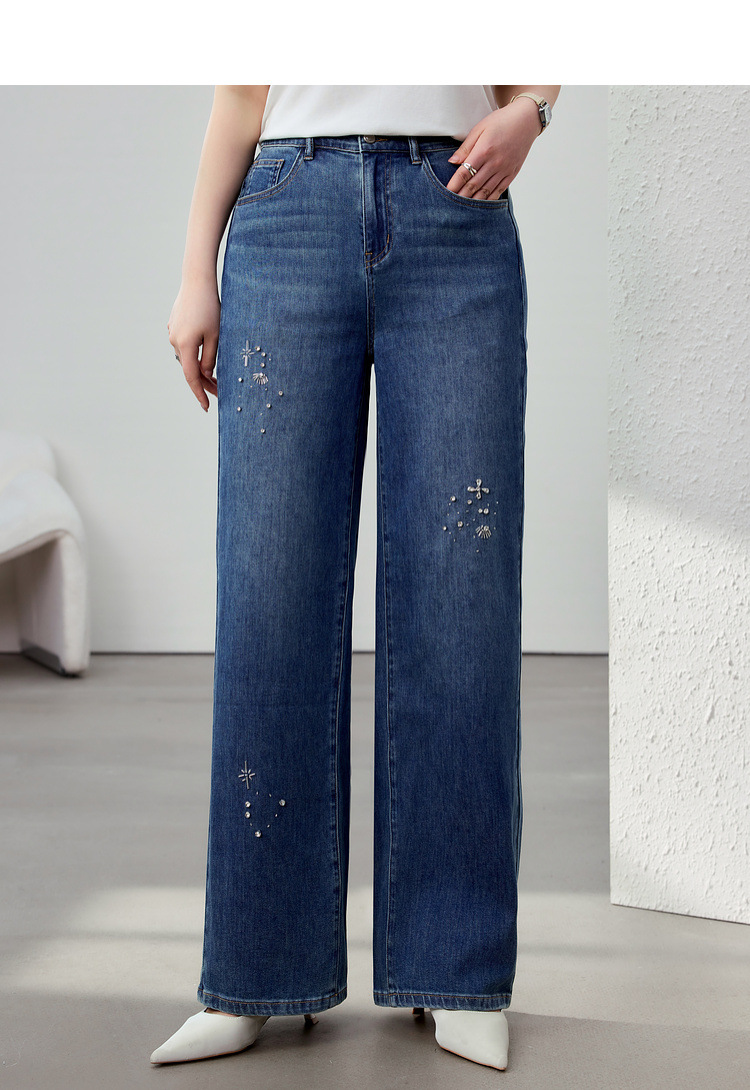 [Модные бусы с бисером, покрывающий мясо, тонкие и широкие джинсы] Funny Show большой размер женский толстый мм весенний новый