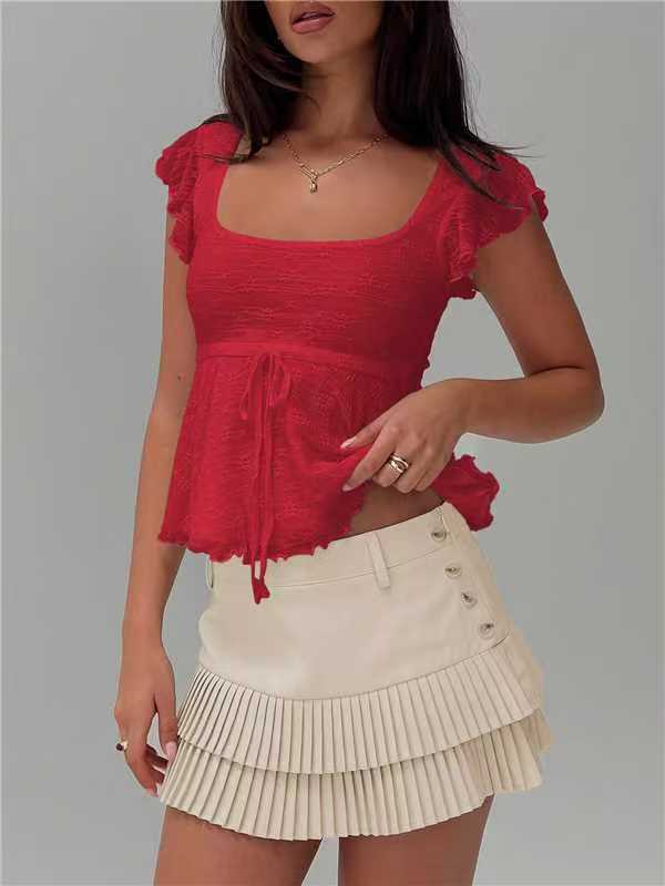 Amazon AliExpress Европейский и Американский пузырь с морщинистым деревянным ухом с наполовину рукавами Короткий топ весной и летом тонкая футболка с короткими рукавами A