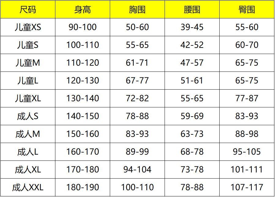 Детский XS (90-100); Дети С (100-110); Дети М (110-120); Дети Л (120-130); Детский XL (130-140)