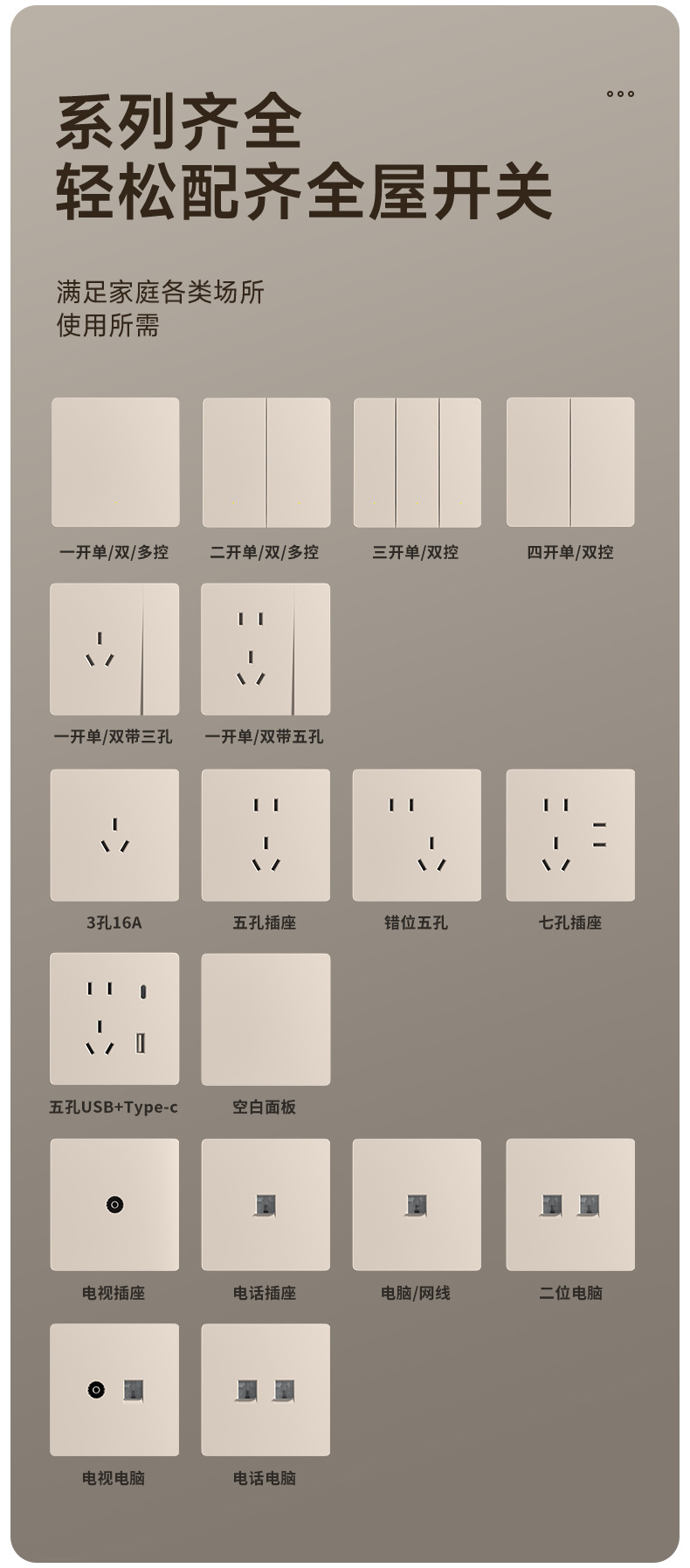 Одна открытая версия с нулевым огнем; Двухоткрытая нулевая версия; Три открытых нулевых огня версии; Четыре открытых нулевых огня; Одиночная огневая версия; Двухоткрытая однопожарная версия; Три открытых одиночных огня.; Розетка на 16А с тремя отверстиями; пять дырок; Неправильно установленная розетка с пятью отверстиями; семь лунок; Одно отверстие, пять отверстий, двойное управление.; телевизор; телефон; компьютер; Компьютер (категория 6); телефонный компьютер; Телефонный компьютер (шестая категория); телевизионный компьютер; Телевизионный компьютер (шестая категория); Двойные компьютеры; Двойные компьютеры (категория шесть); доска; Пять отверстий с USB+Type-C 2.1A; Ремонт кассет