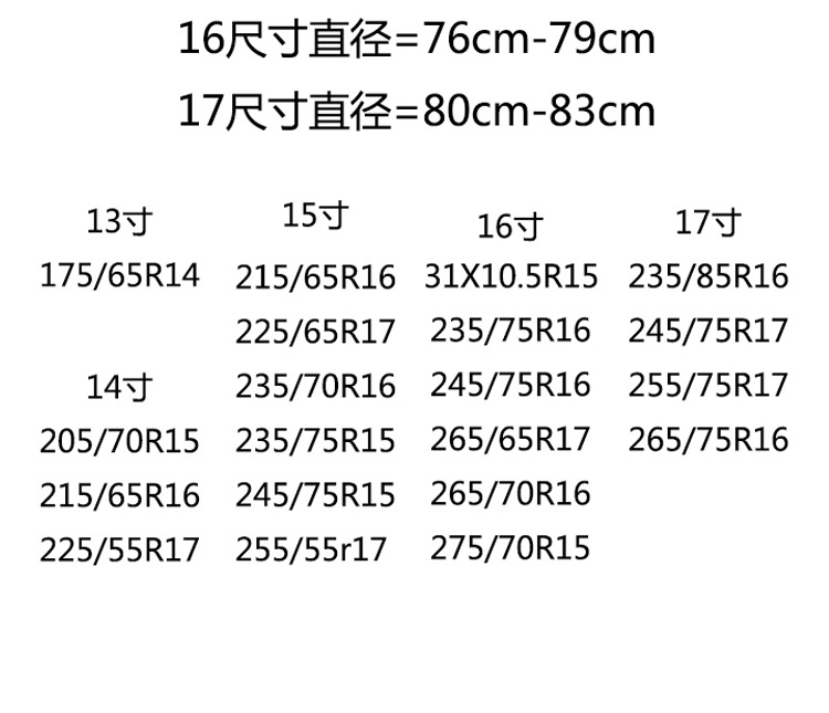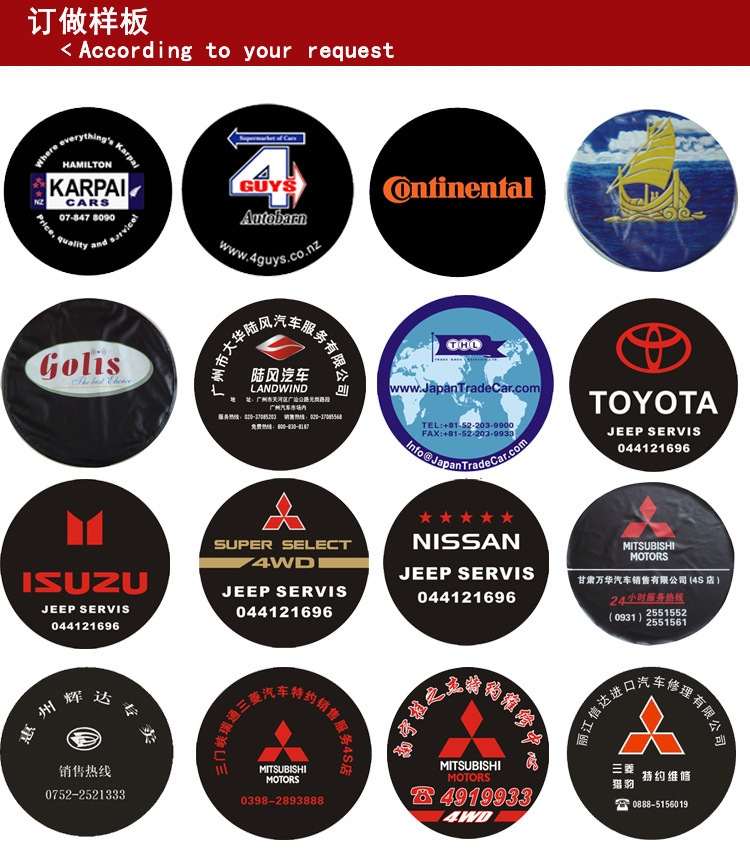 另外图案本店还有很多,比如本田CRV,ISUZU,PAJERO,PRADO,4WD,越野E族丰田,铃木,悍马,吉普,三菱,众泰,猎豹等! 工厂直销 支持各类商业广告LOGO定制(拍下请留言型号和尺寸)谢谢!定制客户自己图案质量没有问题不支持退换!亲们拍下请备注轮胎上的规格235/85R16这样的数字哦,不明白请联系客服,谢谢合作