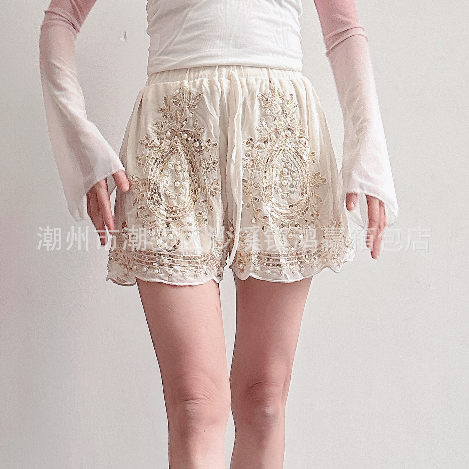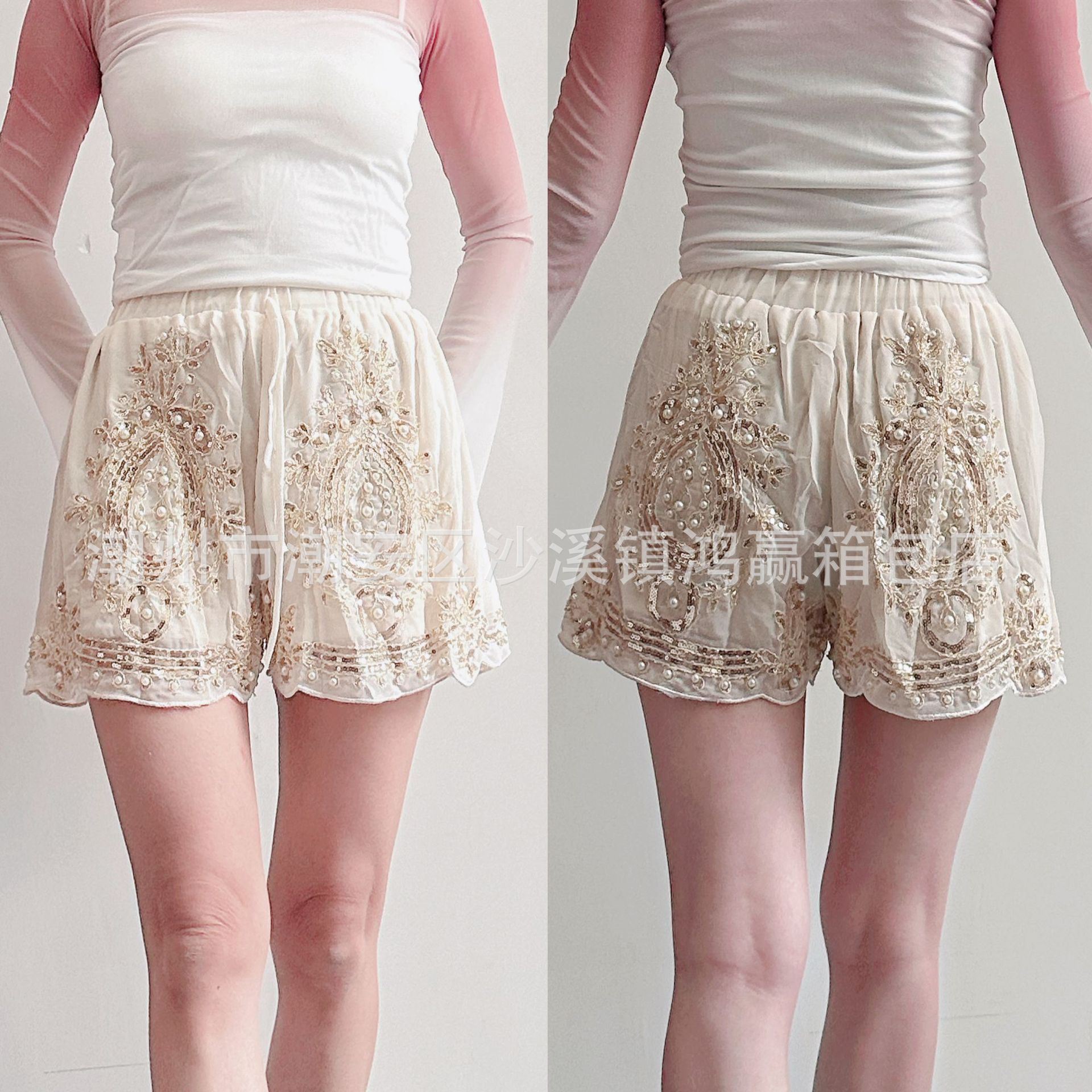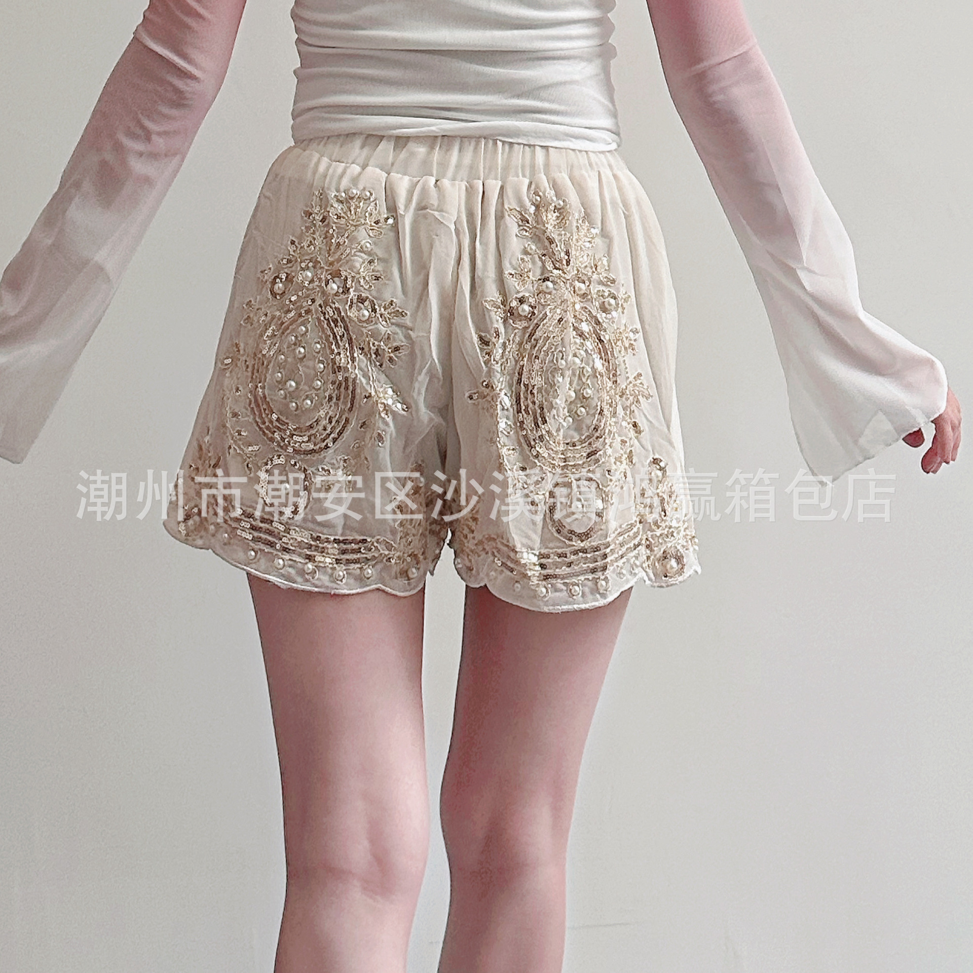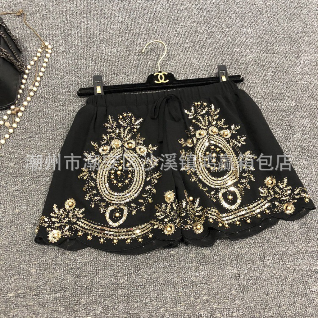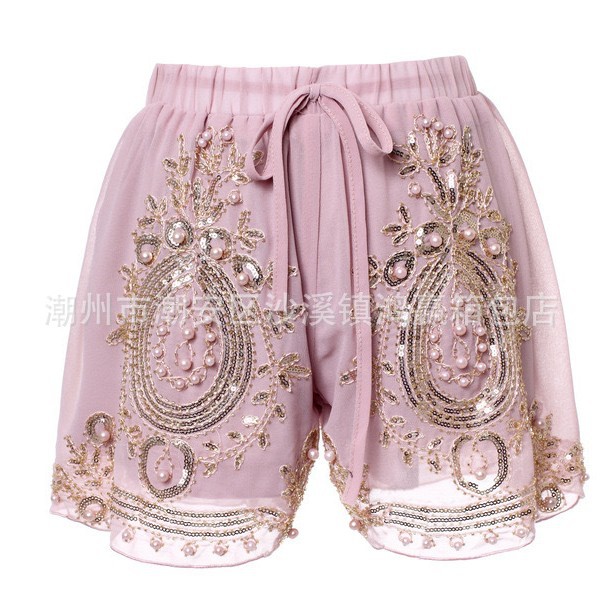 Европейские и американские модные ретро-шорты из шифона с эластичным поясом, широкие брюки с пайетками и бисером для женщин