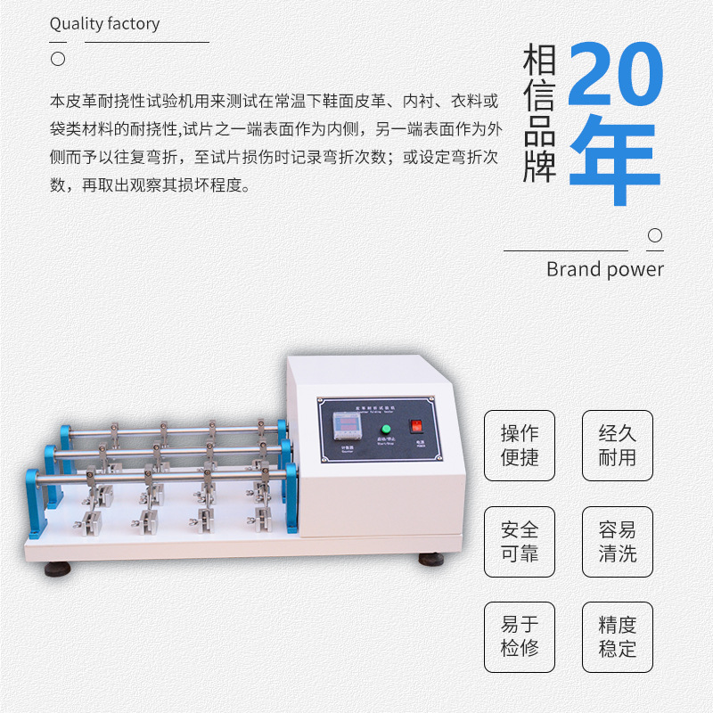 Машина для испытания на сопротивление кожаному складыванию используется для верха обуви из кожи и тонкой кожи (верхняя кожа для обуви, кожа для сумок, кожа для сумок и т. д.).