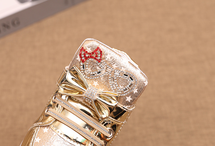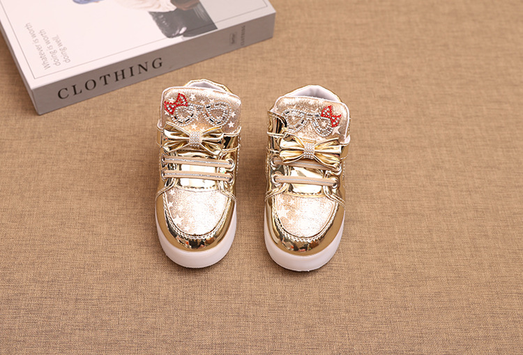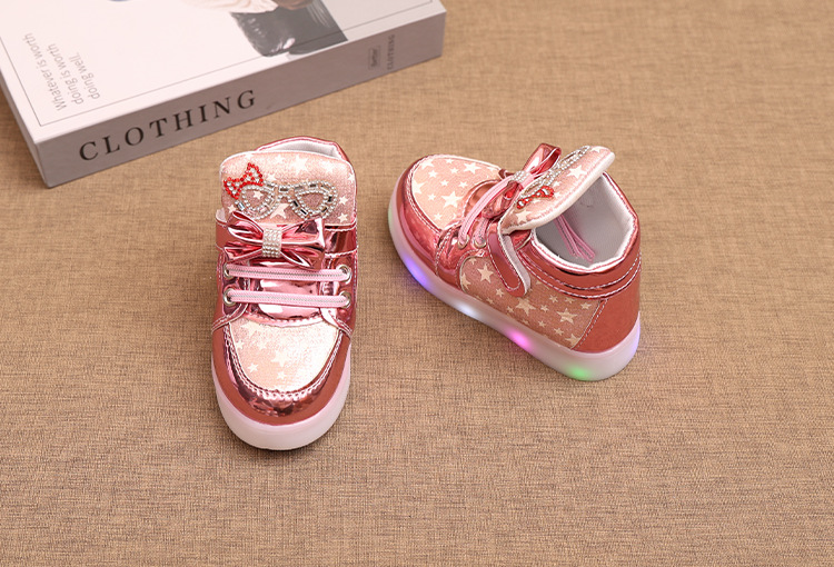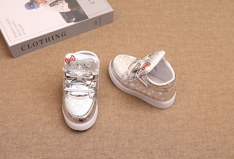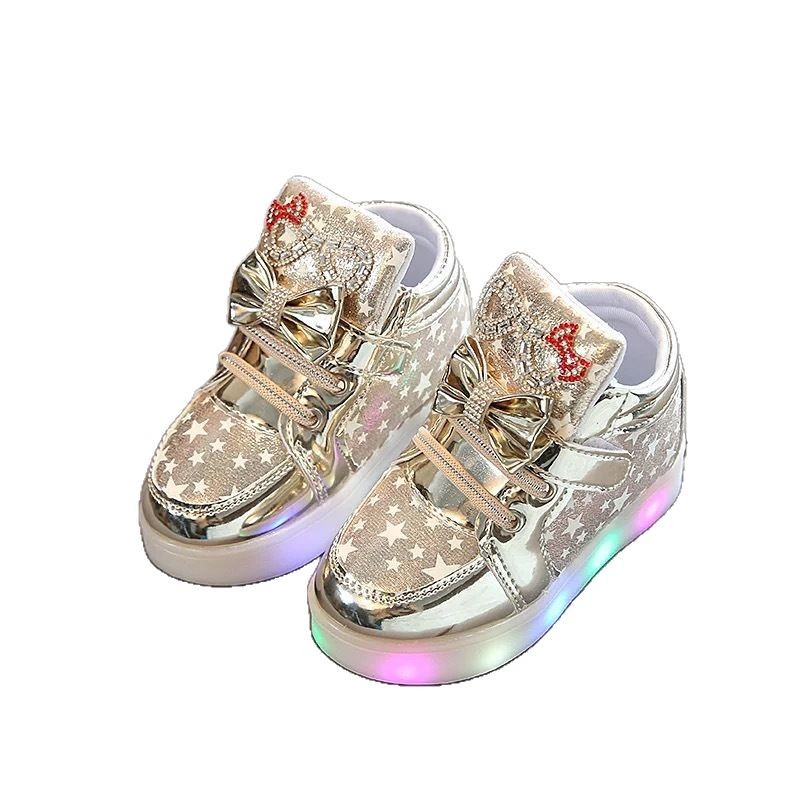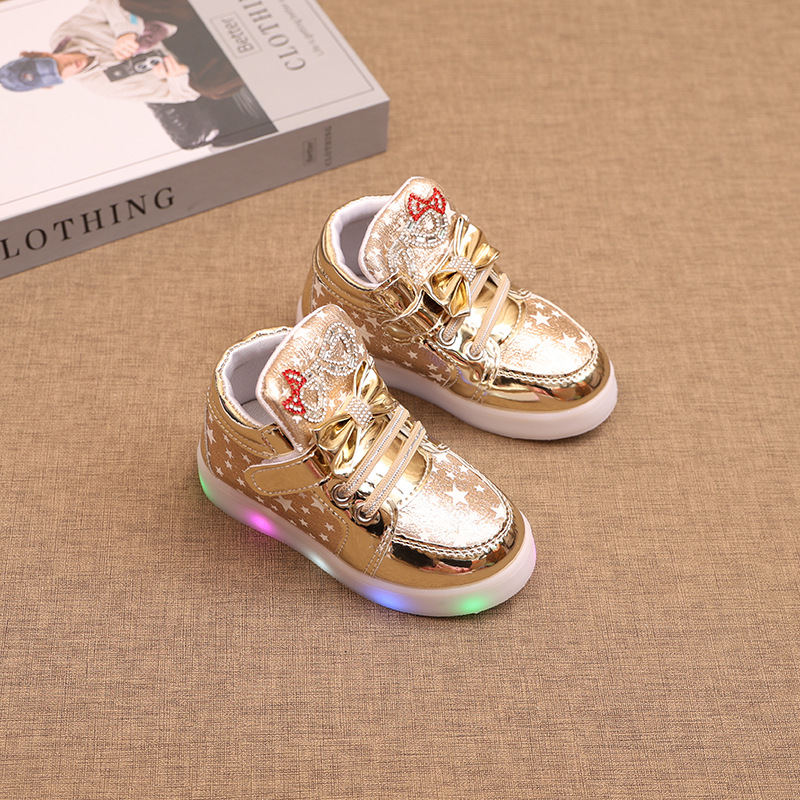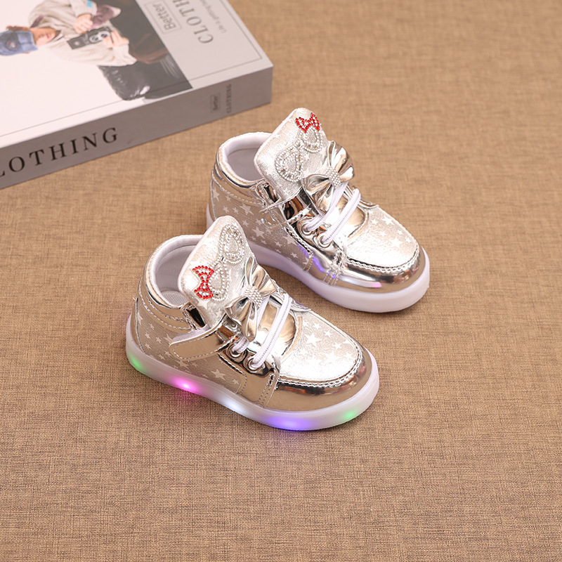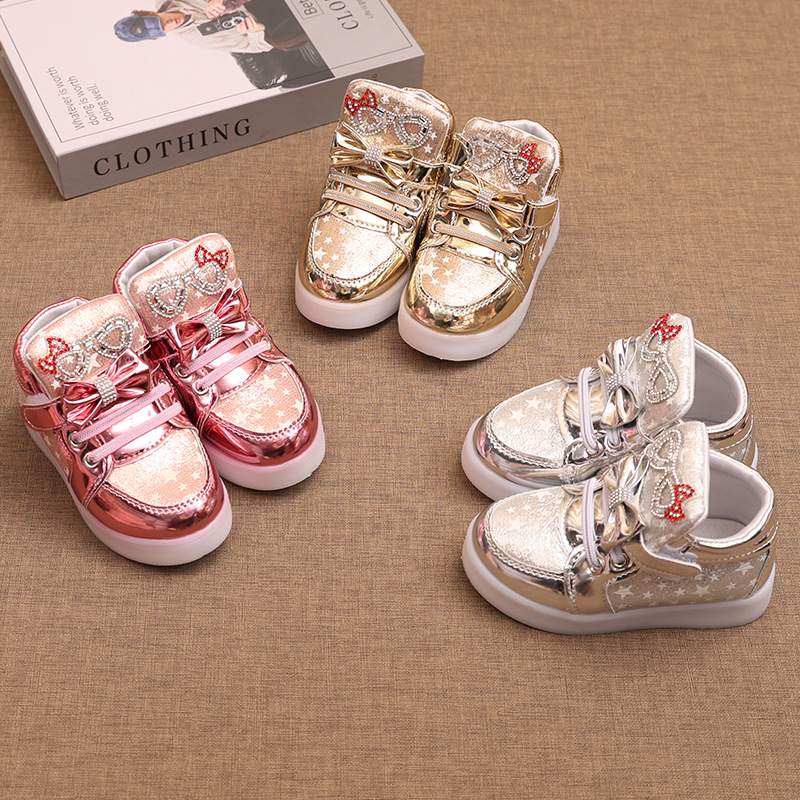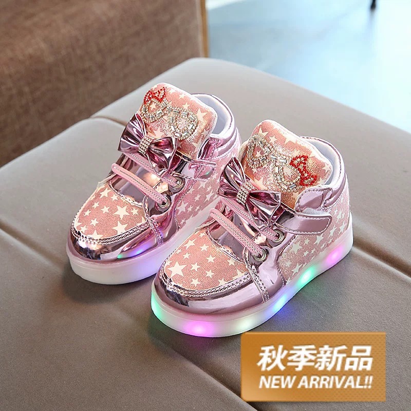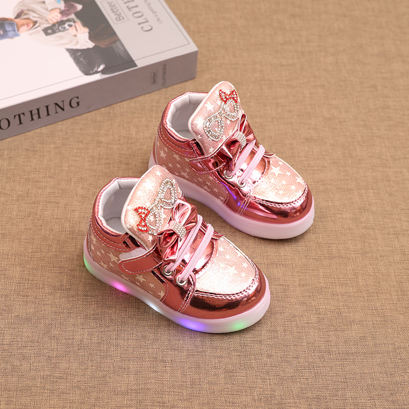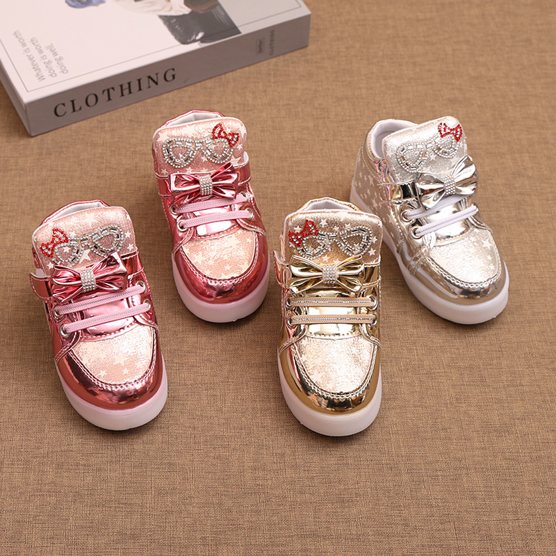 Детские кожаные ботинки с LED подсветкой, милые бантики, весна-осень 2025, яркие бриллианты, модные спортивные туфли для девочек