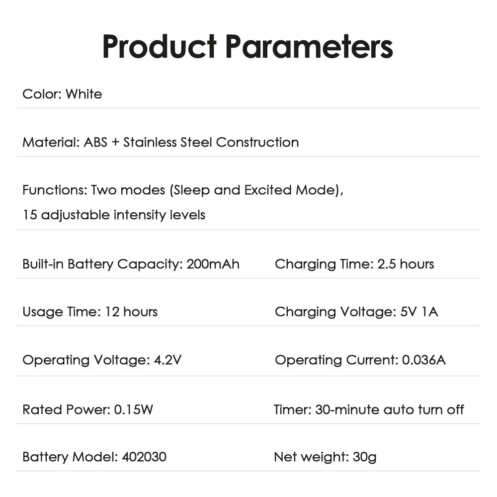 颜色:白色,材质:ABS+不锈钢工艺,两种模式(睡眠和兴奋模式),15个档位调节,内置电池容量:200mAh,充电时间:2.5小时,续航时间:12小时,充电电压:5V1A,工作电压:4.2V,工作电流:0.036A,额定功率:0.15W,30分钟定时功能,电池型号:402030。(注意:开机后15秒内无任何操作,会自动关机。)