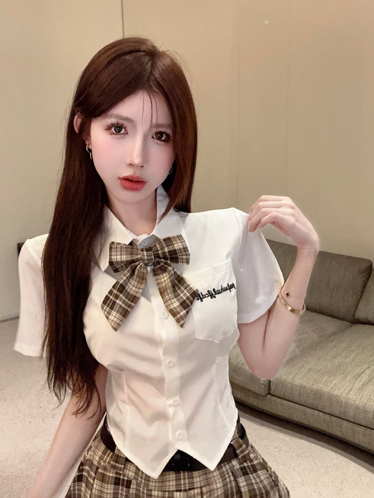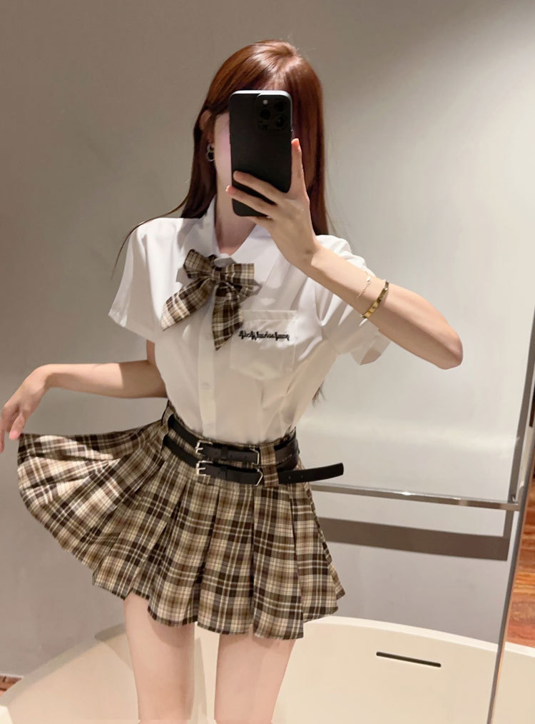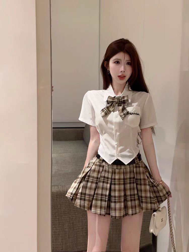 галстук рубашки; клетчатая юбка с высокой талией; рубашка с галстуком + клетчатая юбка с высокой талией
