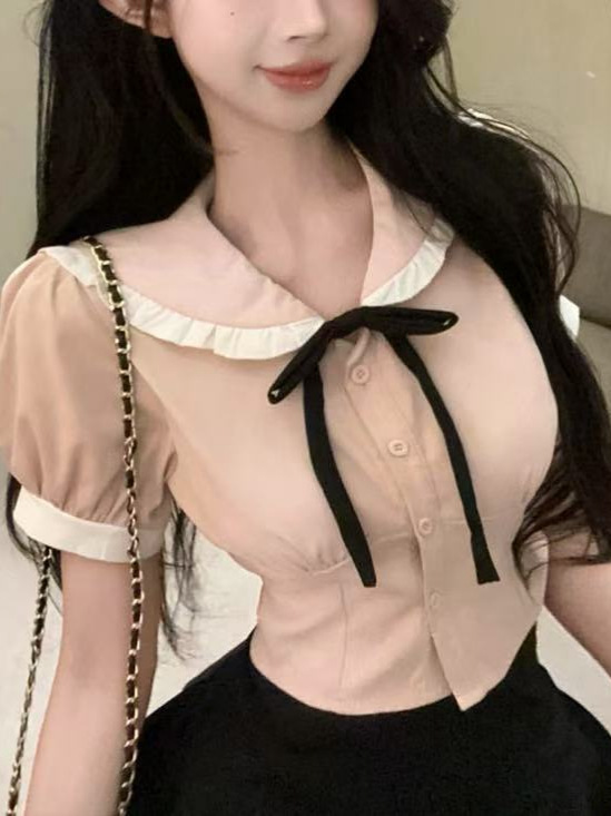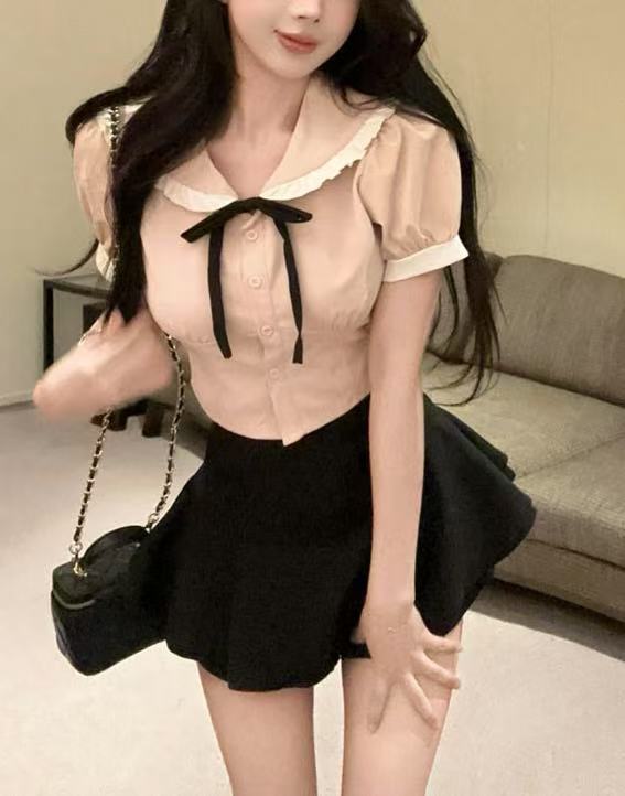 Милый комплект из двух предметов в студенческом стиле для маленьких женщин, нежно-розовая рубашка с короткими рукавами, пышная юбка с высокой талией, брюки, костюм jk