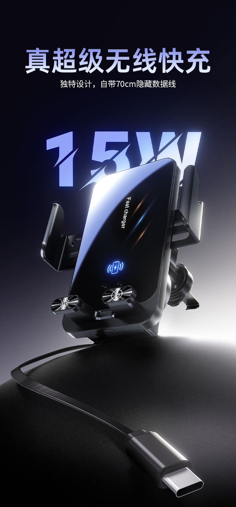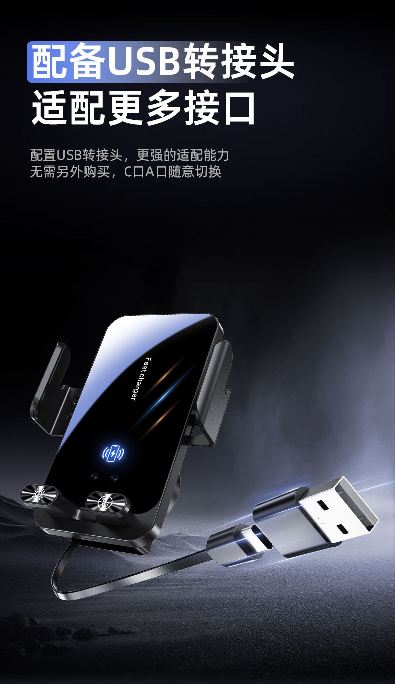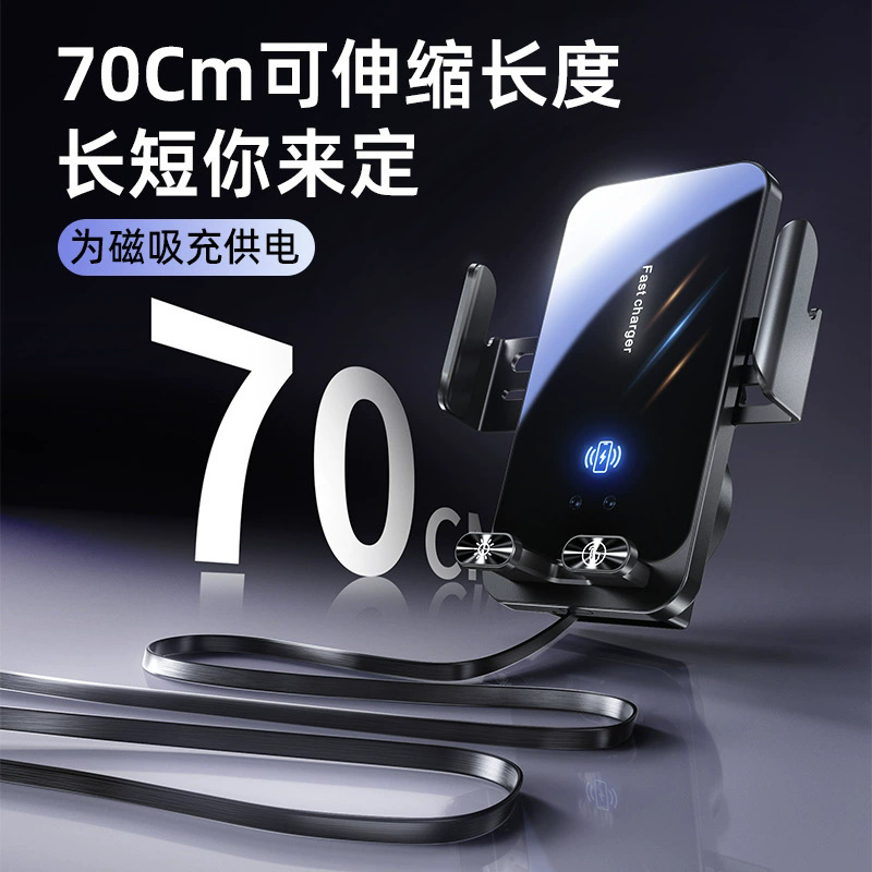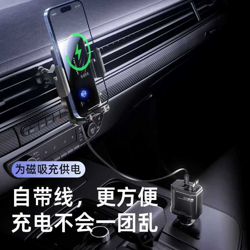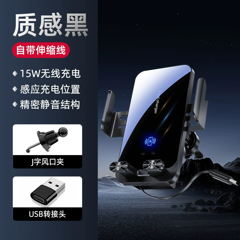 自带线15W无线充手机支架感应电动开合伸缩TP-C线车载手机支架