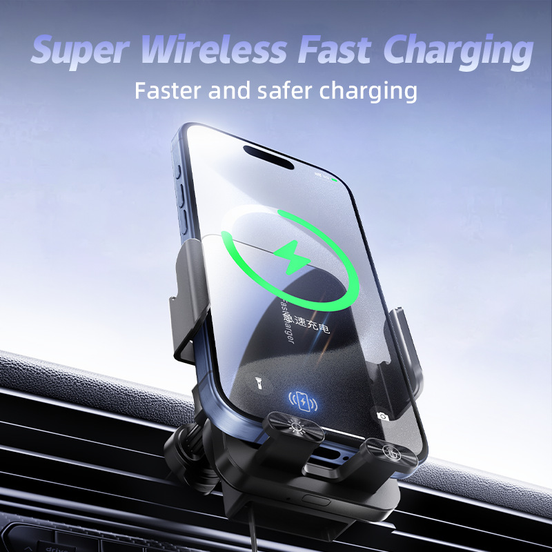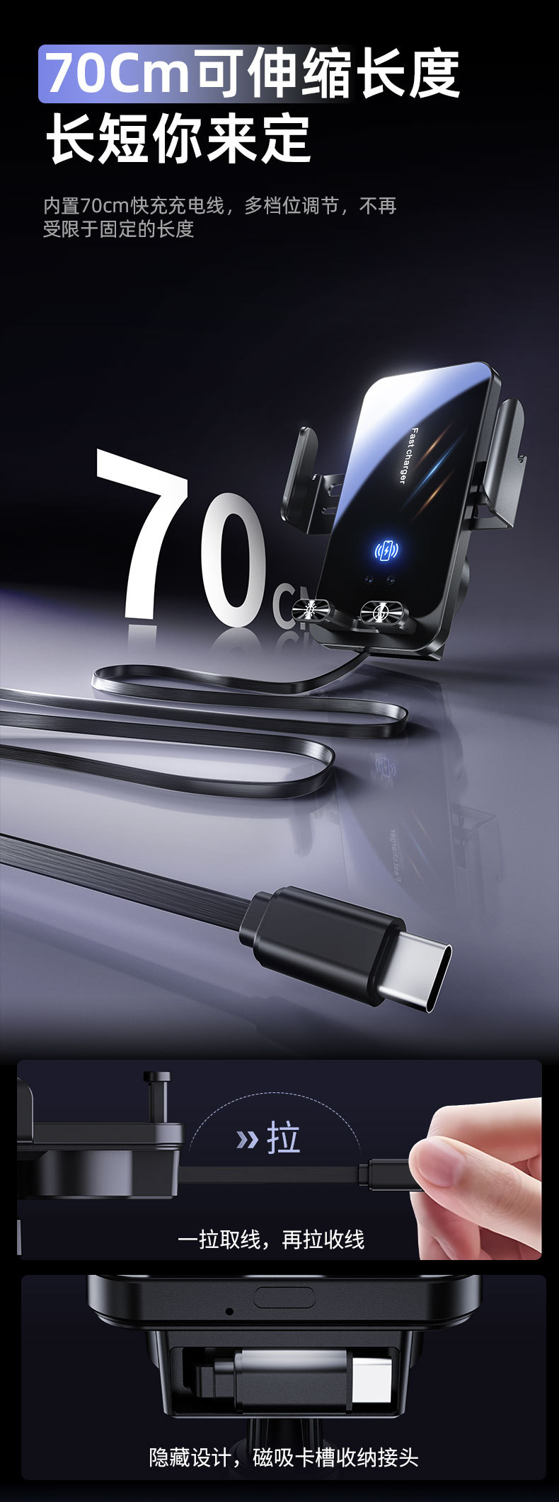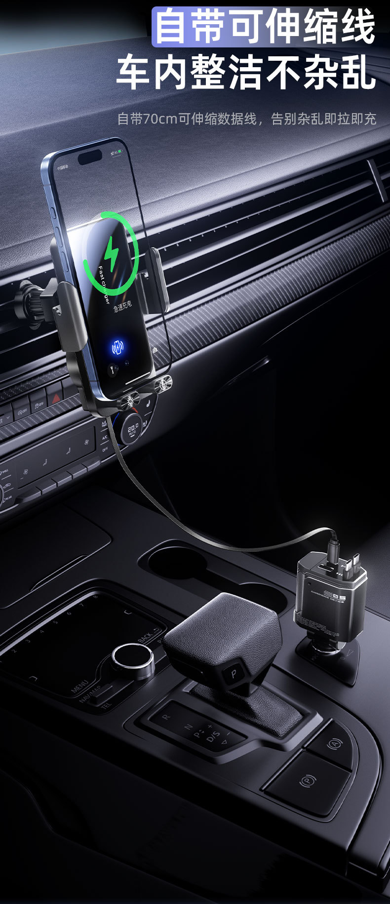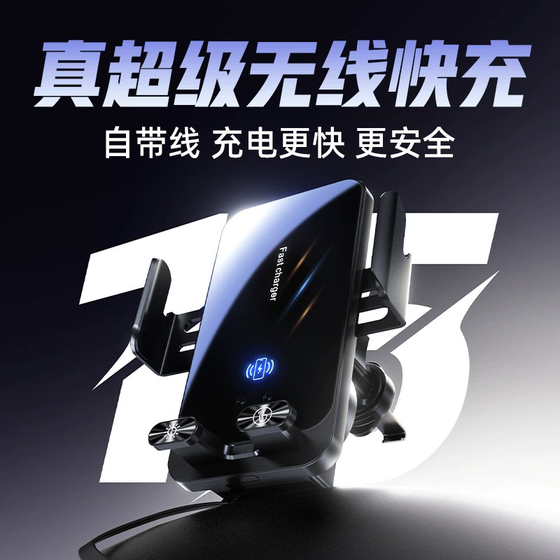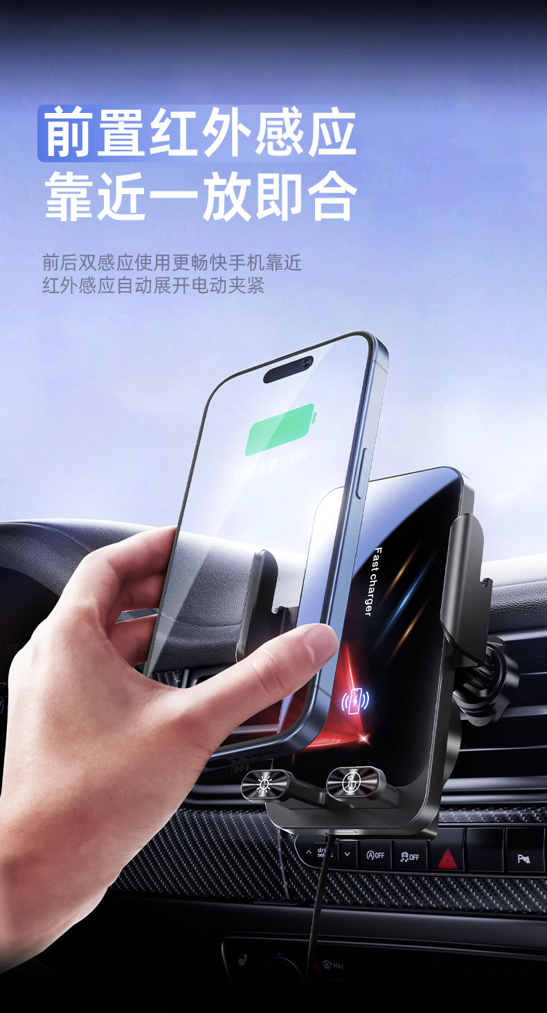 自带线15W无线充手机支架感应电动开合伸缩TP-C线车载手机支架