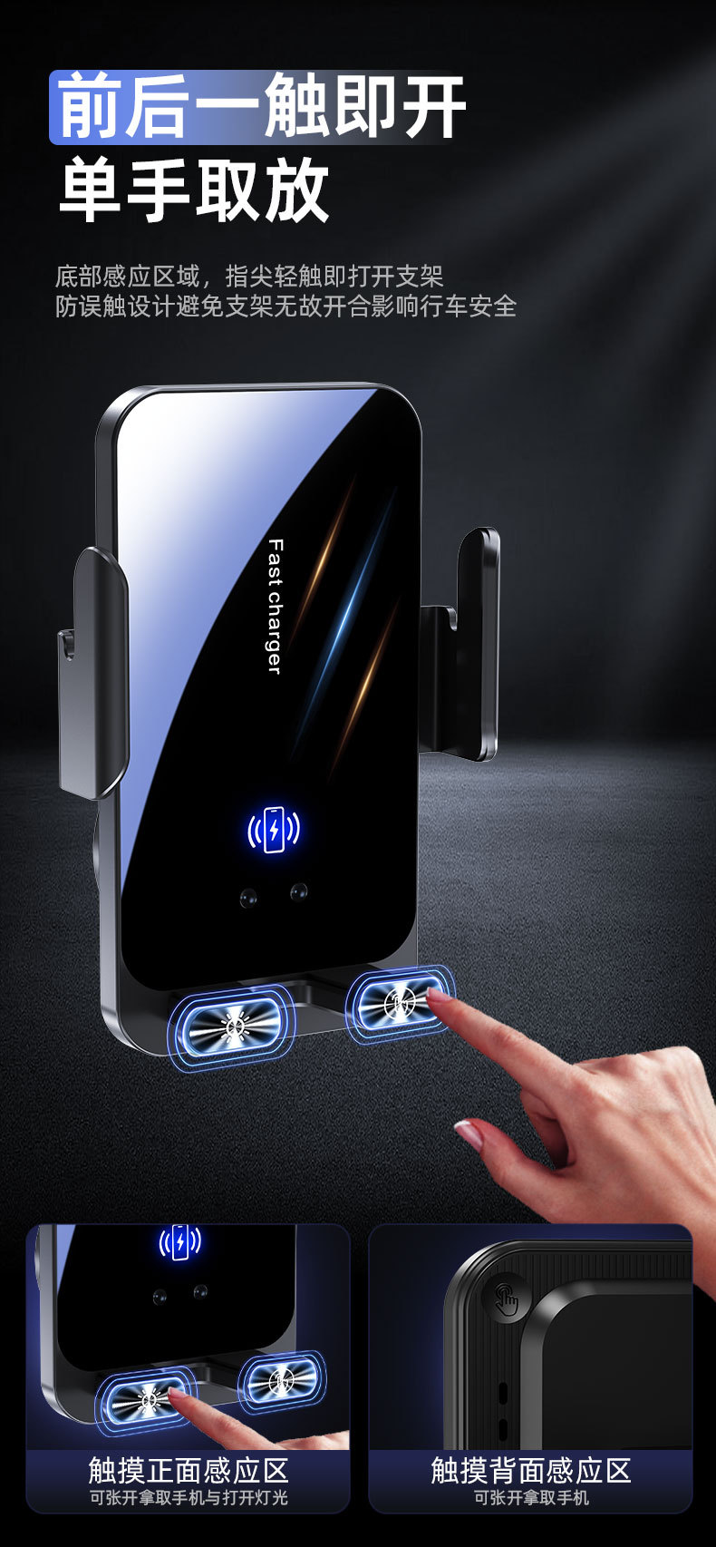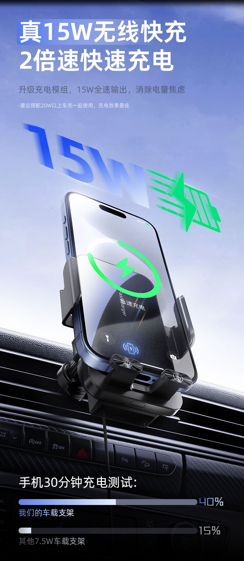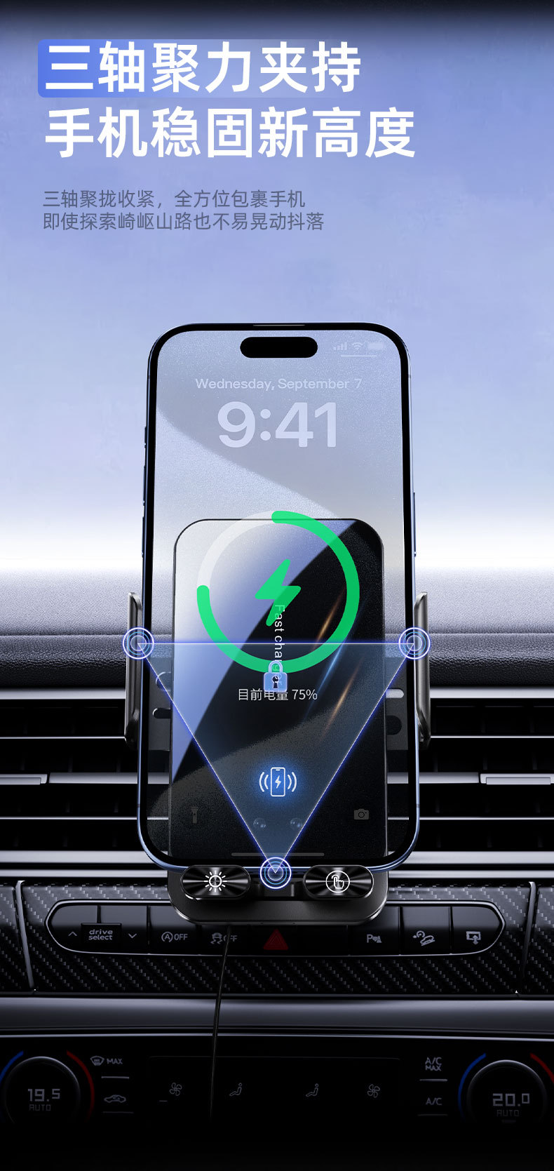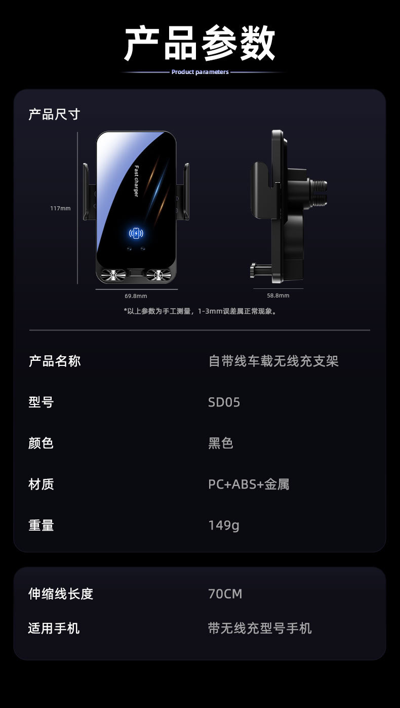 自带线15W无线充手机支架感应电动开合伸缩TP-C线车载手机支架
