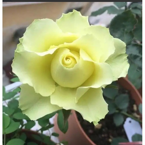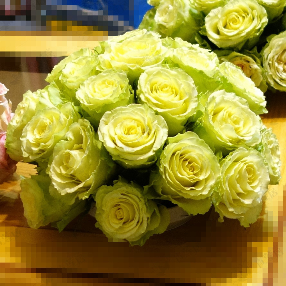 凌波月季,奶油绿色花朵,花径6-8厘米,株高60厘米,切花月季,多季重复开花,杯状花型,花瓣有褶皱。