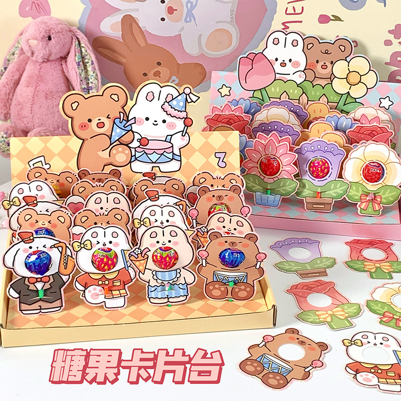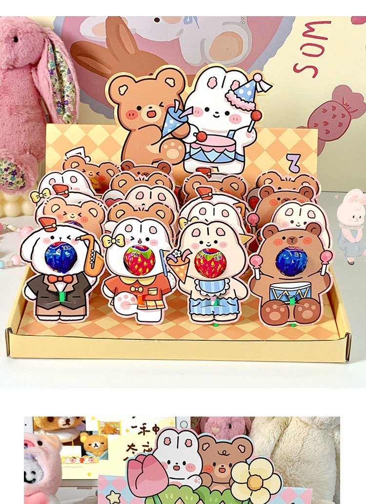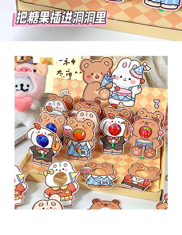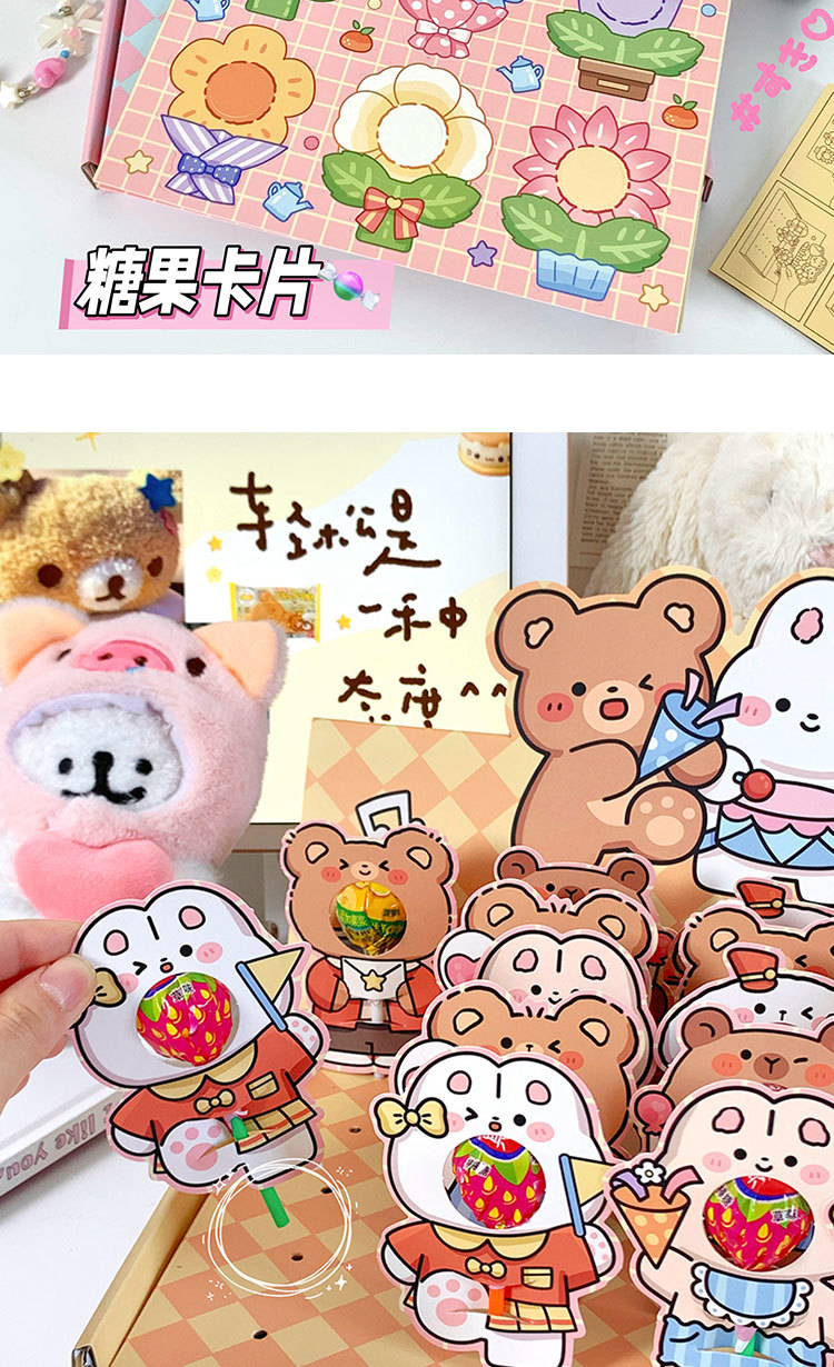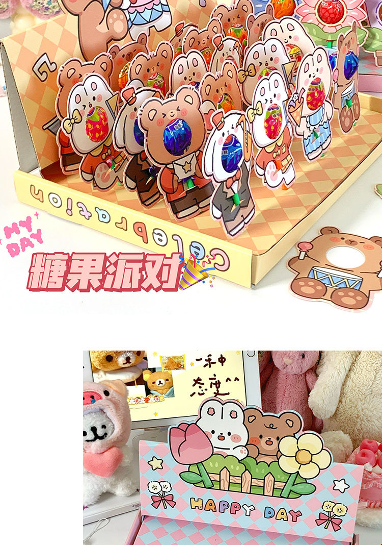(1 коробка (вмещает 20 конфет)) Розовый медвежонок и зайчик с цветочками; (6 штук на листе) Карты с розовым цветком, медведем и кроликом; (1 бумажная коробка (вмещает 20 конфет) + 4 карточки (1 карточка с 6 элементами)) Подарочный набор в виде мультяшных коробок - розовый медвежонок с цветами и зайчик; (1 бумажная коробка (вмещает 20 конфет)) Желтый медвежонок и кролик для вечеринки; (6 штук на листе) Желтые открытки с медведями и зайчиками для вечеринок; (1 бумажная коробка (вмещает 20 конфет) + 4 карточки (1 карточка с 6 элементами)) Подарочный набор в виде мультяшных коробок - желтый медвежонок и зайчик для вечеринки