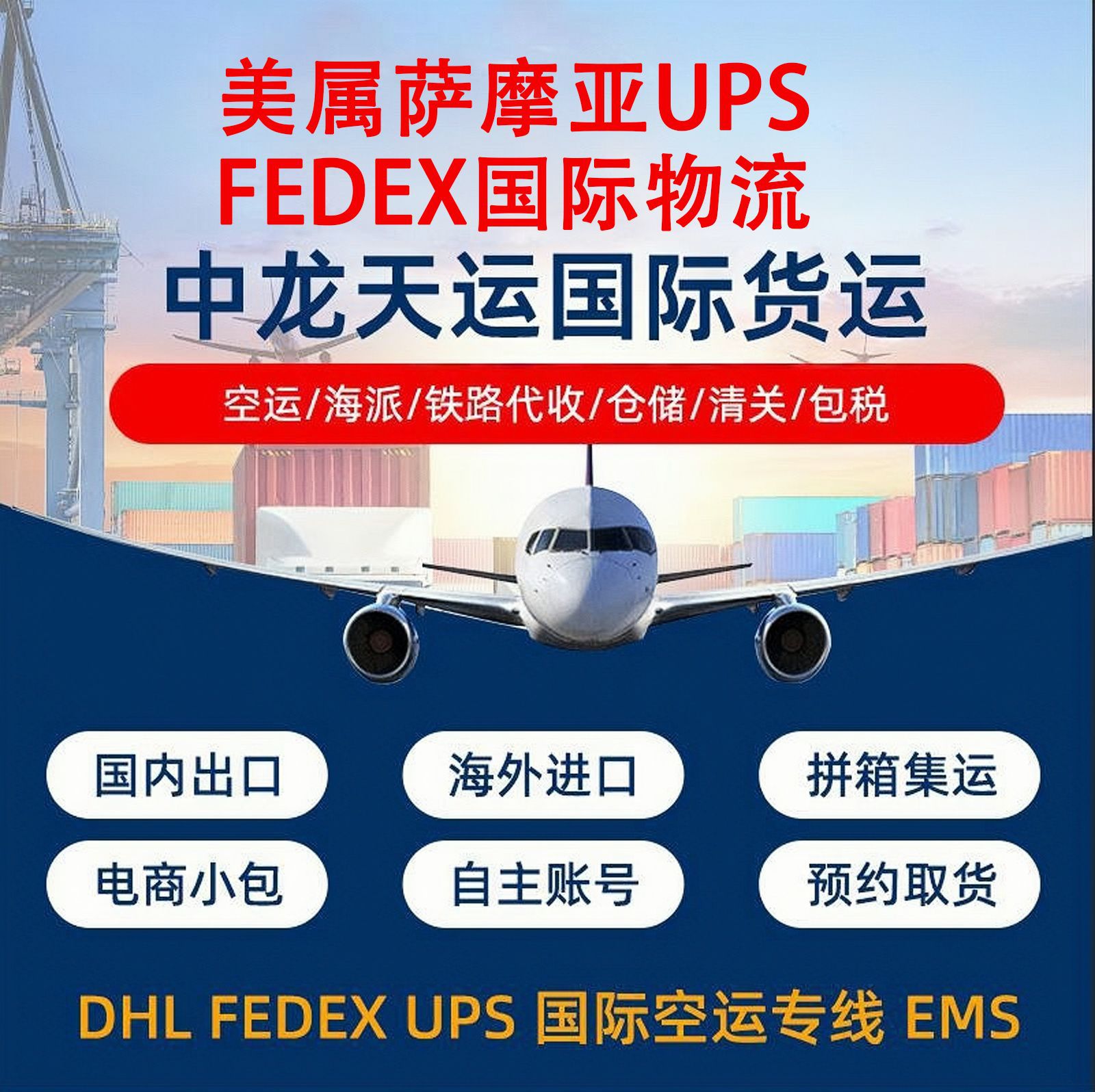 本公司主要经营业务:代理TNT天地物流、DHL中外运敦豪、 EMS 全球特。快专递、 UPS 联合包裹、FEDEX联邦快递,价格优惠,服务专业,义乌地区和深圳宝安机场附近免费上门接件。本着为顾客着想,提供全面服务为宗旨,经济实惠、高效、快捷、准时、优质、守信的企业理念,高度的责任感和热情服务广大客商。“客户至上”,“诚信第一”是我司服务的宗旨.我公司在世界各地拥有完善的代理网络,开通有国际快递专线:中东(包括伊朗,伊拉克)国家专线、日本专线、韩国专线、台湾专线、香港专线、南亚专线(泰国、新加坡、马来西亚,孟加拉、巴基斯坦、斯里兰卡),欧洲专线等; 国际空运,我公司拥有俄航,大韩,阿联酋航空,泰航,全日空等优势航线运价;并可提供在上海和深圳口岸出口报关服务. 中龙天运每一位员工都真诚地期待与您携手合作,共创美好的明天!
