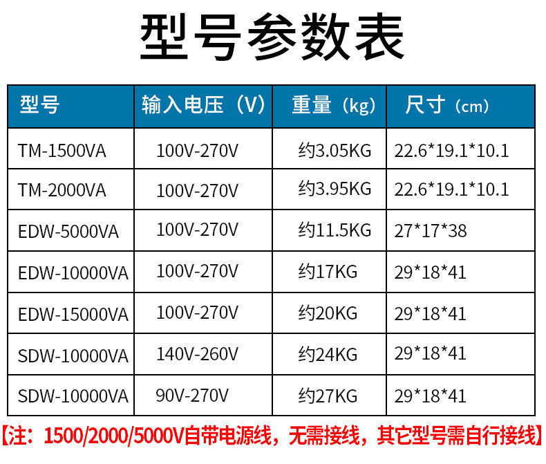 СВР-1000ВА (для мониторинга и использования компьютера); ТМ-1500ВА (электронный тип высокого класса); ТМ-2000ВА (электронный тип высокого класса); ТМ-3000ВА (электронный тип высокого класса); TM-5000VA (электронный тип высокого класса); ЭДВ-5КВА (кондиционер 1/1,5П)