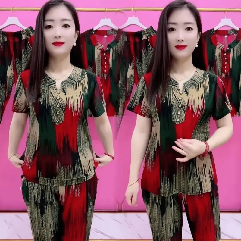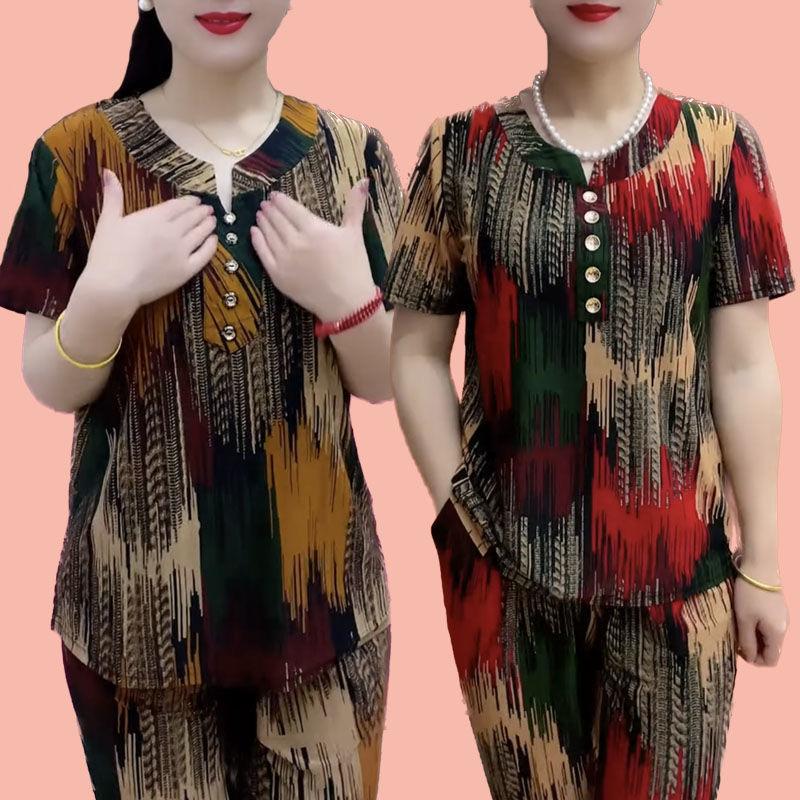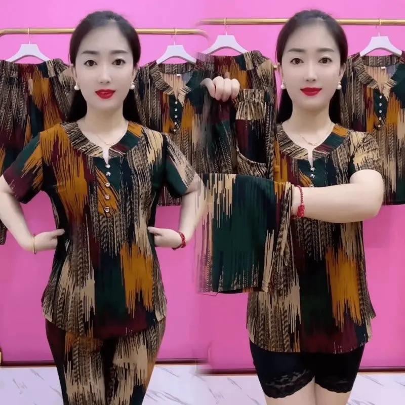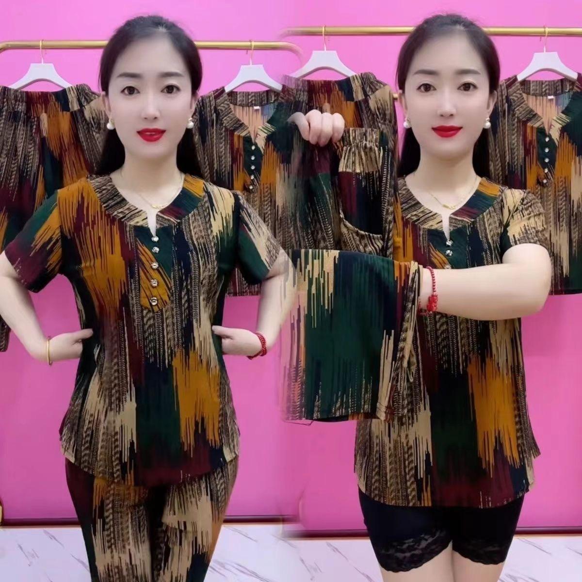 Летний новый средний и пожилой ледяной шелк из двух частей свободный эластичные с короткими рукавами 9 очков брюки костюм прохладный и дышащий