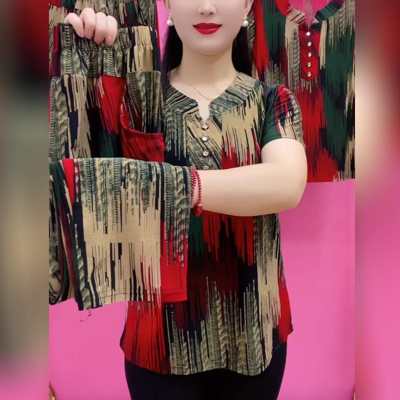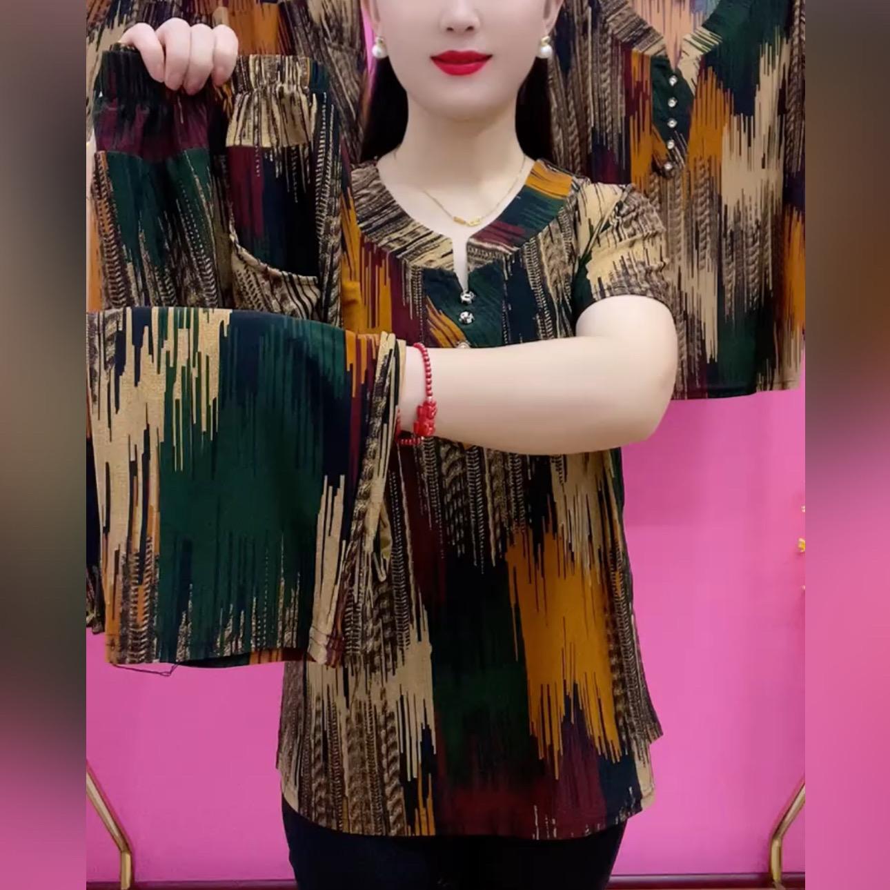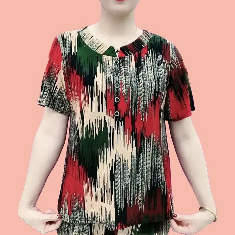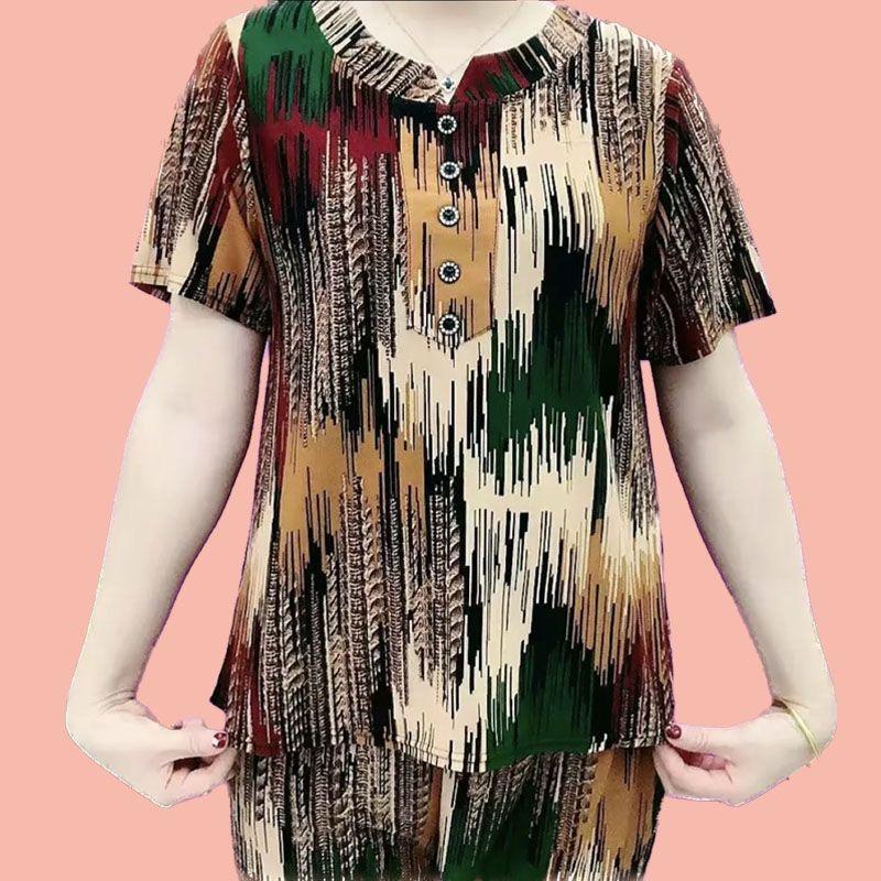 Летний новый средний и пожилой ледяной шелк из двух частей свободный эластичные с короткими рукавами 9 очков брюки костюм прохладный и дышащий