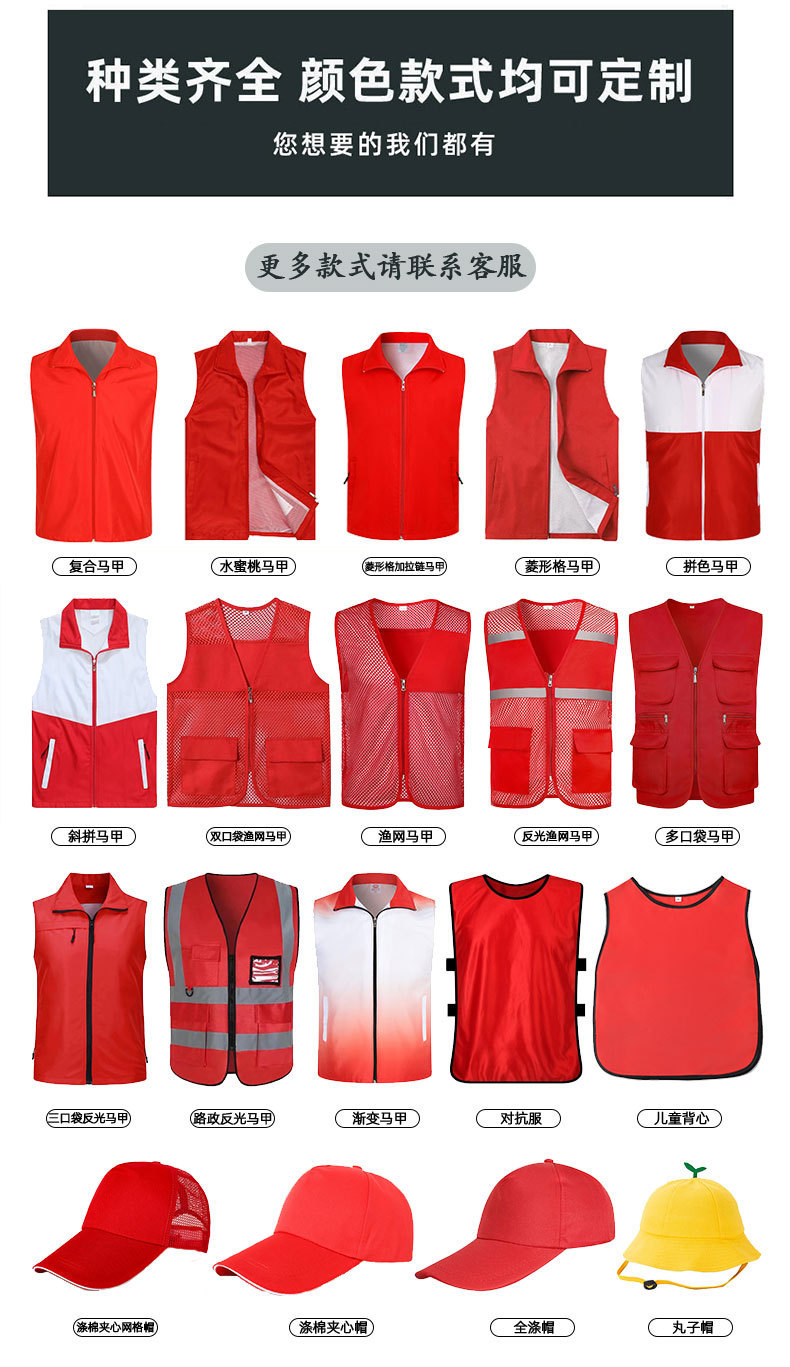красный; желтый; королевский синий; голубое небо; оранжевый; флуоресцентный зеленый; черный; Темно-зеленый; Композитный жилет; Двухслойный некомпозитный жилет.; жилет с ромбовидной клеткой; Жилет с цветными блоками; жилет с градиентом; шляпа; Жилет в сетку без карманов; Светоотражающий жилет в сетку; Жилет в сетку с двумя карманами; жилет с несколькими карманами; Светоотражающий жилет дорожного управления; жилет с V-образным вырезом; Жилет санитарно-гигиенический и чистящий; детский жилет; Градиентный жилет 3
