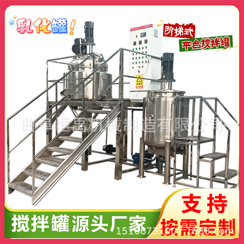 Двухслойный дисперсионный резервуар с электрическим подогревом и контролем температуры. Резервуар для эмульгирования жидкости с матовой обработкой 304. Двухслойный смесительный резервуар на платформе.