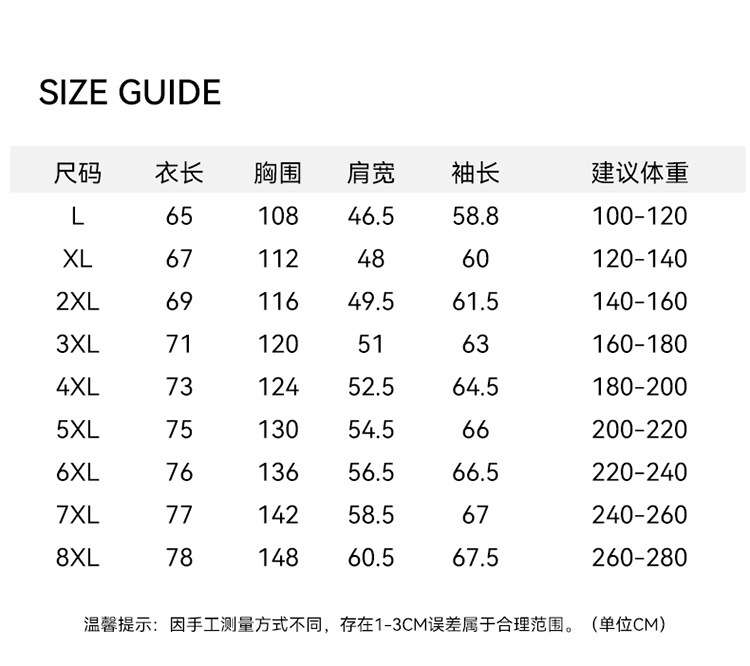 L; XL; 2XL; 3XL; 4XL; 5XL; 6XL; 7XL; 8XL