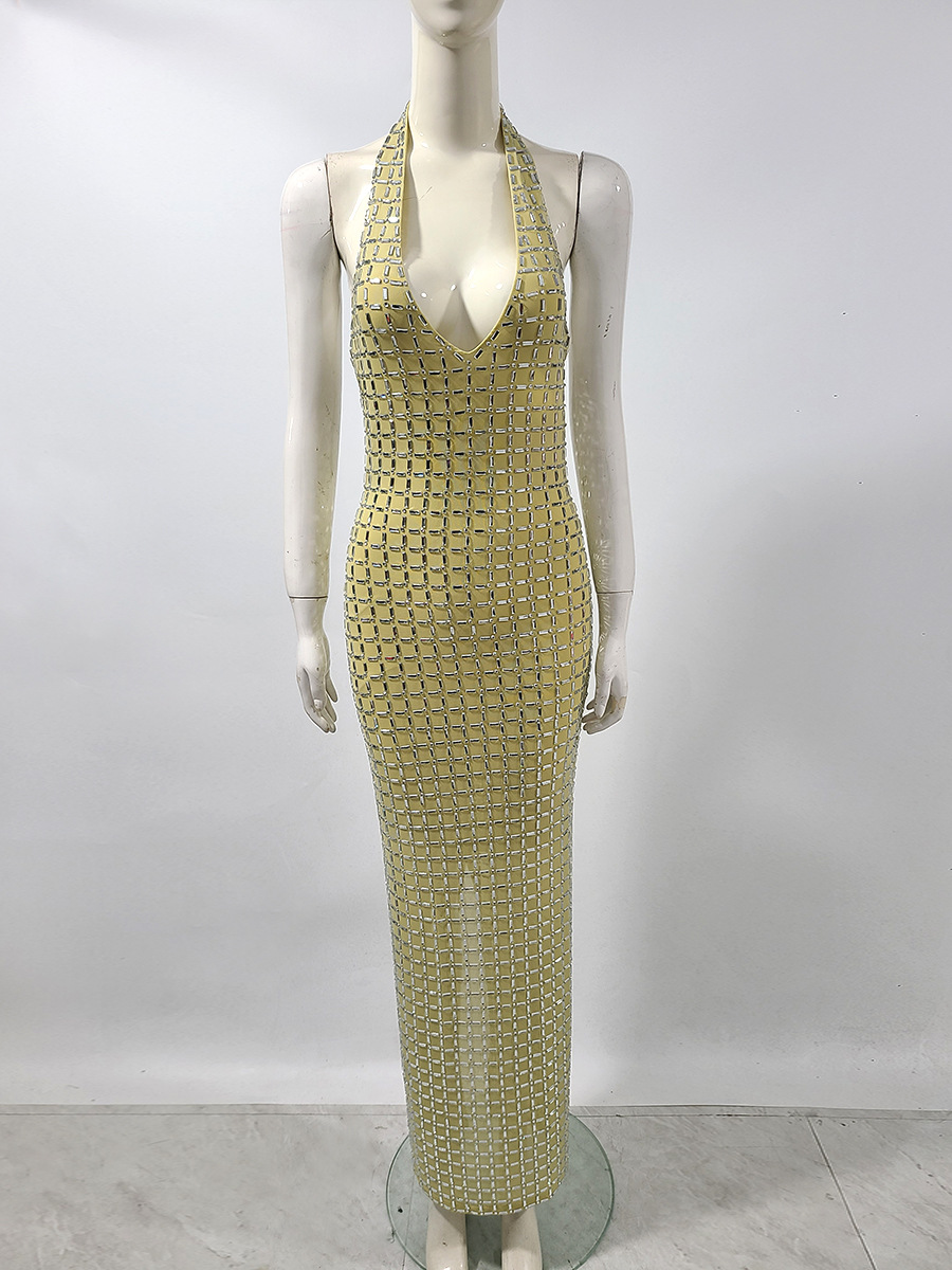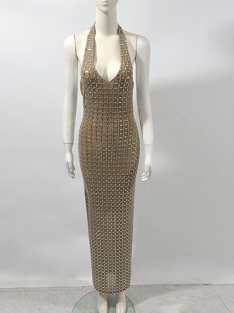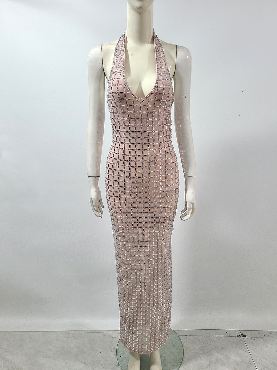 Европейское и американское женское модное новое сексуальное облегающее платье с открытой спиной и стразами на бретельках и глубоким v-образным вырезом