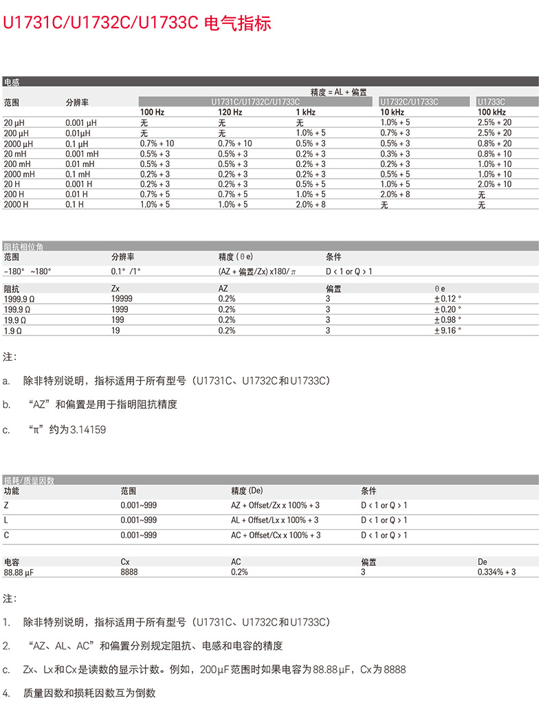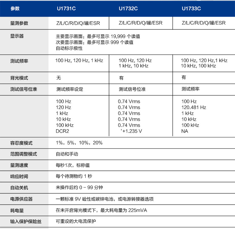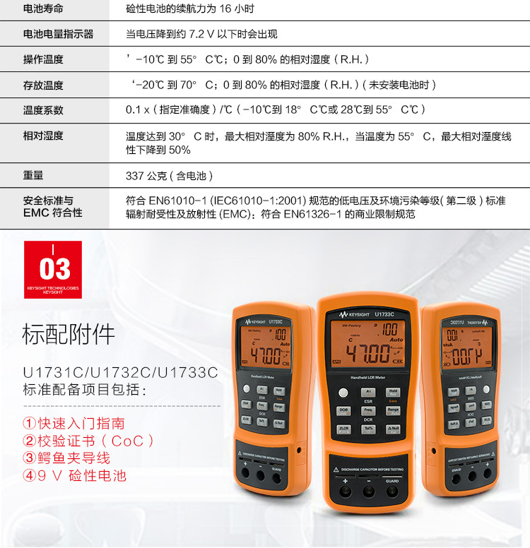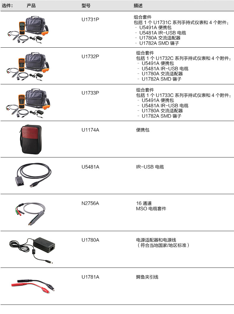 U1731C(1KHZ); U1732C(10KHZ); U1733C(100KHZ); U1782B(пинцет SMD); U1174A сумка для переноски; Адаптер питания U1780A; U5481BIR-USB-кабель связи