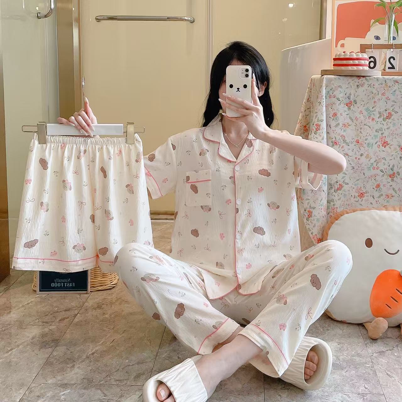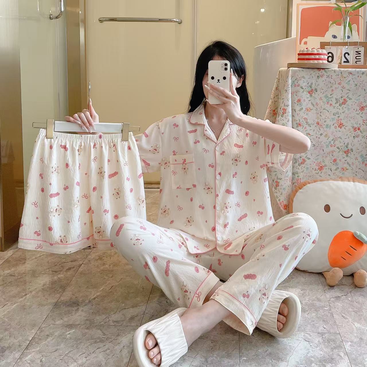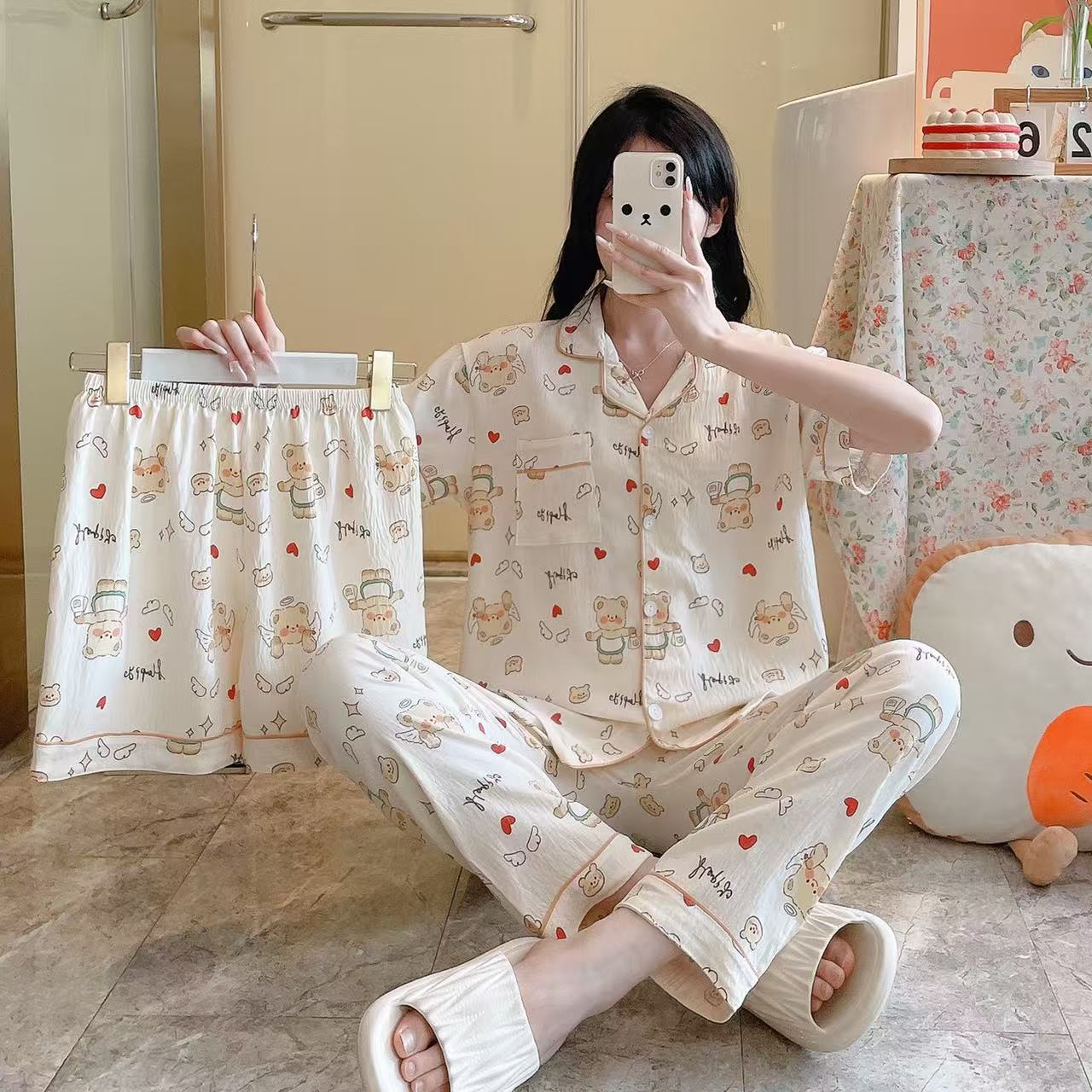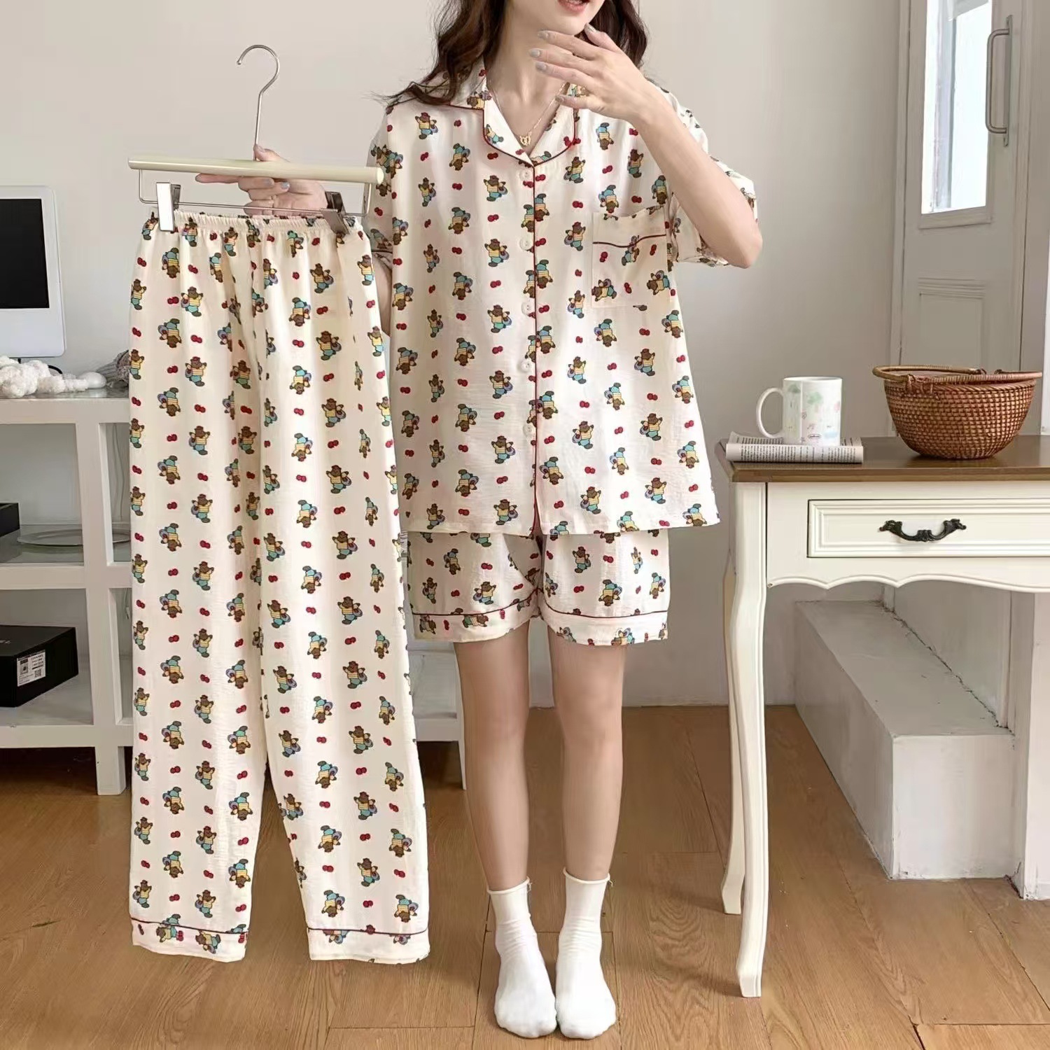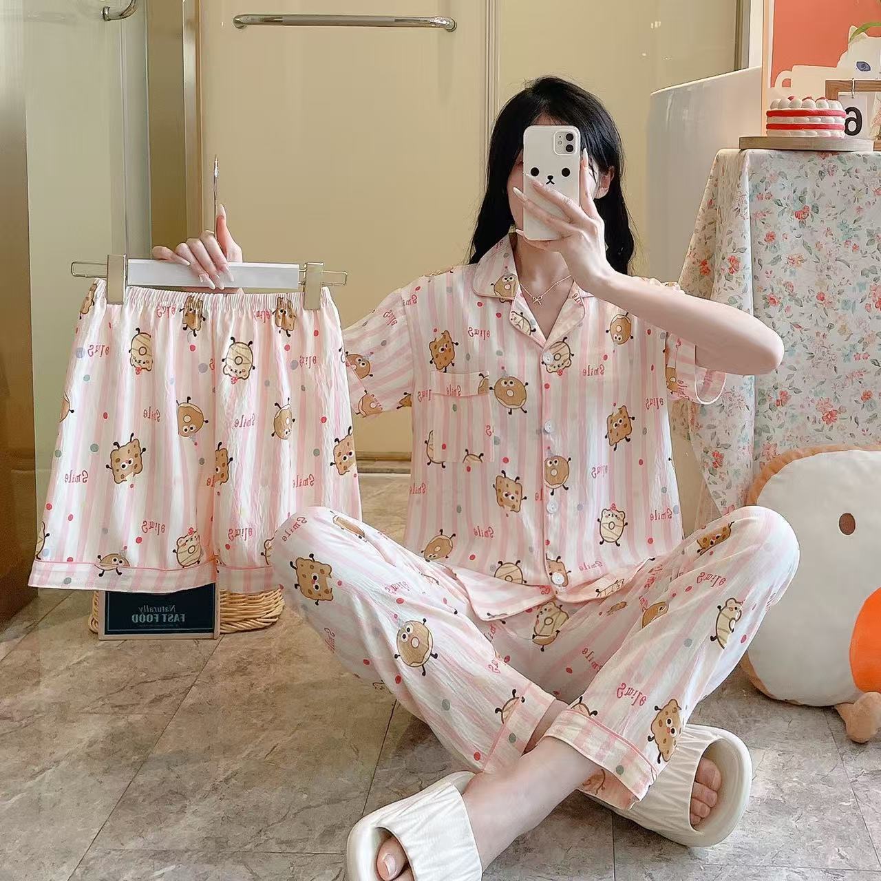 Женские летние пижамы из хлопчатобумажной ткани с коротким рукавом и шортами, трехпредметный костюм для дома и улицы, с мультяшными рисунками, для трансграничной внешней торговли.