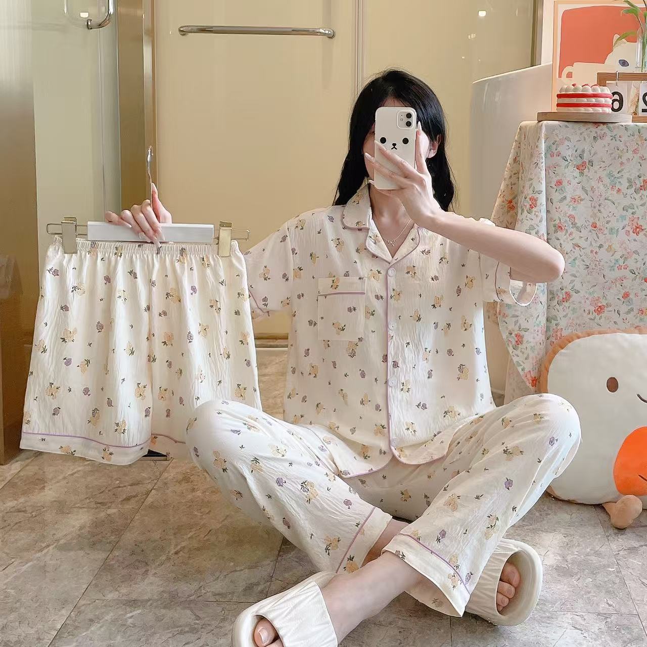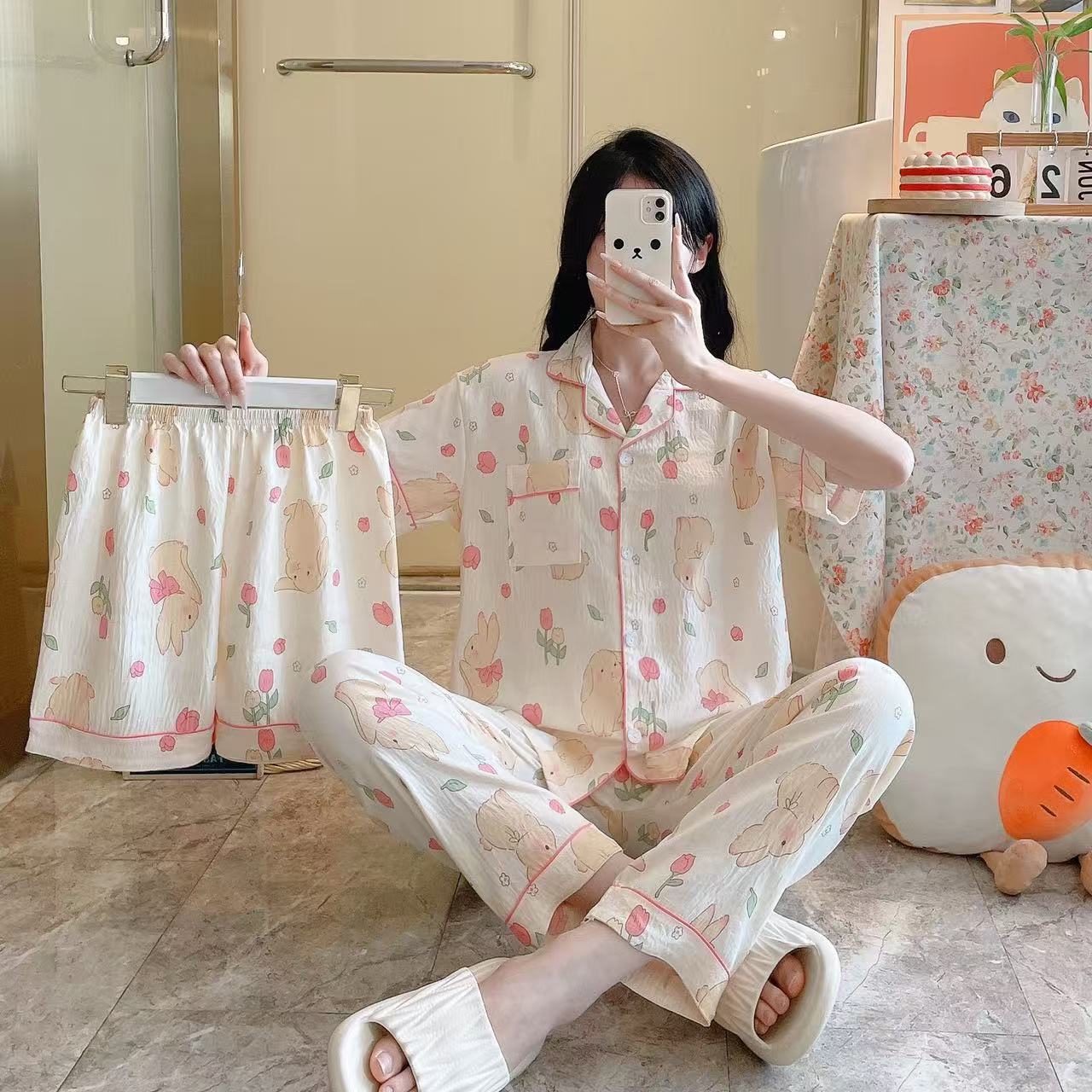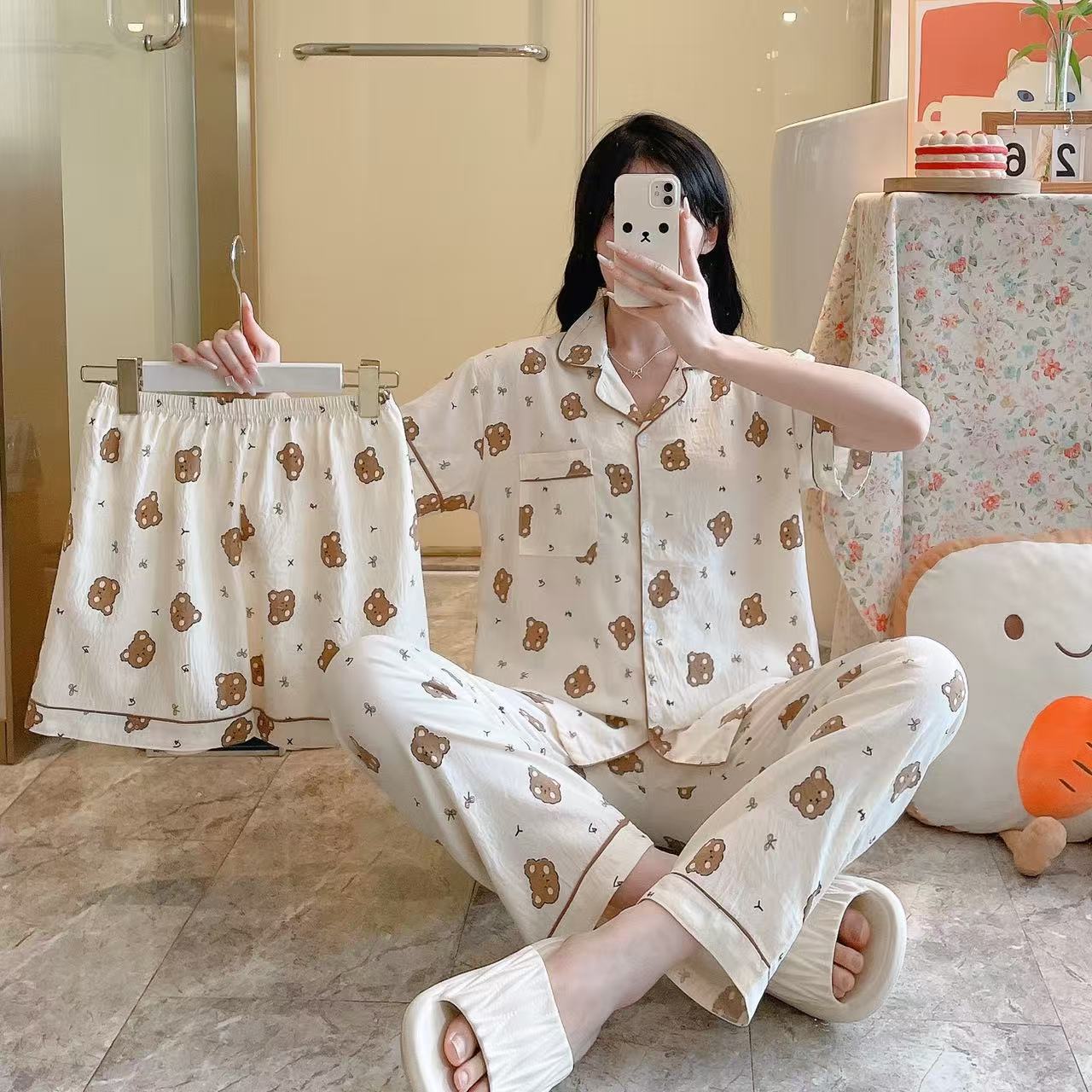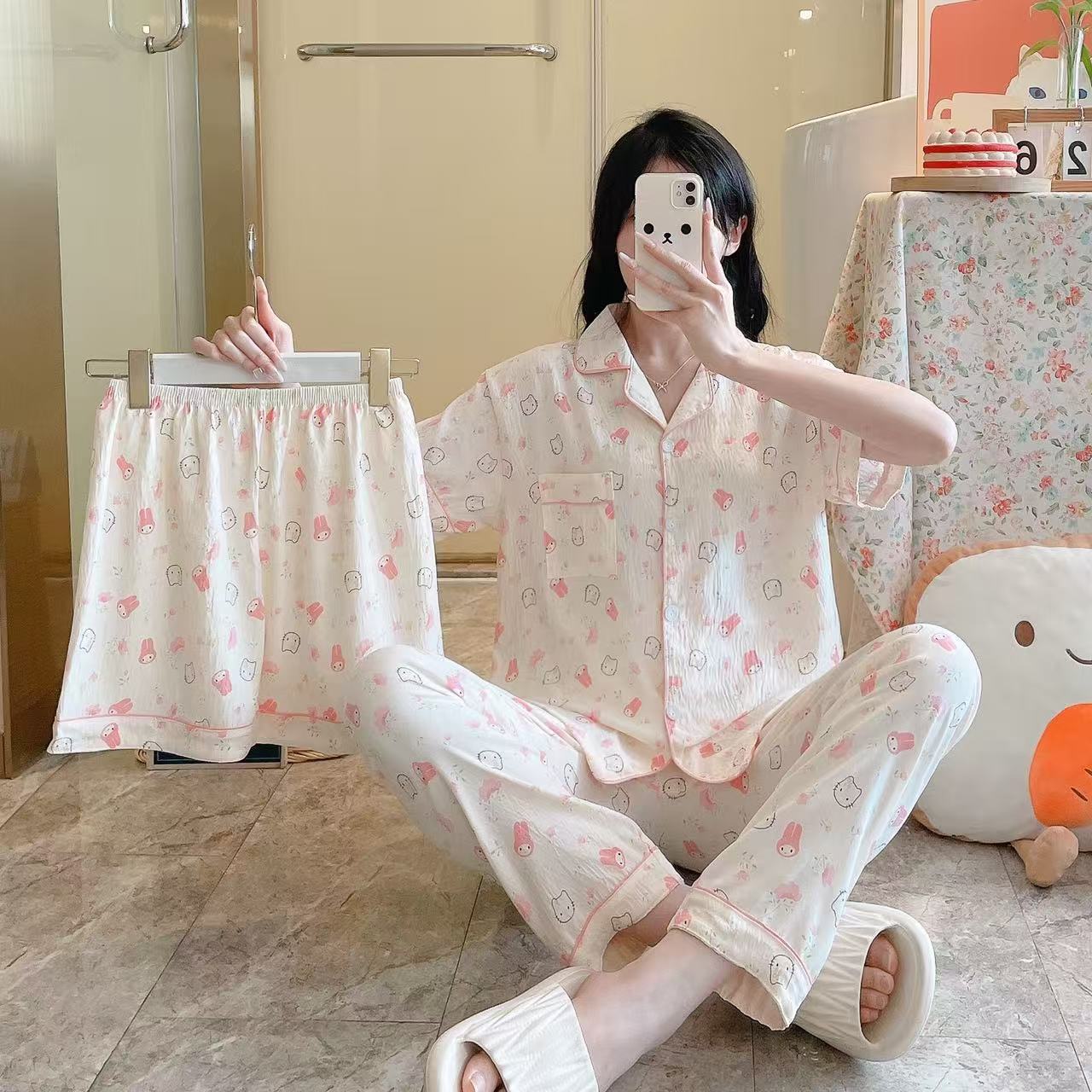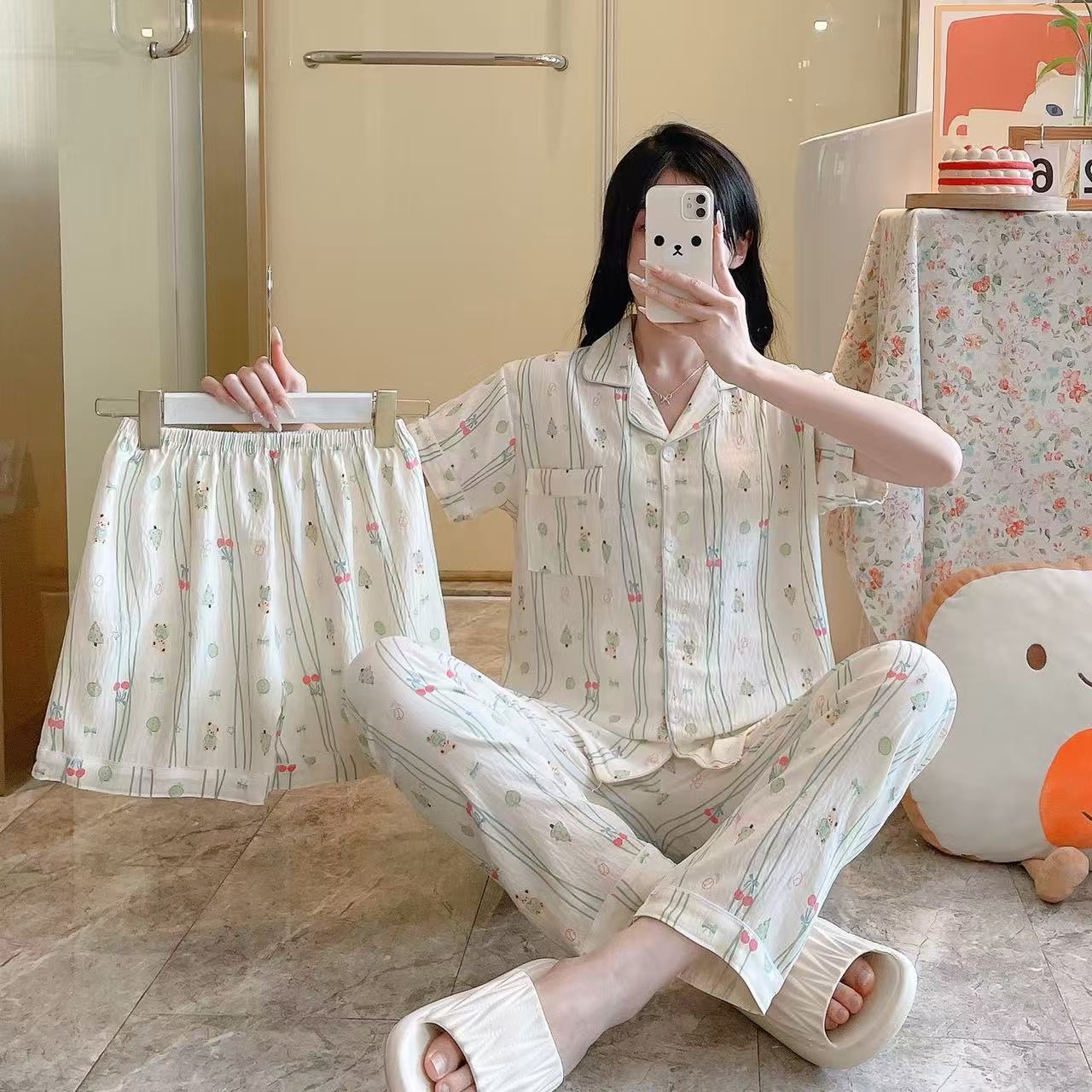 Женские летние пижамы из хлопчатобумажной ткани с коротким рукавом и шортами, трехпредметный костюм для дома и улицы, с мультяшными рисунками, для трансграничной внешней торговли.