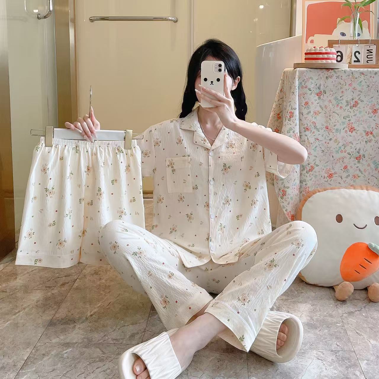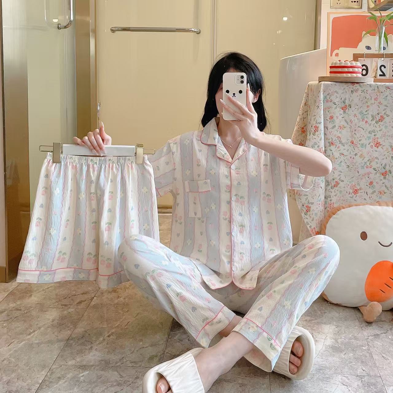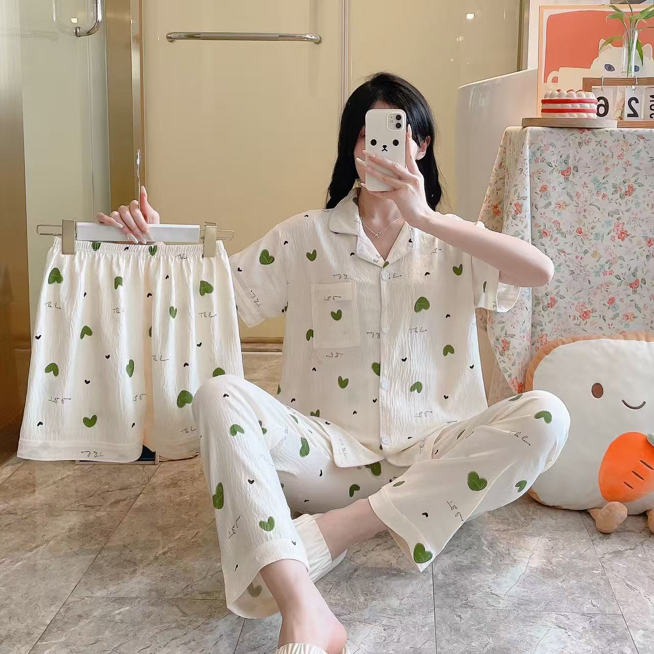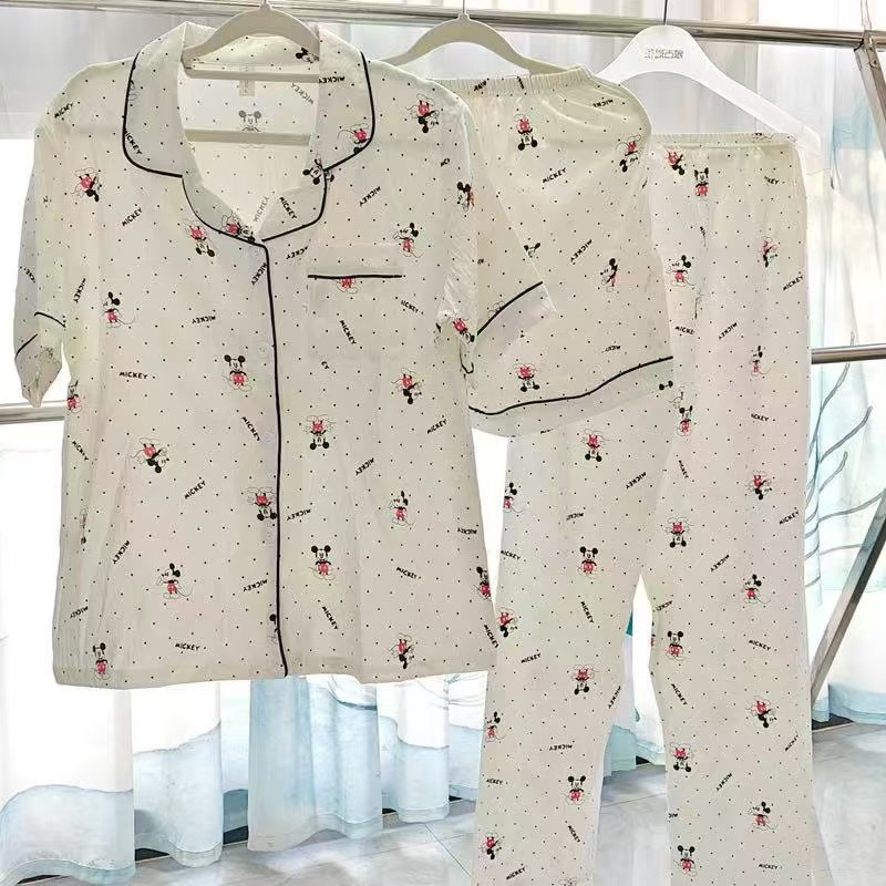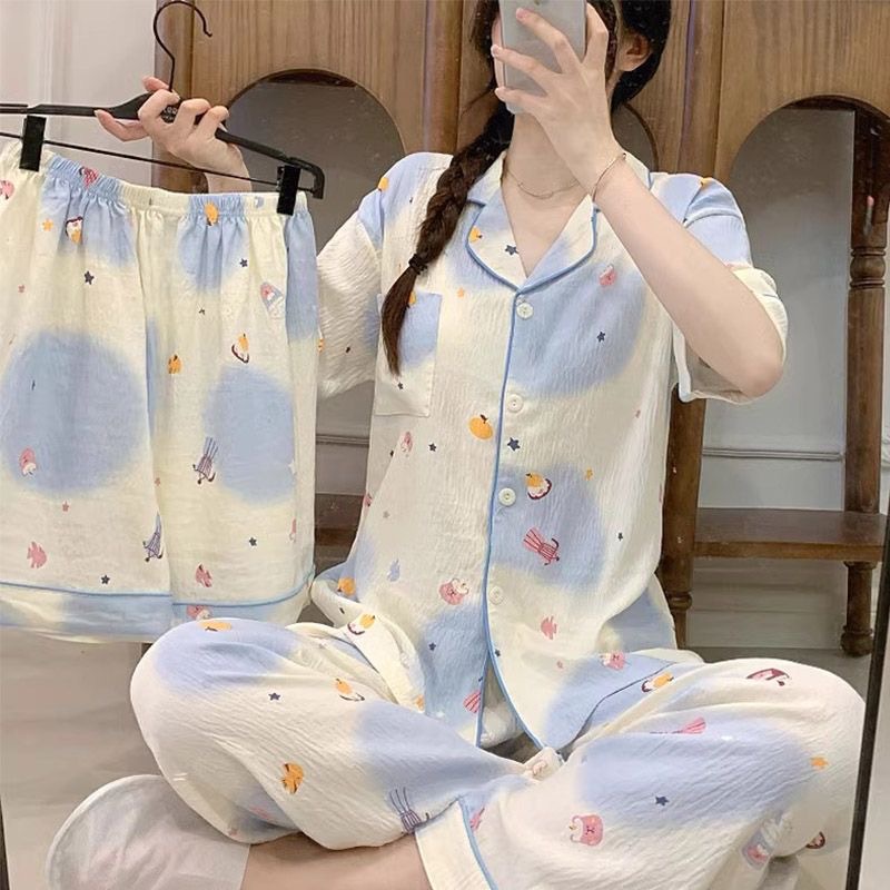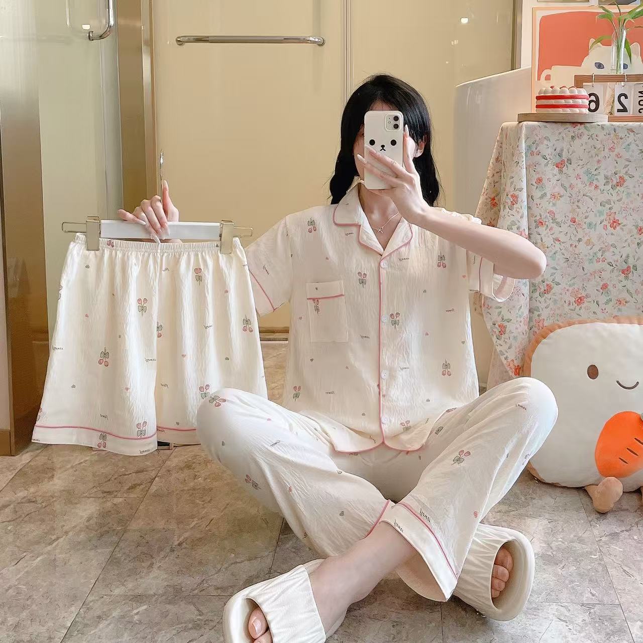 Женские летние пижамы из хлопчатобумажной ткани с коротким рукавом и шортами, трехпредметный костюм для дома и улицы, с мультяшными рисунками, для трансграничной внешней торговли.
