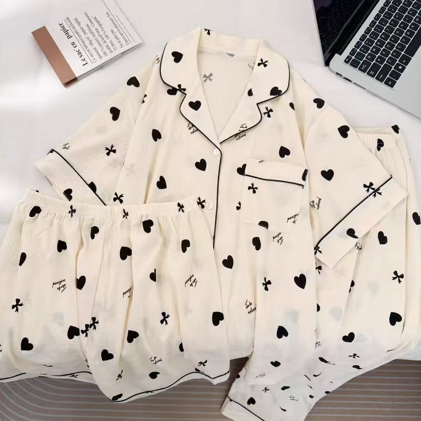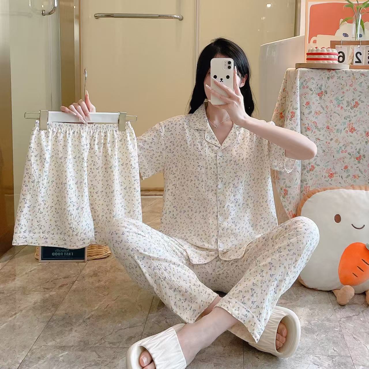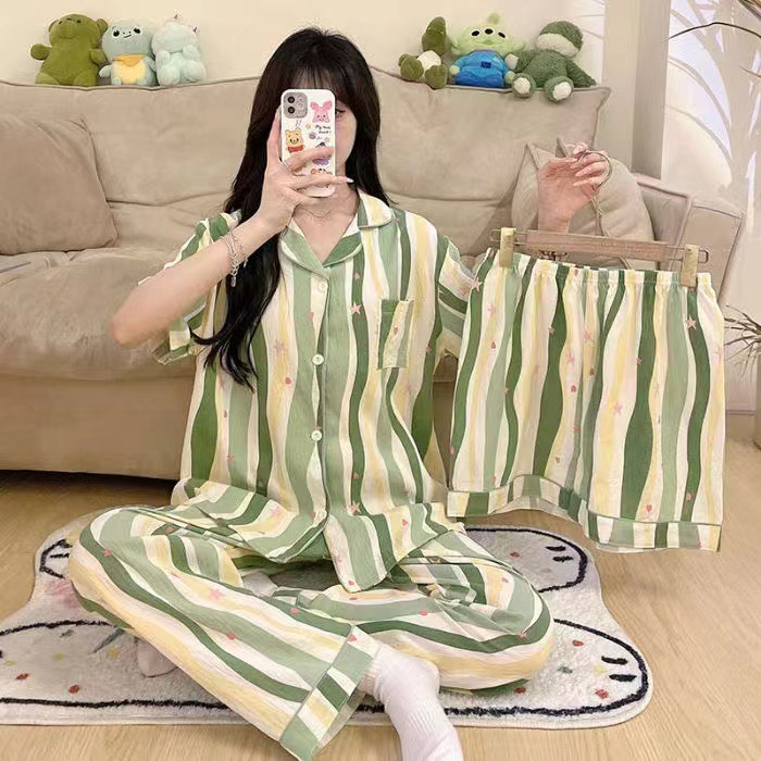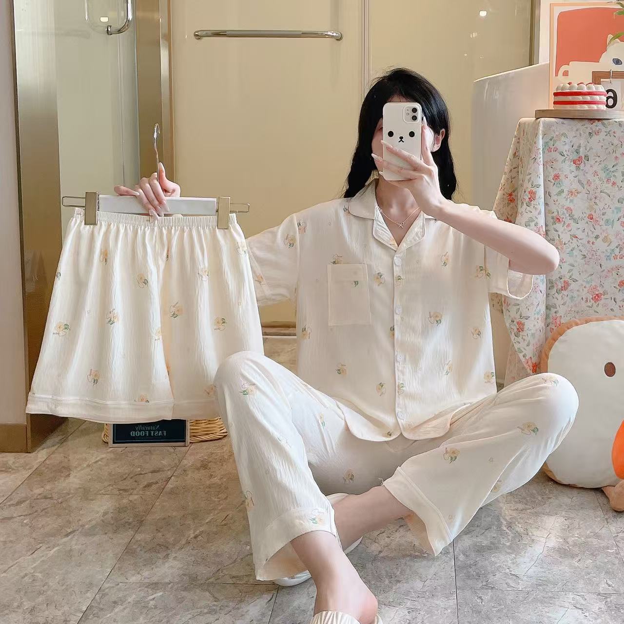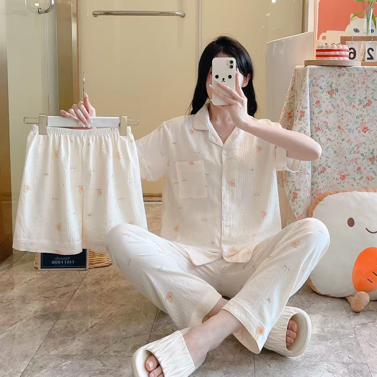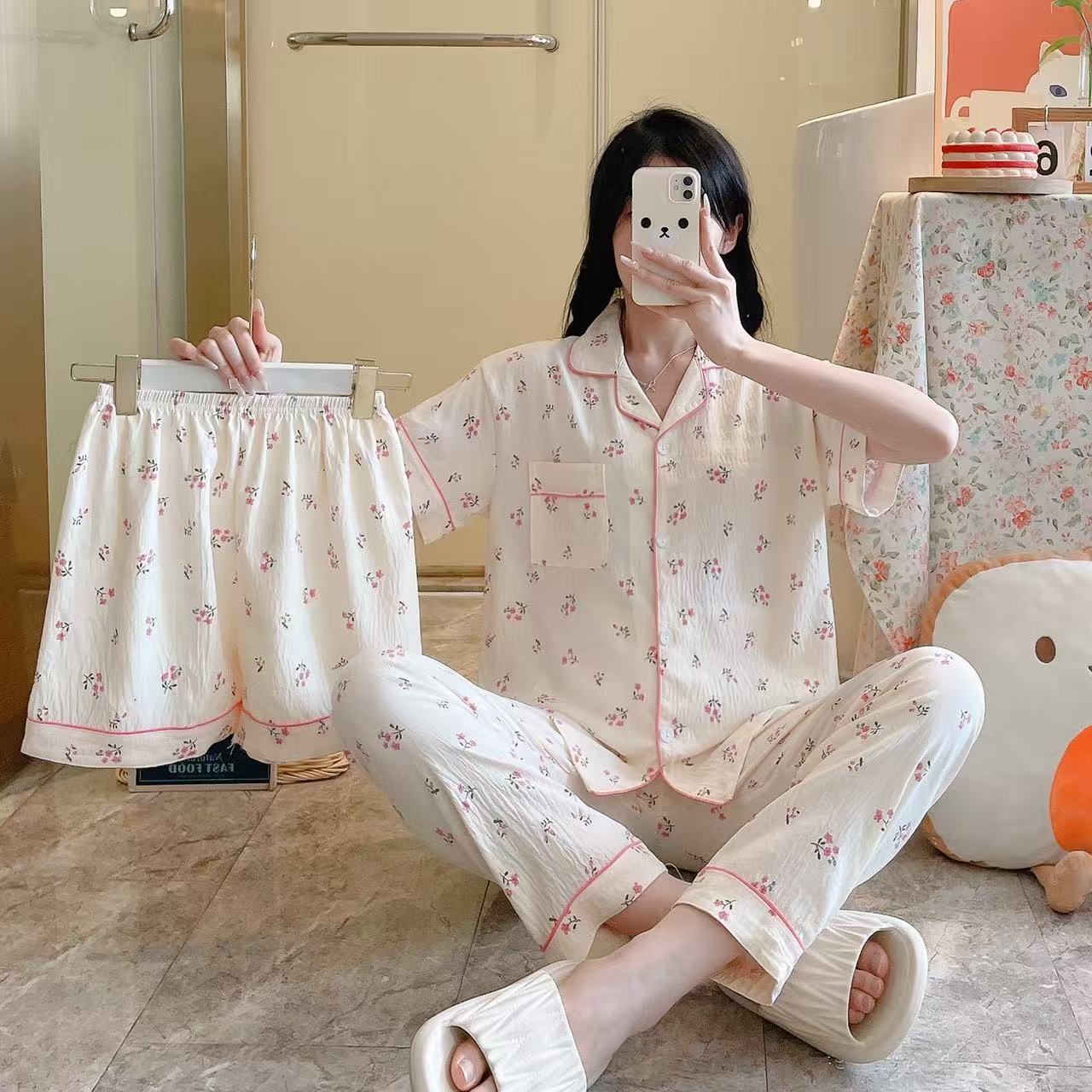Женские летние пижамы из хлопчатобумажной ткани с коротким рукавом и шортами, трехпредметный костюм для дома и улицы, с мультяшными рисунками, для трансграничной внешней торговли.