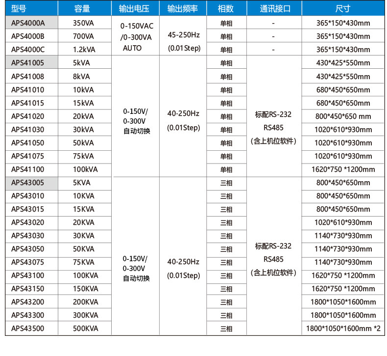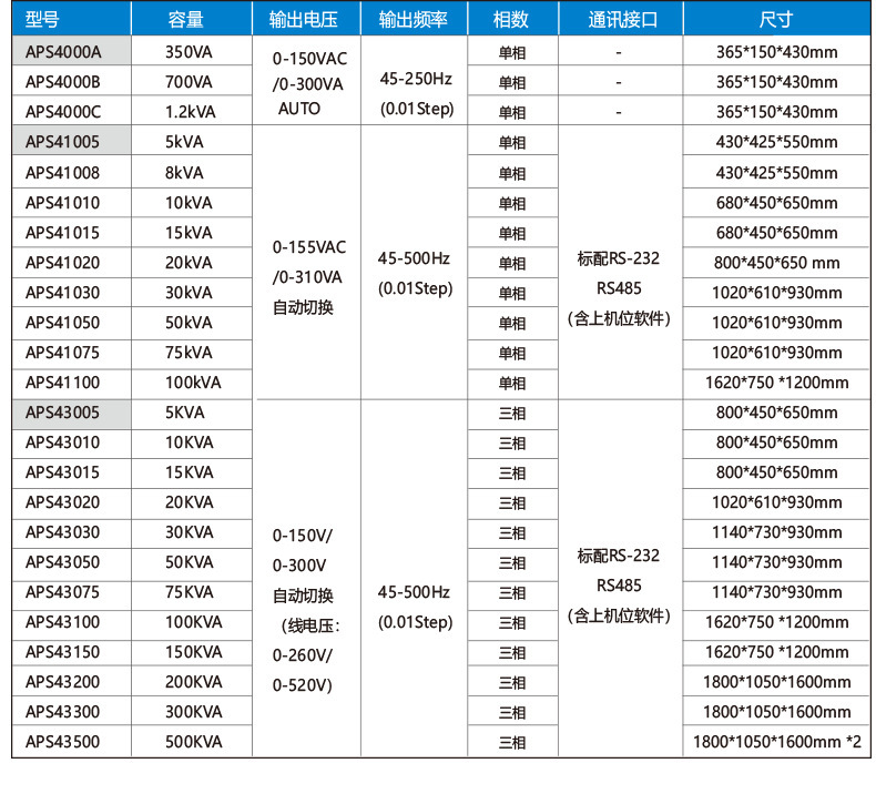APS41005 (5 кВА) с одним входом и одним выходом; APS41008 (8 кВА) с одним входом и одним выходом; APS41010 (10 кВА) с одним входом и одним выходом; APS41015 (15 кВА) три входа и один выход; APS41020 (20 кВА) три входа и один выход; APS41030 (30 кВА) три входа и один выход; APS41050 (50 кВА) три входа и один выход; APS41075 (75 кВА) три входа и один выход; APS41100 (100 кВА) три входа и один выход