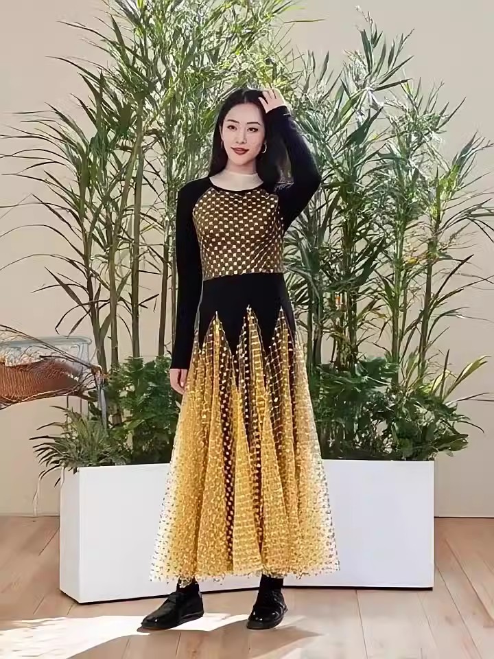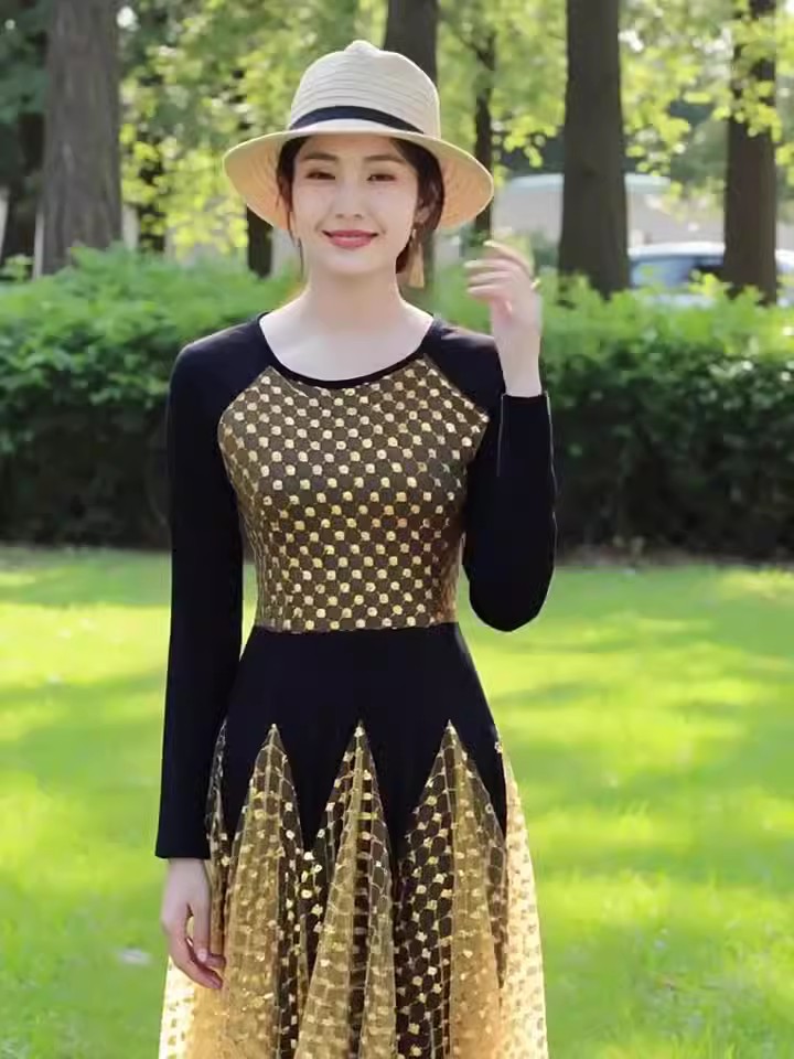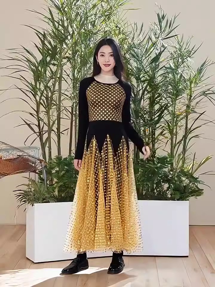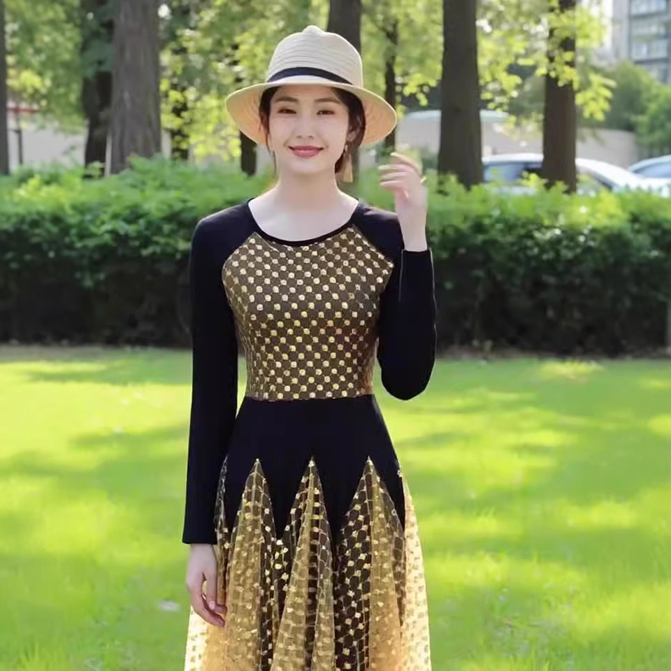 Платье с юбкой для современного танца, юбка с большим подолом, одежда для выступлений с длинными рукавами, одежда для выступлений в бальных танцах, современный танец