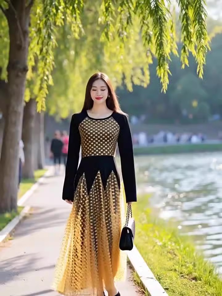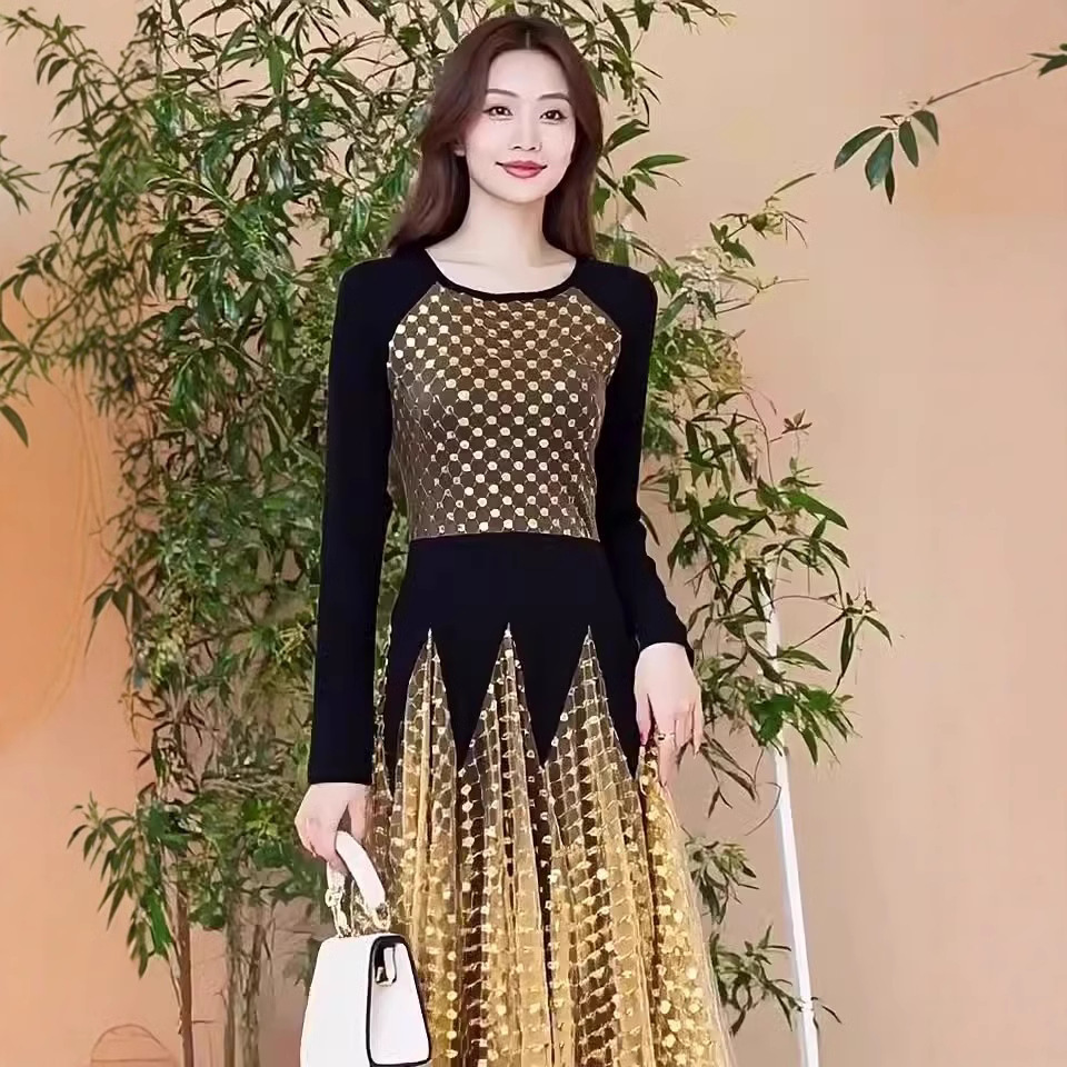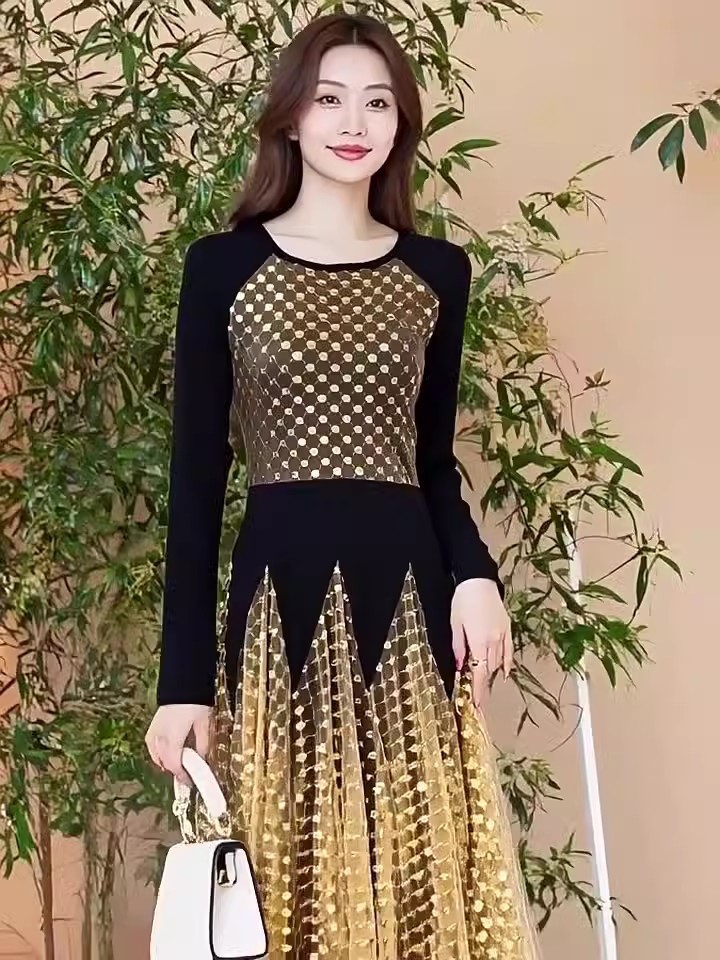 Черное платье с длинными рукавами и золотым цветочным принтом