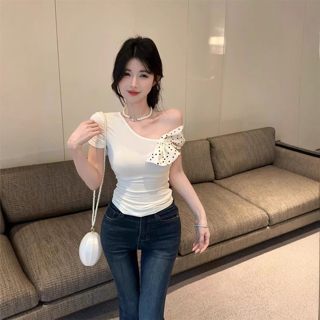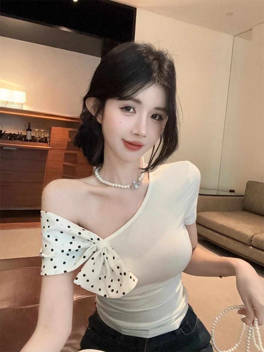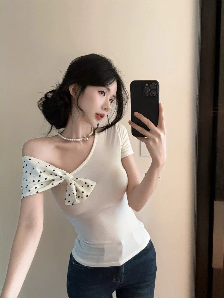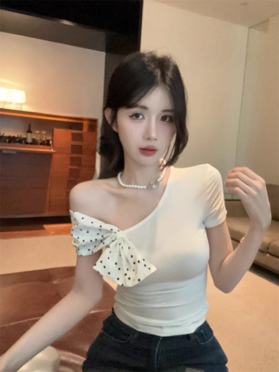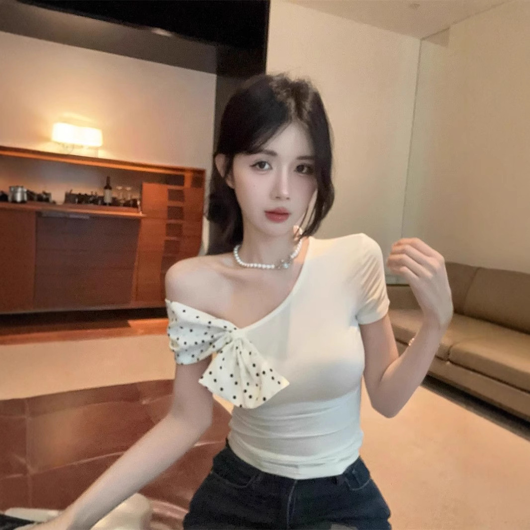 Внешняя торговля, трансграничная новая стильная асимметричная футболка с косыми плечами в горошек и короткими рукавами для женщин, летняя чистая сексуальная сексуальная уникальная футболка