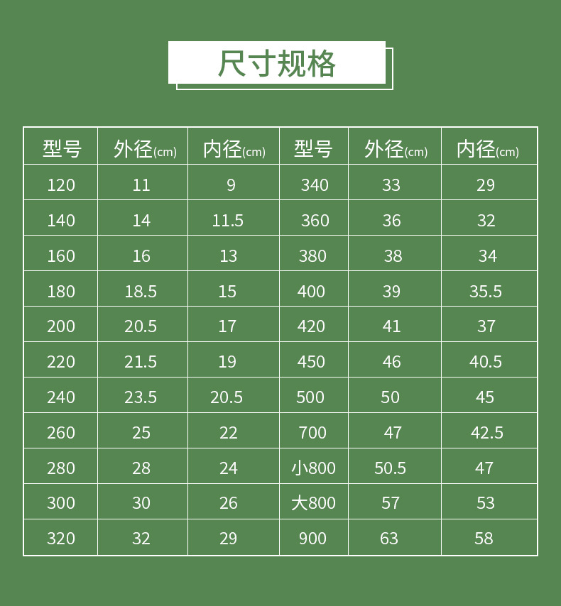 120#Верхнее отверстие 120*нижнее отверстие 92*глубина 20 (всего 2700 штук); 140#Верхнее отверстие 140*нижнее отверстие 116*глубина 20 (всего 1500 штук); 160#Верхняя часть рта 160*нижняя часть рта 135*глубина 21 (всего 1200 штук); 180#Верхняя часть рта 180*нижняя часть рта 150*глубина 23 (всего 900 штук); 200#Верхняя часть рта 200*нижняя часть рта 170*глубина 24 (всего 700 штук); 220#Верхняя часть рта 220*нижняя часть рта 188*глубина 25 (всего 700 штук); 240#Верхняя часть рта 240*нижняя часть рта 204*глубина 28 (всего 500 штук); 260#Верхняя часть рта 260*нижняя часть рта 215*глубина 30 (всего 450 штук); 280#Верхняя часть рта 280*нижняя часть рта 235*глубина 30 (всего 400 штук); 300#Верхняя часть рта 300*нижняя часть рта 260*глубина 30 (всего 250 штук); 320#Верхняя часть рта 320*нижняя часть рта 275*глубина 33 (всего 250 штук); 340#Верхняя часть рта 340*нижняя часть рта 295*глубина 35 (всего 200 штук); 360#Верхняя горловина 360* нижняя горловина 308* глубина 36 (всего 200 штук); 380#Верхняя часть рта 380*нижняя часть рта 335*глубина 38 (всего 150 штук); 400#Верхняя часть рта 400*нижняя часть рта 348*глубина 40 (всего 150 штук); 420#Верхняя часть рта 420*нижняя часть рта 370*глубина 42 (всего 150 штук); 450#Верхняя часть рта 450*нижняя часть рта 405*глубина 40 (всего 150 штук); 500#Верхняя часть рта 500*нижняя часть рта 445*глубина 40 (всего 80 штук)