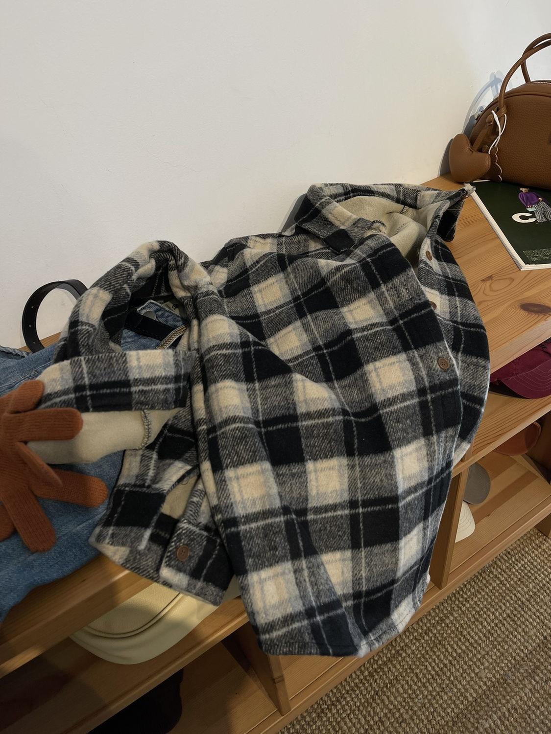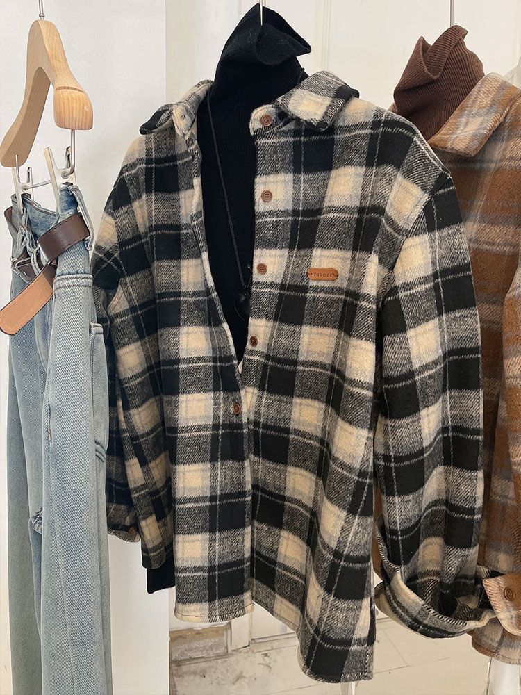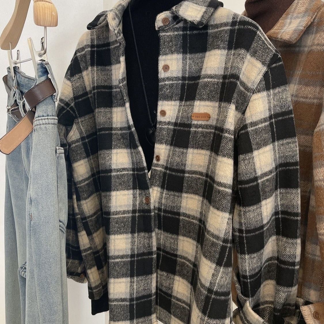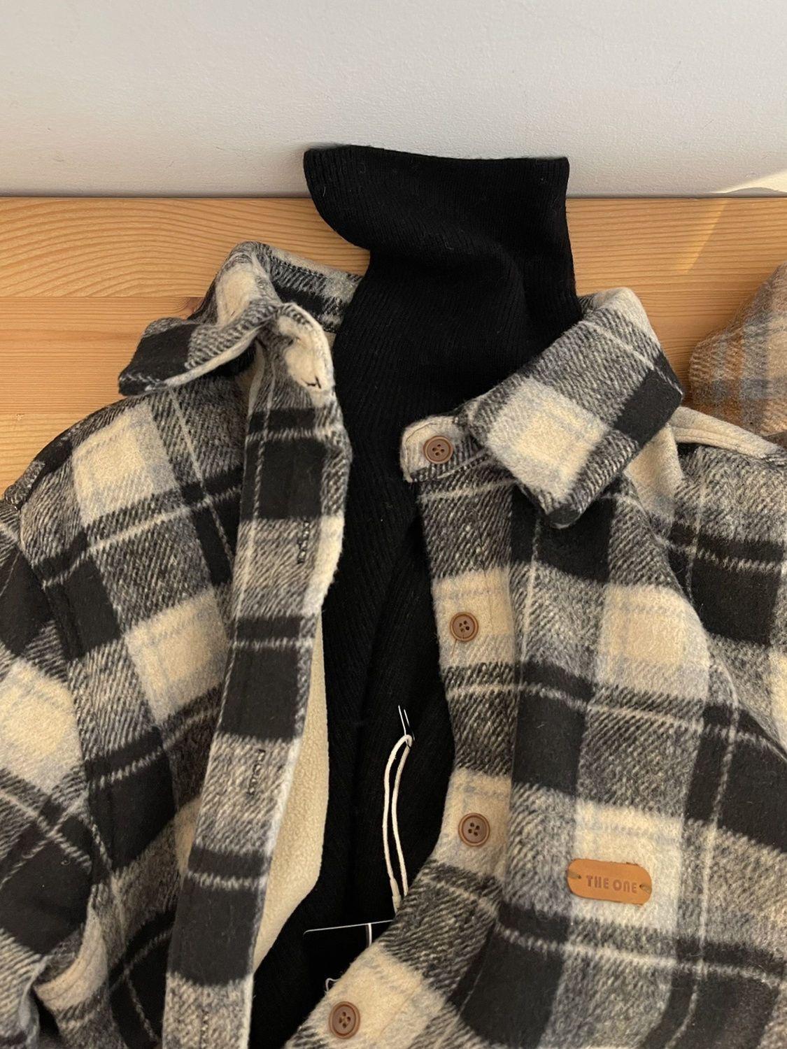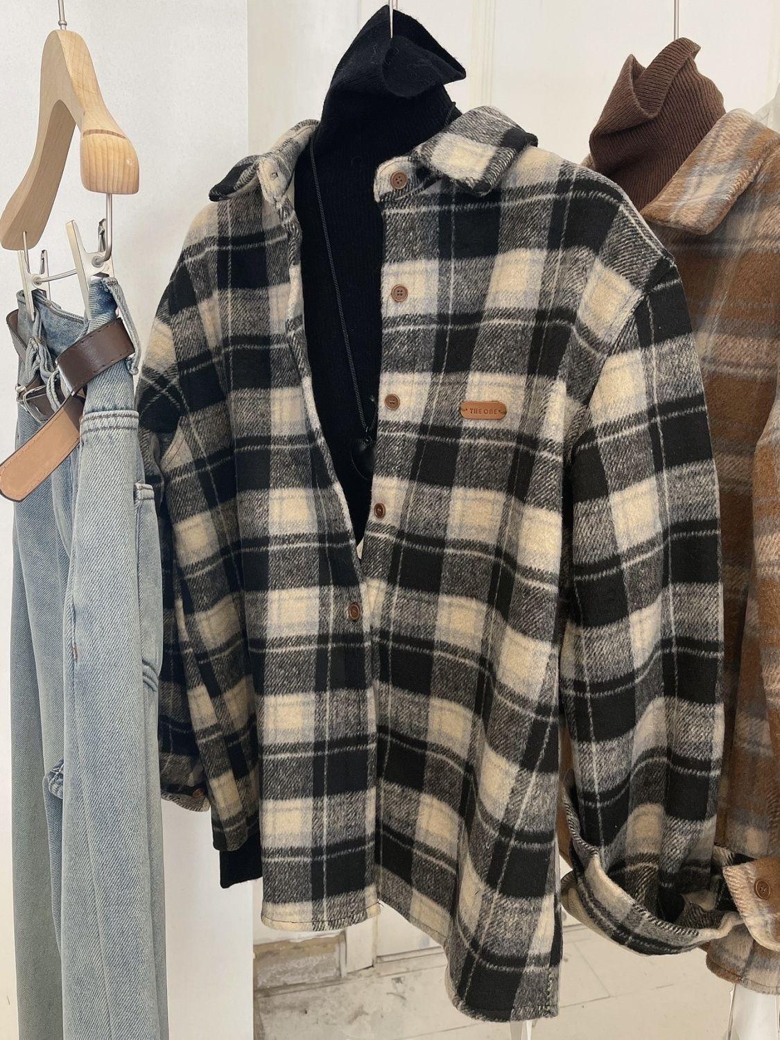 Черная рубашка в клетку с контрастными цветами для женщин, винтажная ткань с эффектом потертости, для зимнего многослойного образа, свободный крой, в стиле куртки, на флисовой подкладке и утепленная.