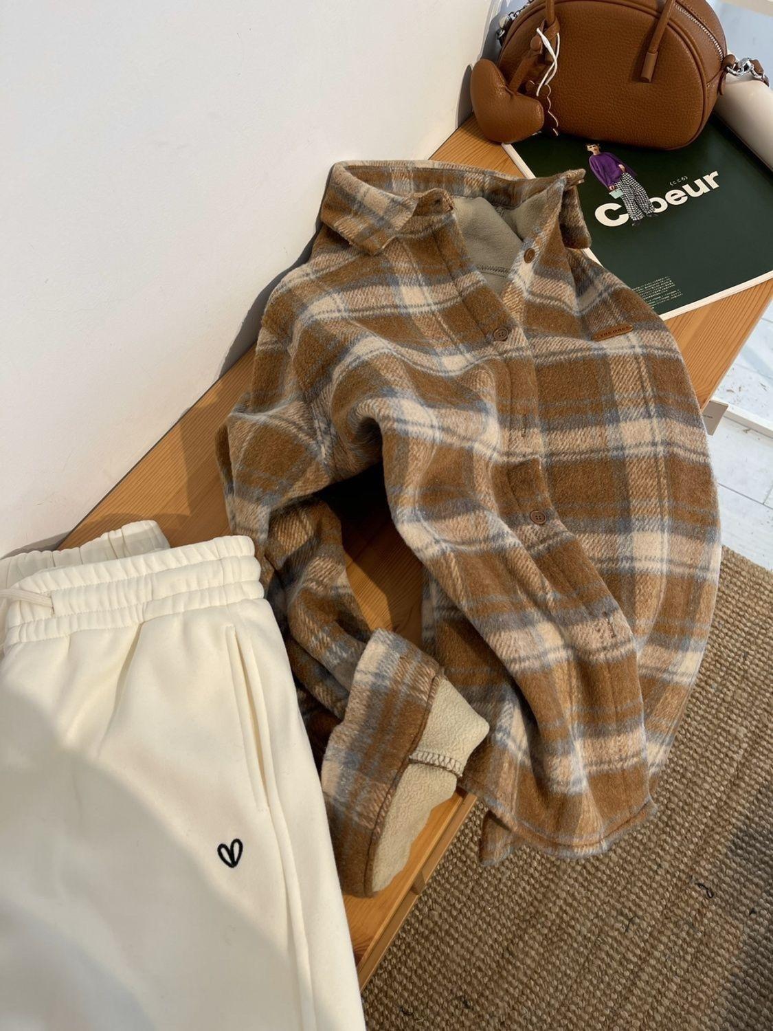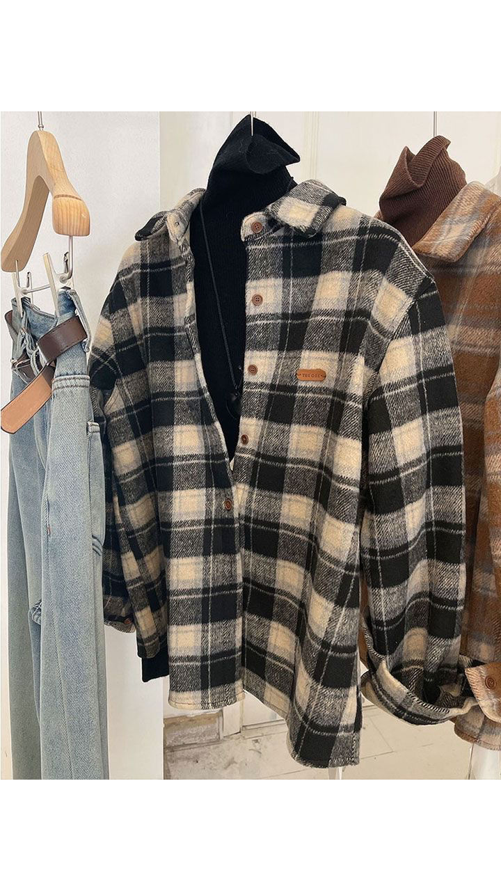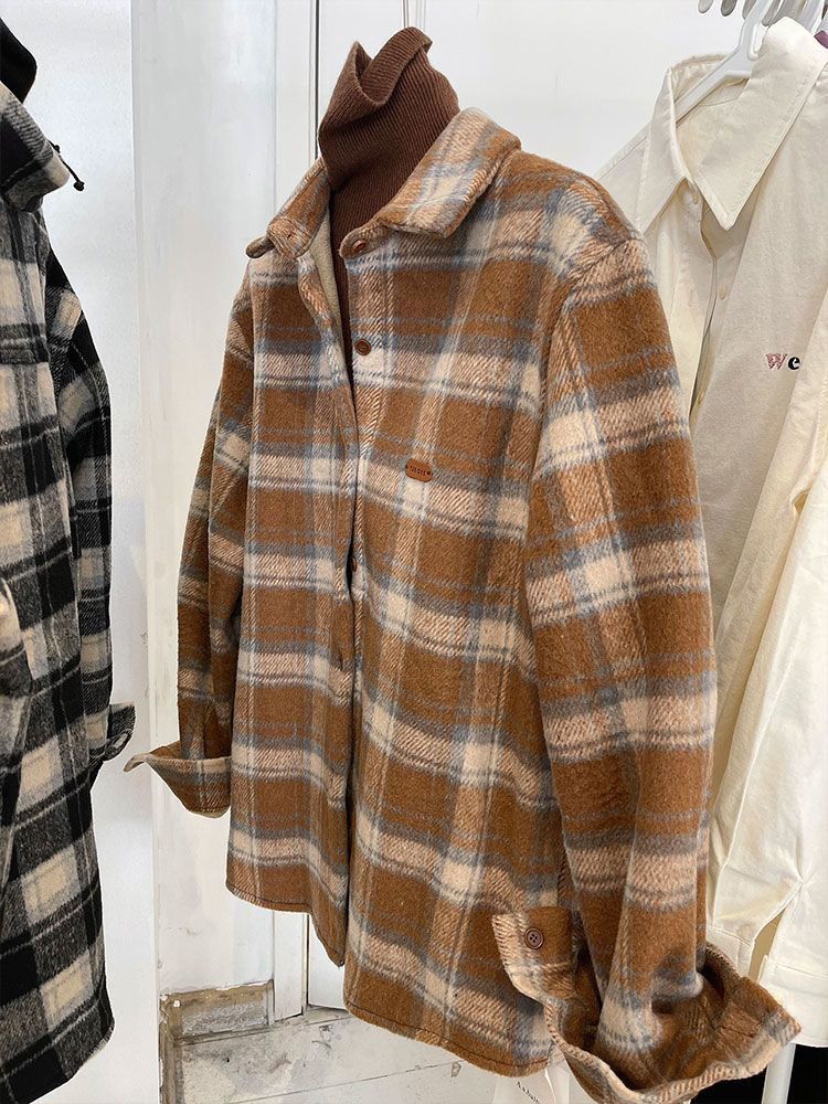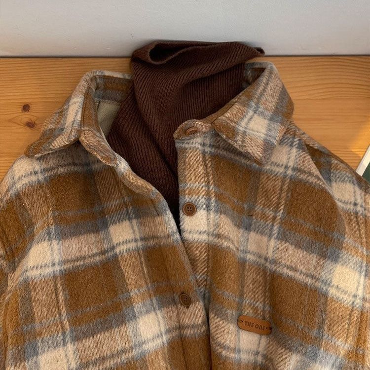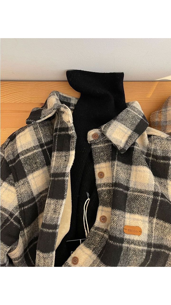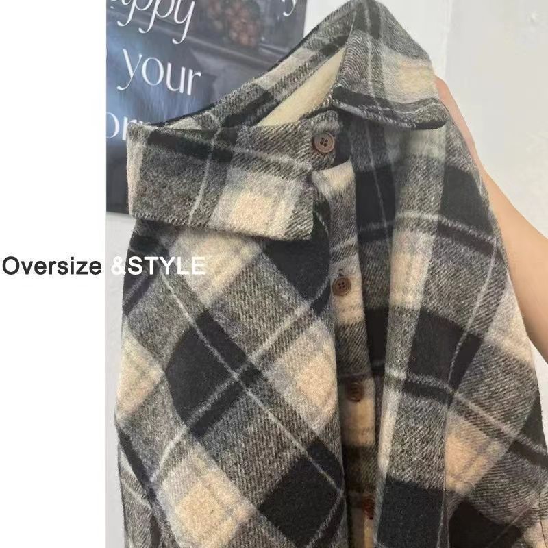 Черная рубашка в клетку с контрастными цветами для женщин, винтажная ткань с эффектом потертости, для зимнего многослойного образа, свободный крой, в стиле куртки, на флисовой подкладке и утепленная.