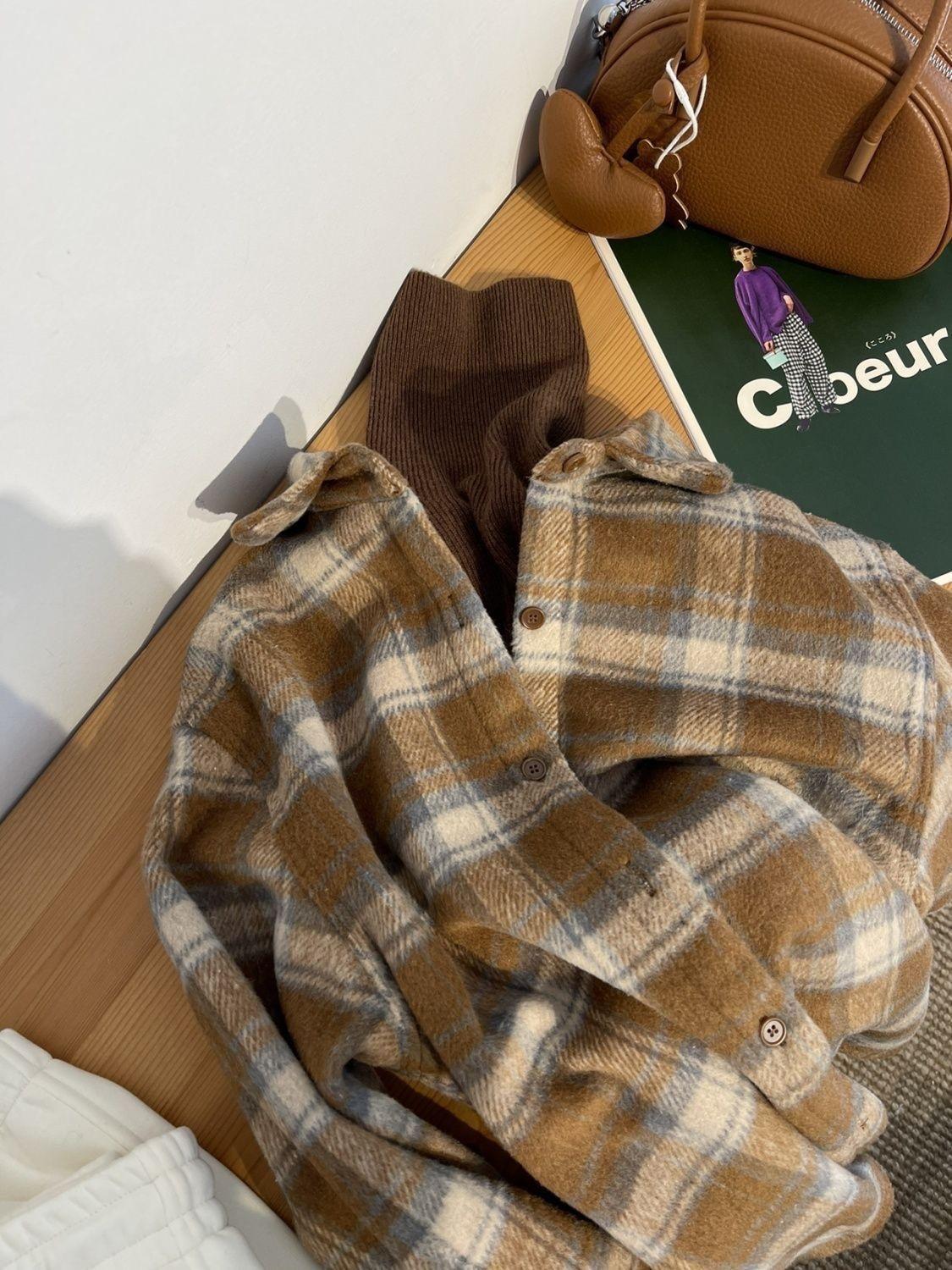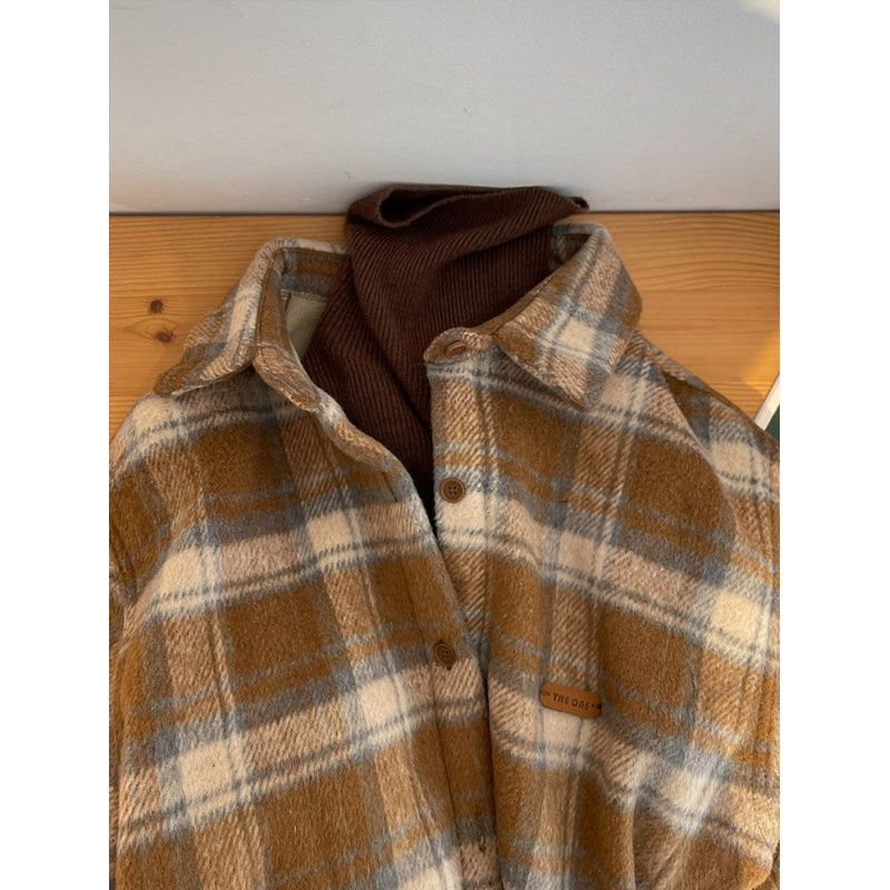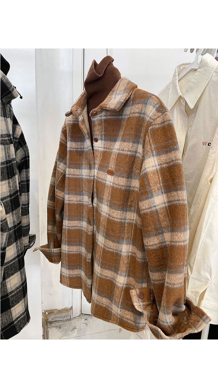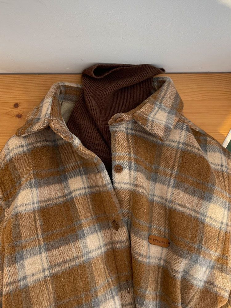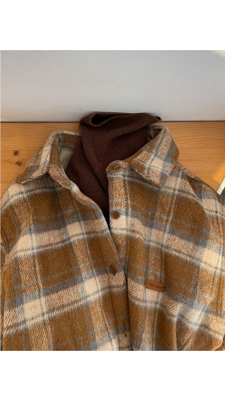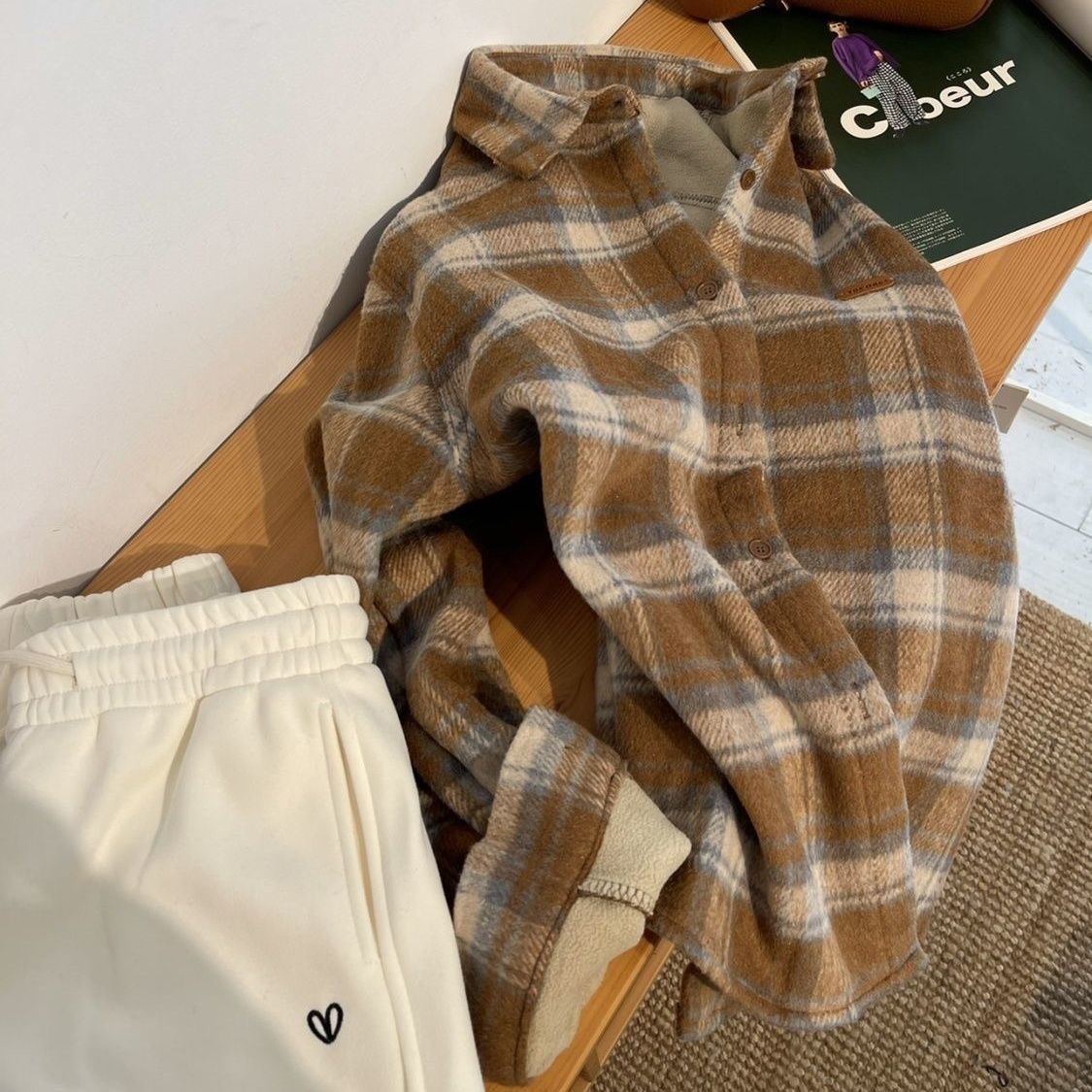Черная рубашка в клетку с контрастными цветами для женщин, винтажная ткань с эффектом потертости, для зимнего многослойного образа, свободный крой, в стиле куртки, на флисовой подкладке и утепленная.