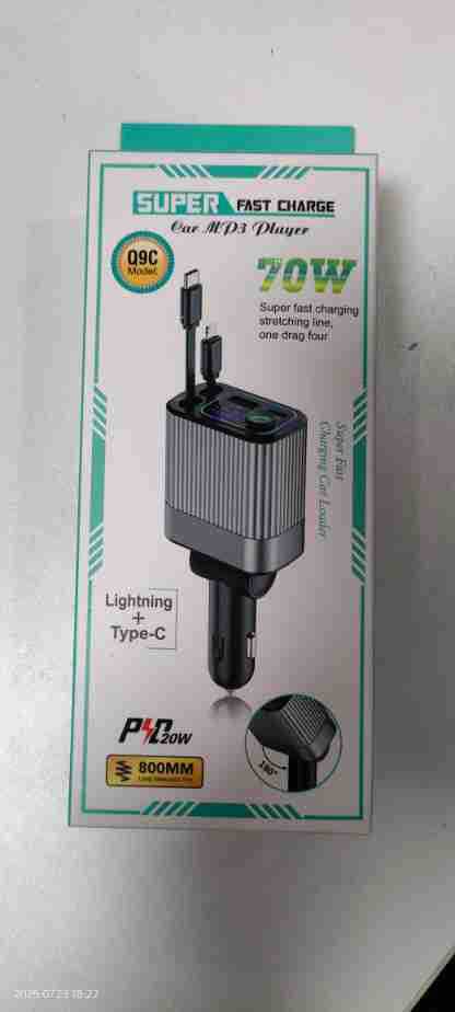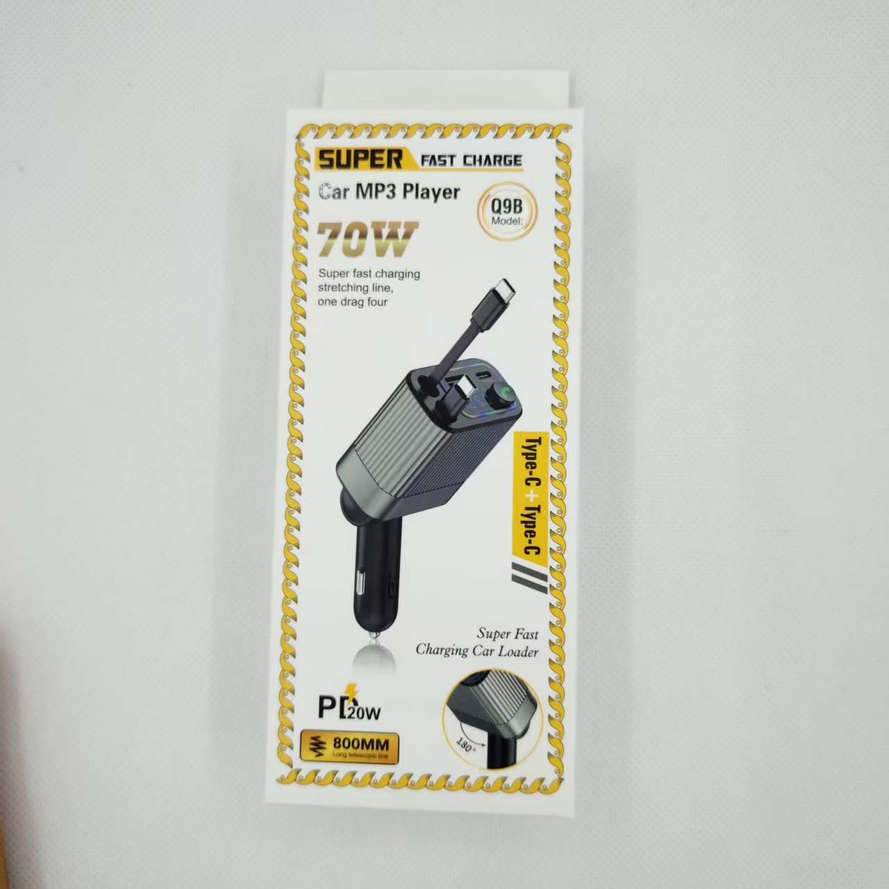 Q9B车充70W,机子尺寸15*5.5*3.5cm,机子重量114g,带彩盒重量136g。卷缩线总长80cm有效长度约65cm,彩盒长度算挂钩19*7*4cm,箱规41*35*37.5CM,100个/箱,毛重14.5kg.
