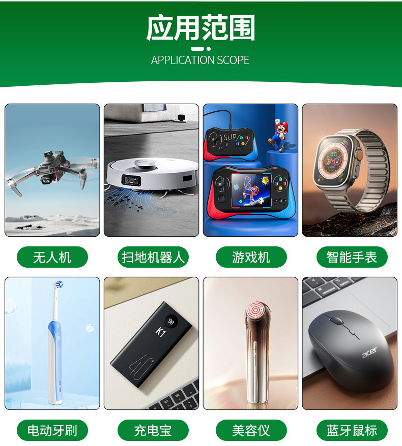 грелка для рук; соковыжималка; электронная книга; Bluetooth-гарнитура; Массажер; клавиатура; Ручка для чтения; Машина раннего образования; портативный динамик; аварийное освещение; Цифровая фоторамка; мобильный источник питания; беспроводная клавиатура; игровая консоль; лазерная указка; кемпинговый свет; мобильный динамик; светодиодное освещение; Нагревательные перчатки; Инструмент для чистки лица; средство для удаления морщин; Умный динамик; электронный навигатор; дрон; Сканерный пистолет; Радиочастотный косметический инструмент; умный браслет; носимые устройства; вешалка для вентилятора; Аккумулятор видеодомофона; Электронное устройство для омоложения кожи.; инструмент красоты