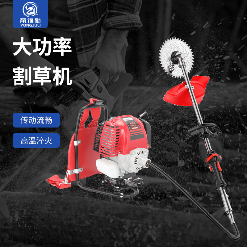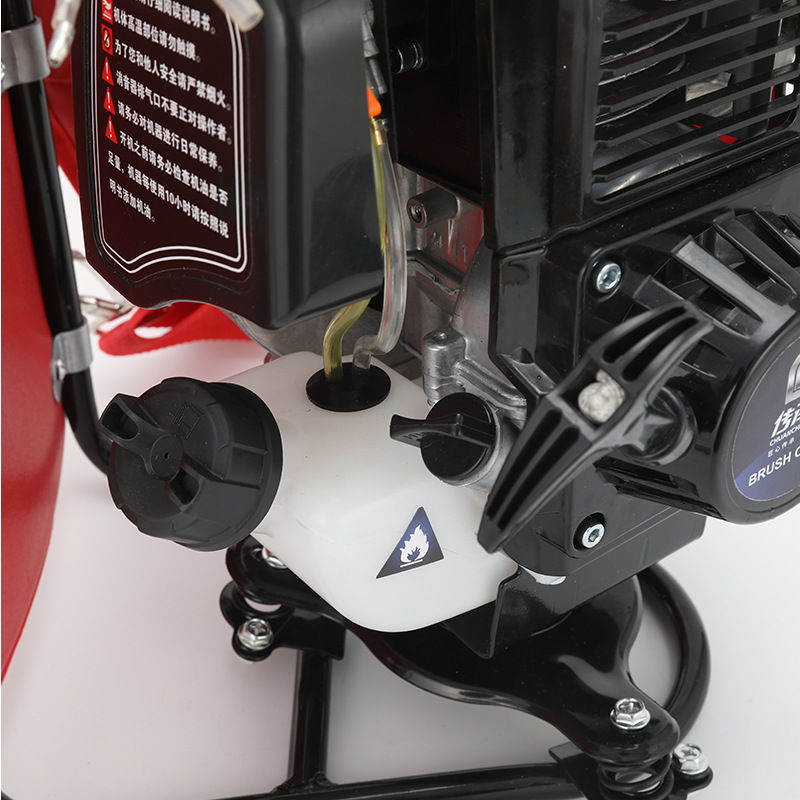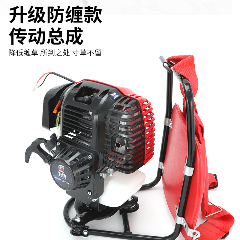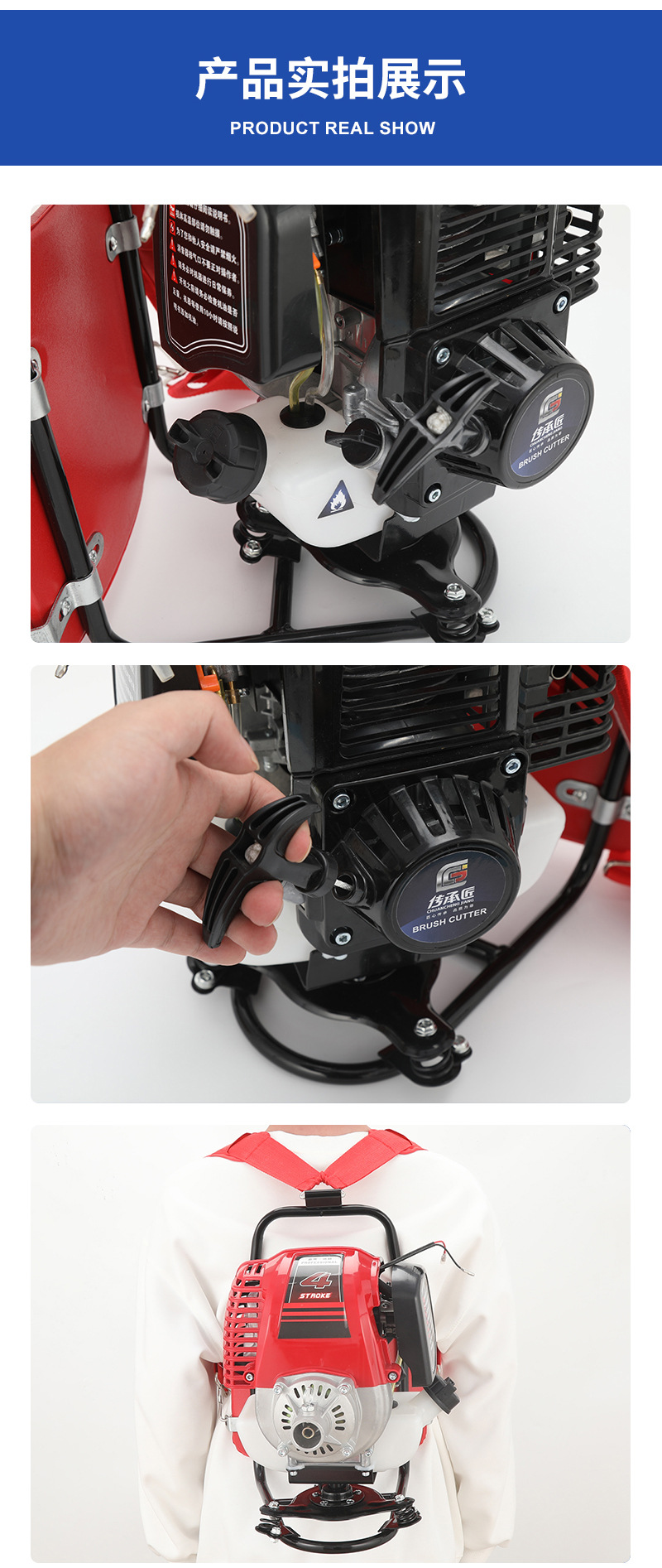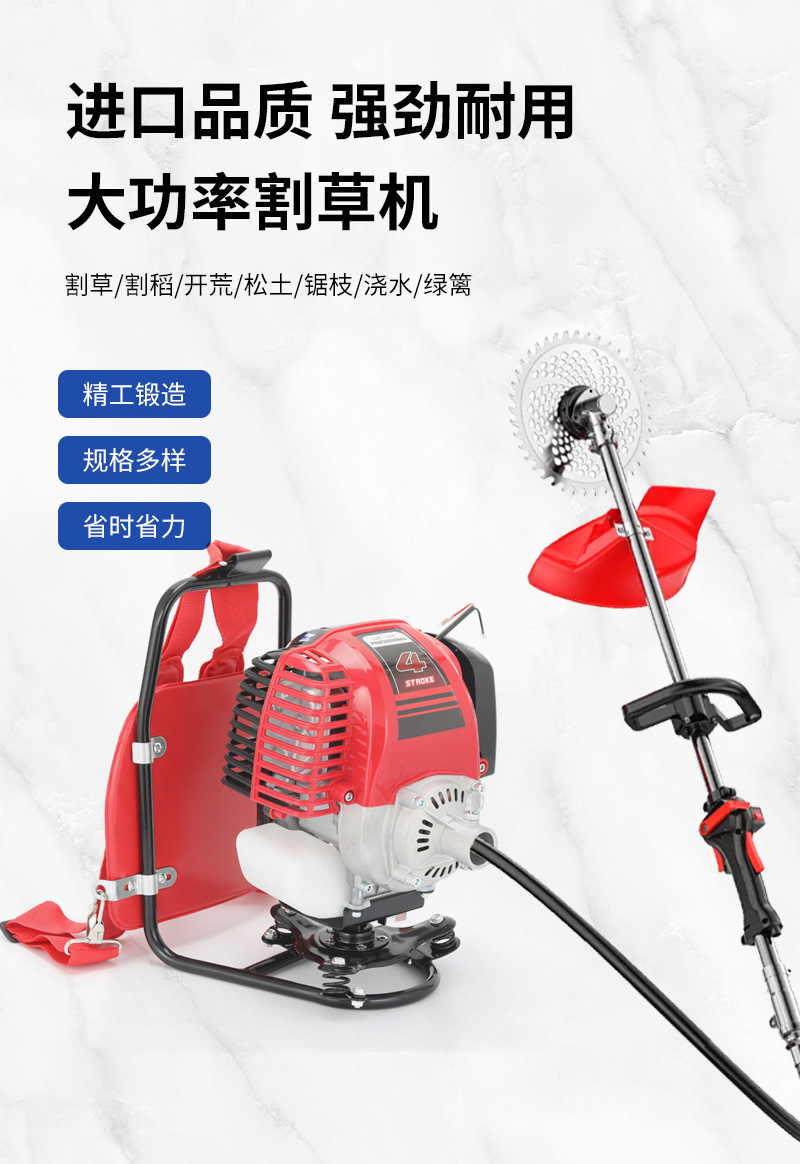 В наличии 4-тактная боковая газонокосилка с ранцевым креплением, небольшой бытовой триммер для травы, кусторез для уборки сельскохозяйственных культур.