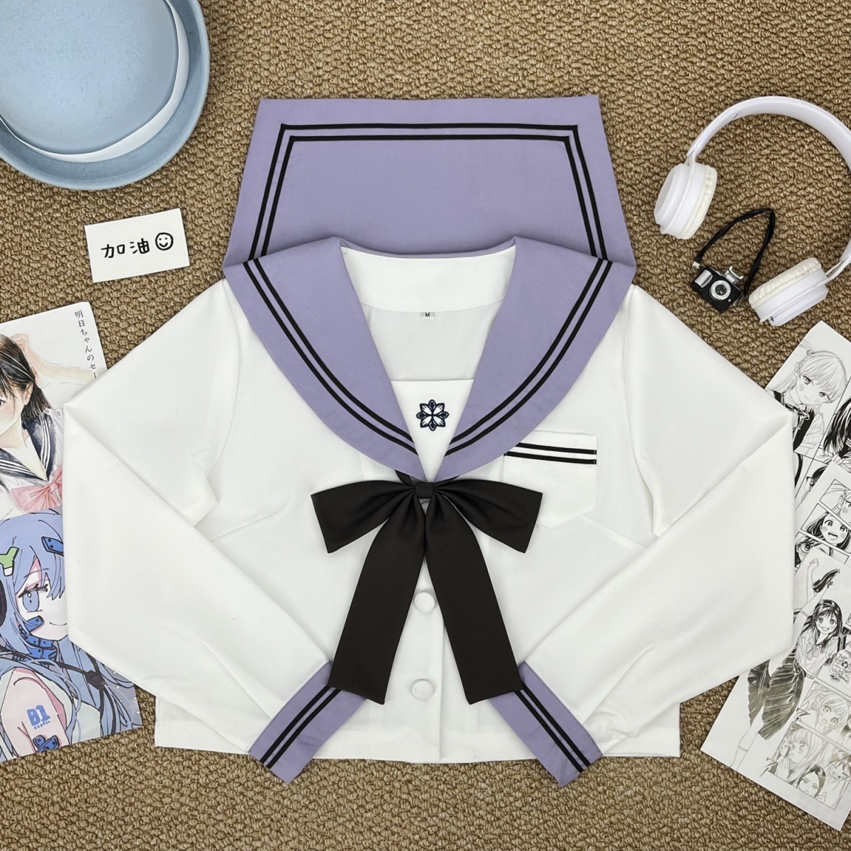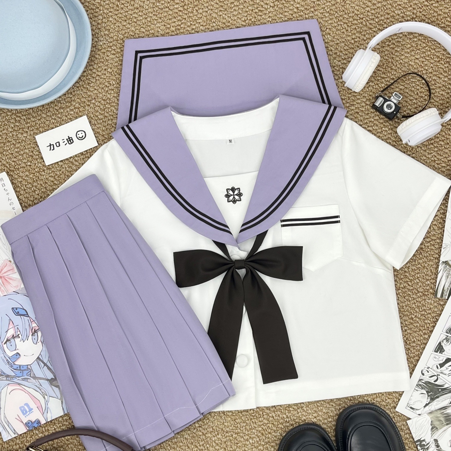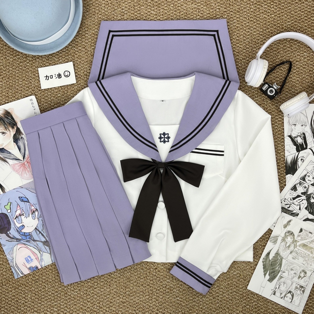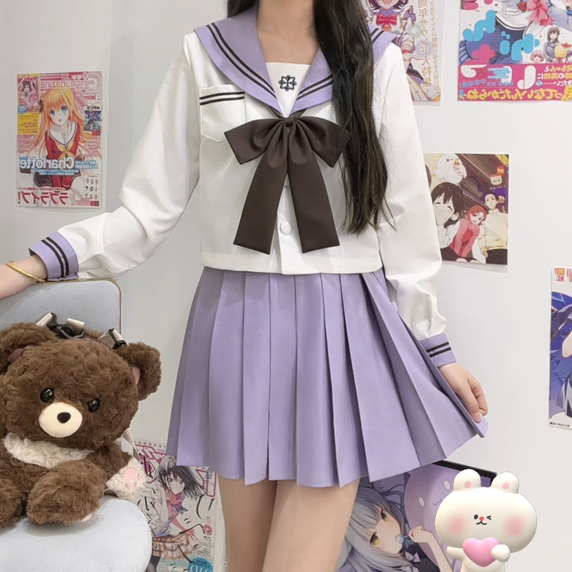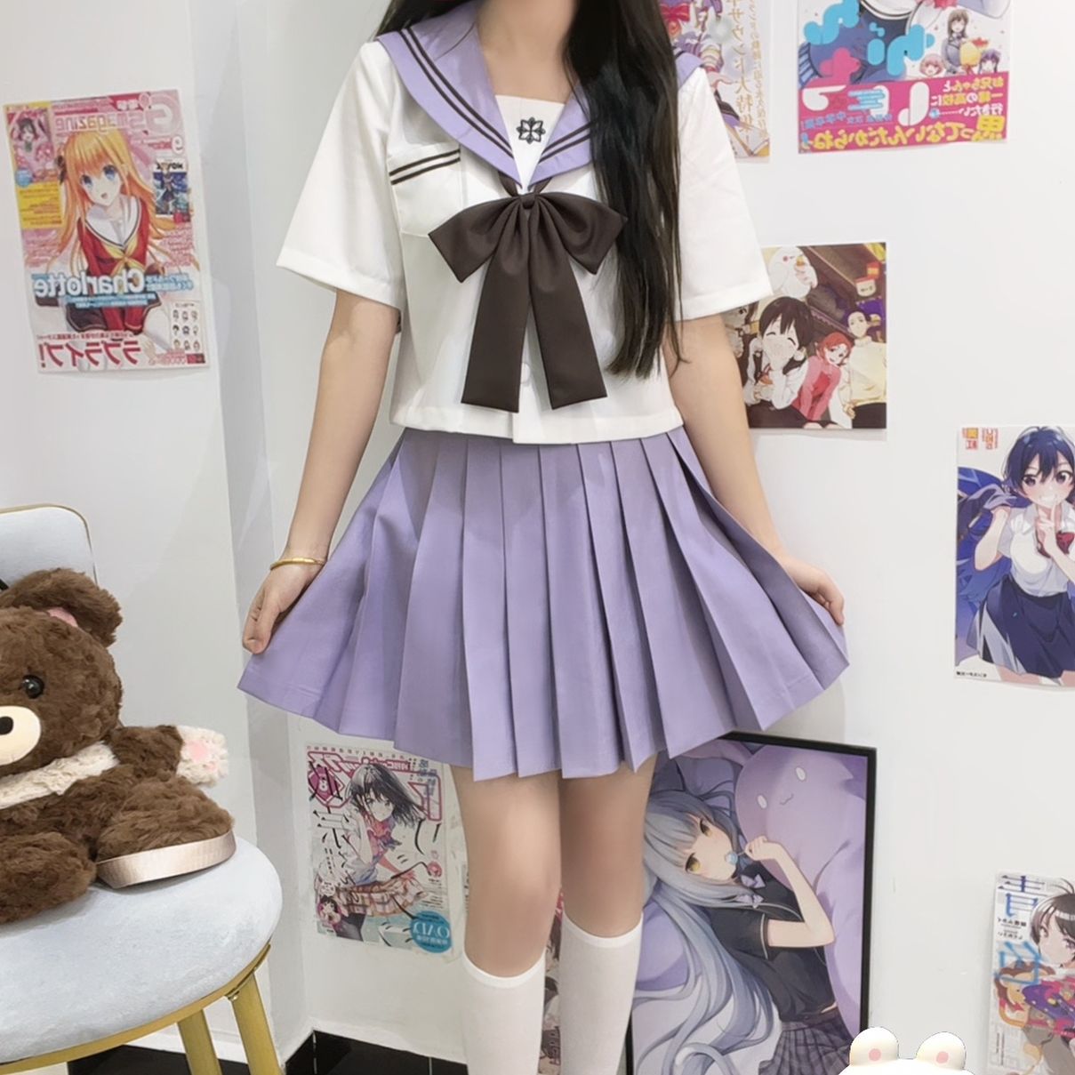 Фиолетовая Сакура Чика с длинными рукавами + коричневый галстук-бабочка с длинной ручкой + юбка в тон; Фиолетовая Сакура Чика с короткими рукавами + коричневый галстук-бабочка с длинной ручкой + юбка в тон; Фиолетовый Сакура Чика с длинными рукавами + коричневый галстук-бабочка с длинной ручкой; Фиолетовый Сакура Чика с короткими рукавами + коричневый галстук-бабочка с длинной ручкой; Фиолетовая юбка Сакура Чика + носки